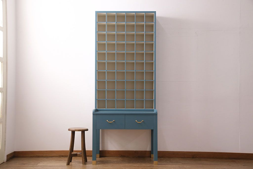 オープンラック・シェルフ> ディスプレイラック > ハンカチ什器を新規製作!脚先装飾・取っ手は真鍮製を使用。本体をターコイズブルー、棚内をアンティークホワイトでペイント仕上げ。(収納棚、キャビネット、オープンラック)
