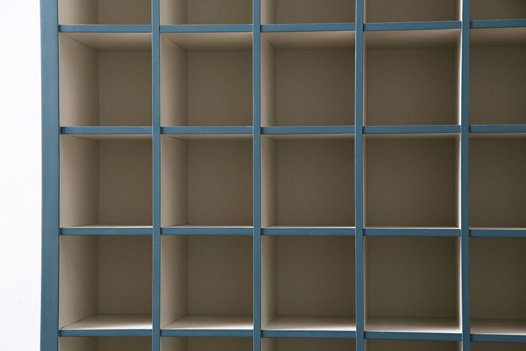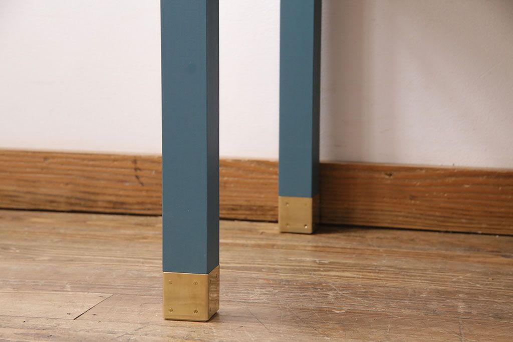 フルオーダー家具実績 > ハンカチ什器を新規製作!脚先装飾・取っ手は真鍮製を使用。本体をターコイズブルー、棚内をアンティークホワイトでペイント仕上げ。(収納棚、キャビネット、オープンラック)