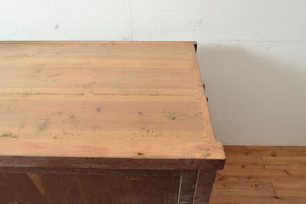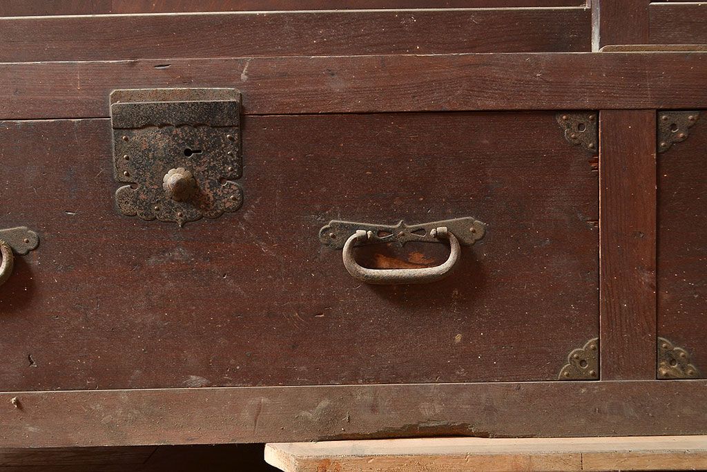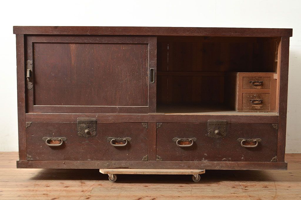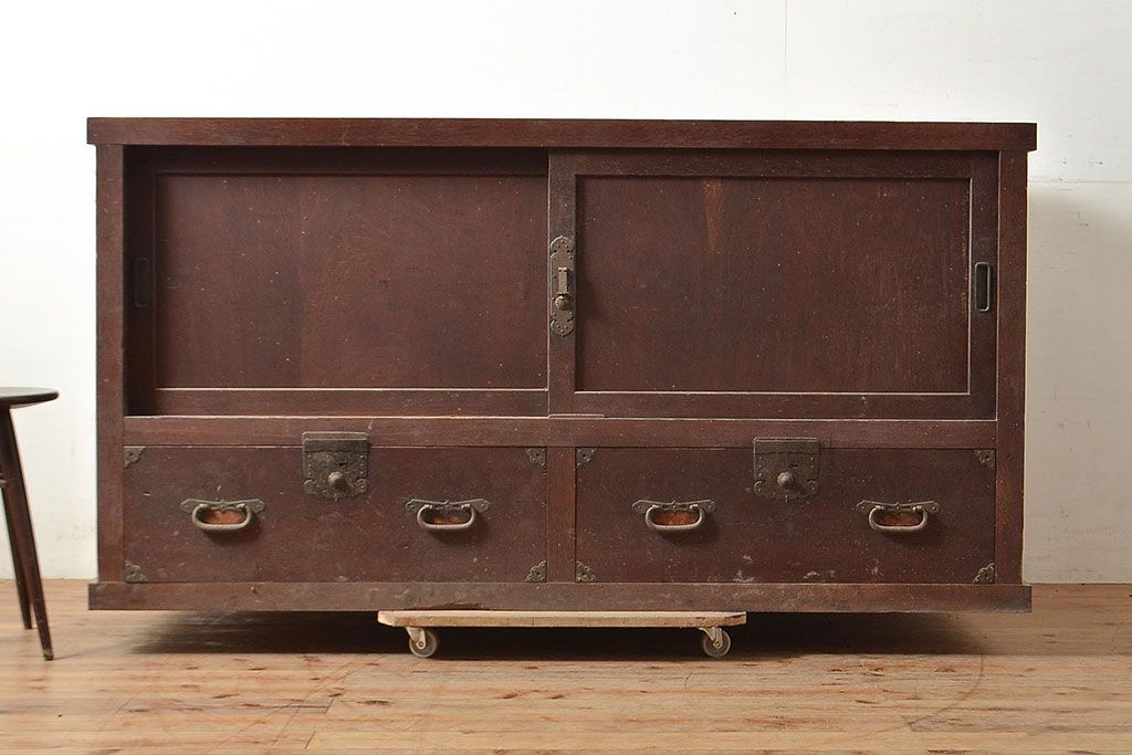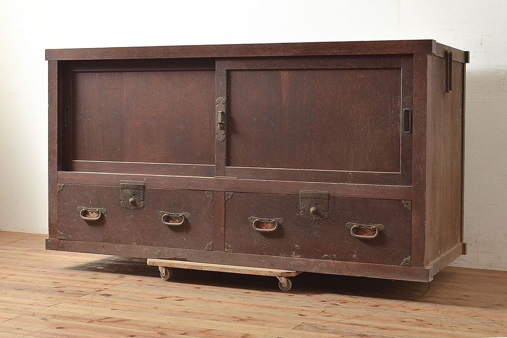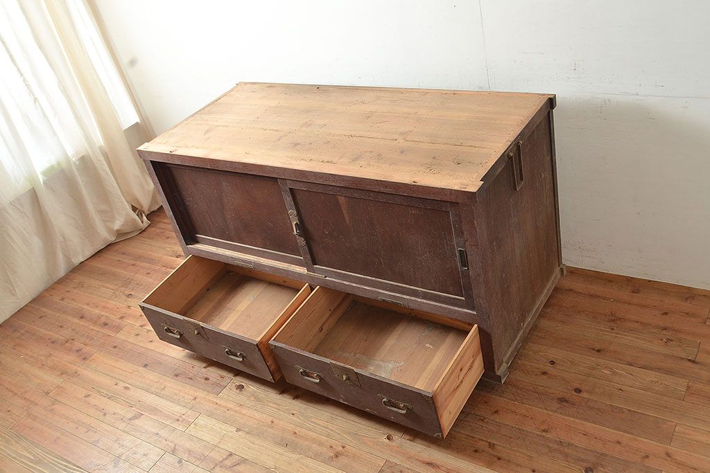 ラフジュ工房> キャビネット・戸棚> テレビ台・ローボード > 和製アンティーク 前面ヒノキ材 明治・大正期の水屋箪笥ローボード(収納箪笥、収納棚、戸棚)(R-048593)