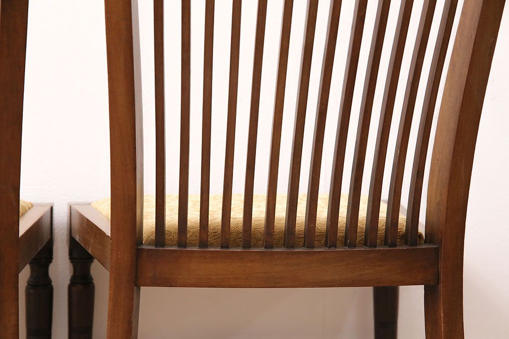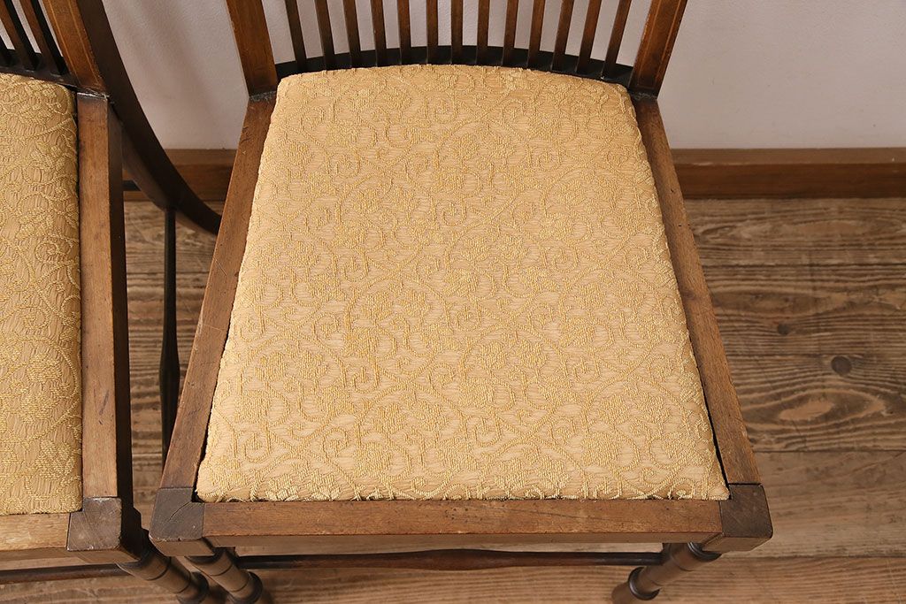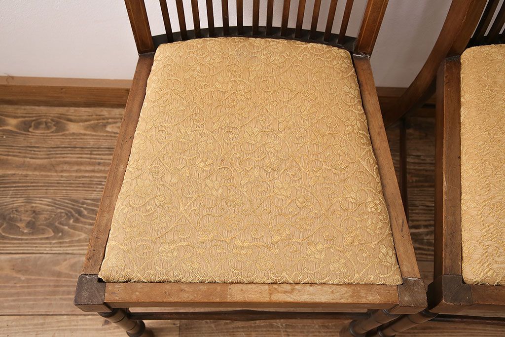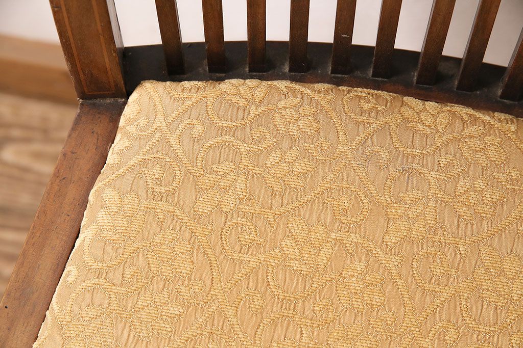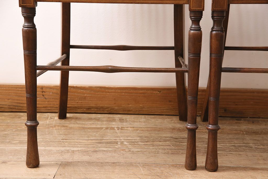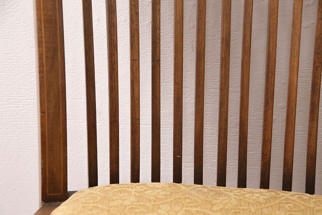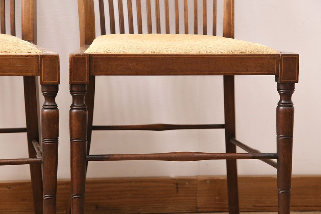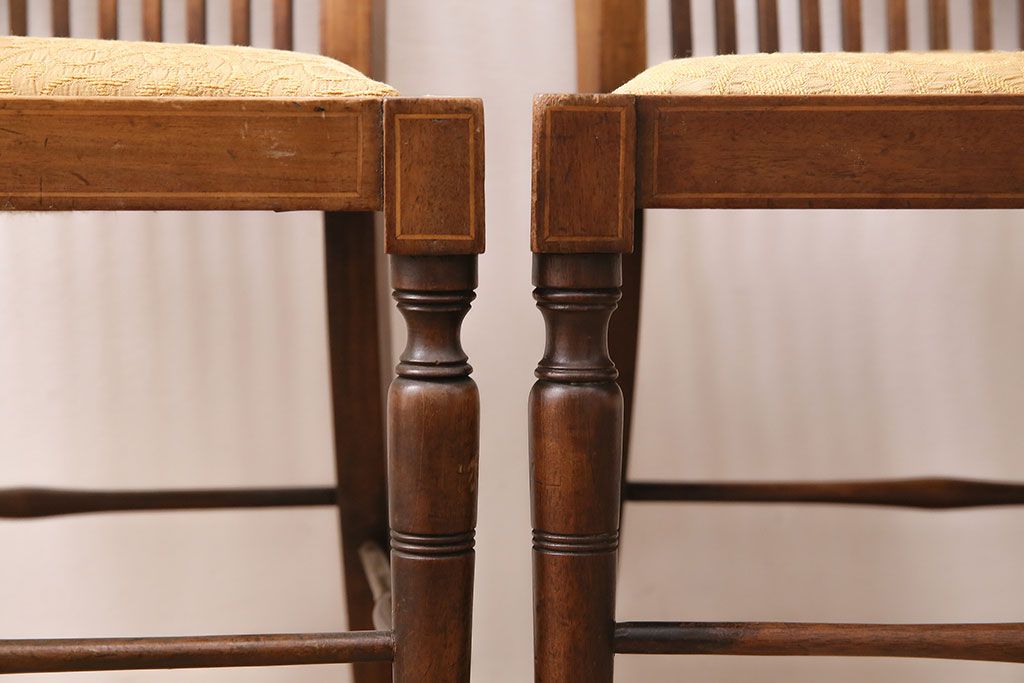 状態が気になる方には現状販売はおすすめできませんので、慎重なご検討をお願いいたします。フランスアンティーク 上手物! マホガニー材 象嵌入りの珍しいデザインのチェア2脚セット(ダイニングチェア)(R-048098)です。
