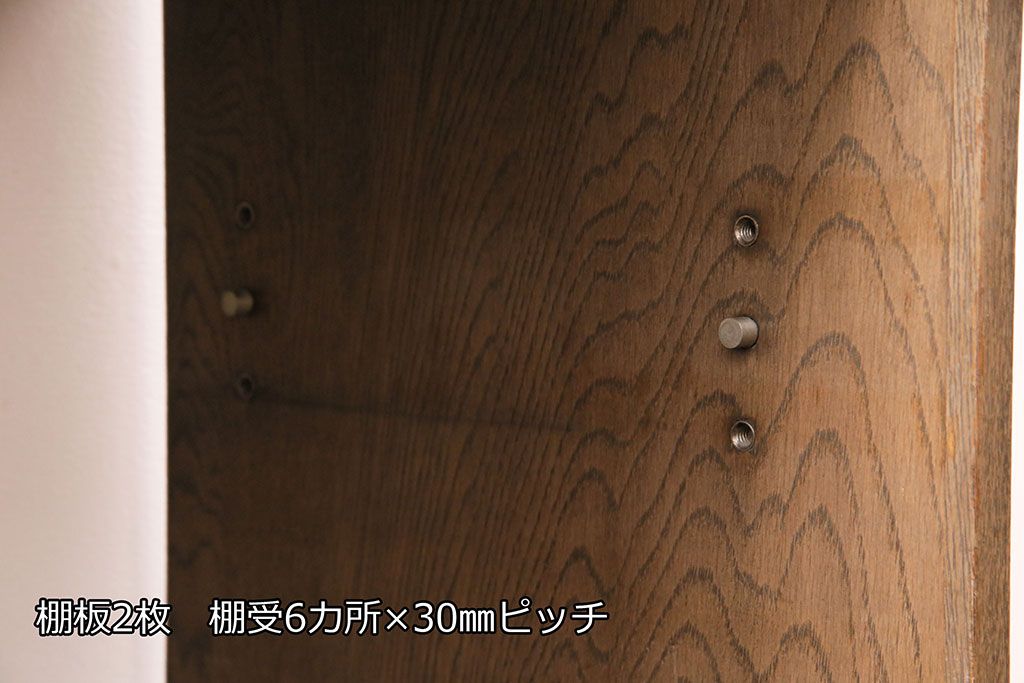 棚板は取り外しできます。棚板は2枚あります。棚受けは6ヶ所、30mmピッチで調整できま