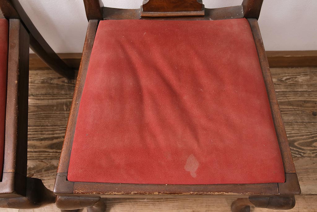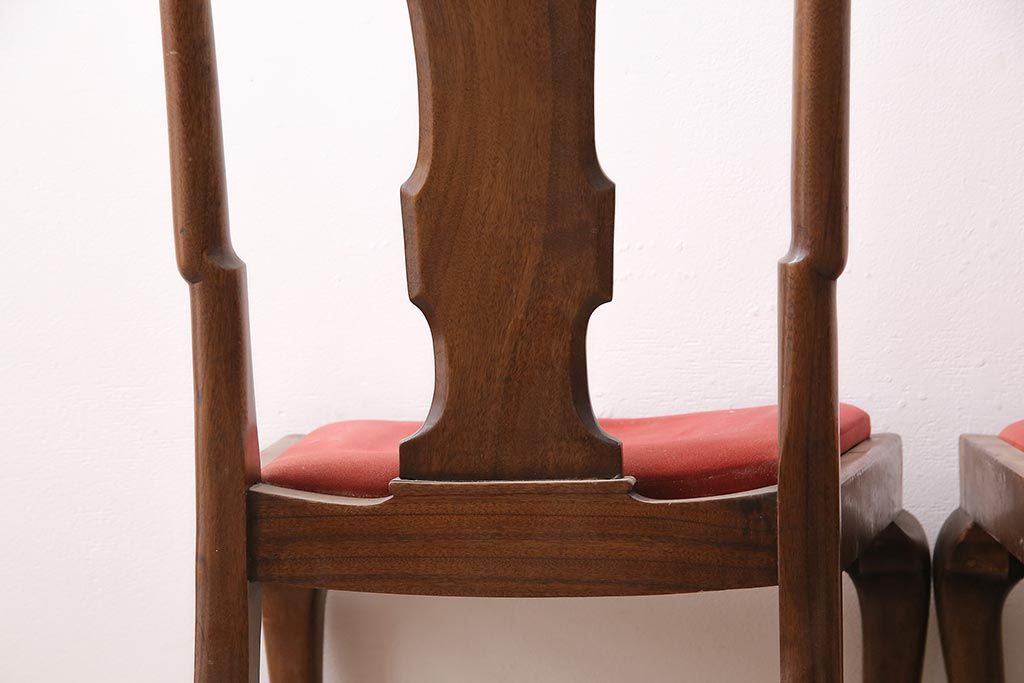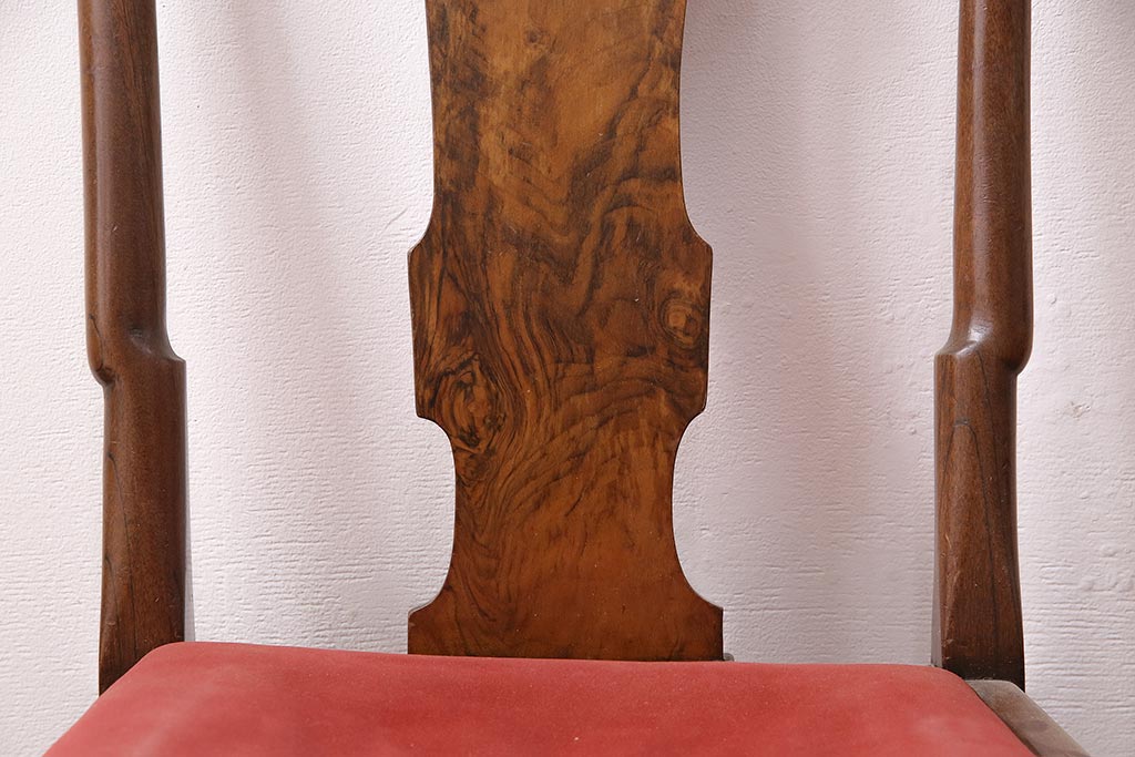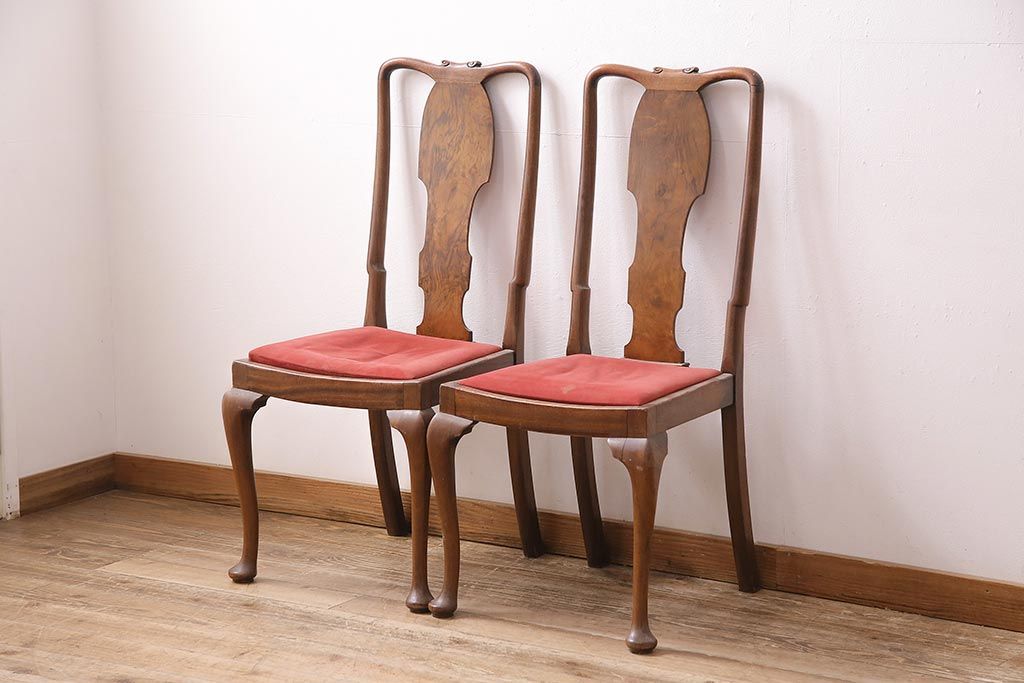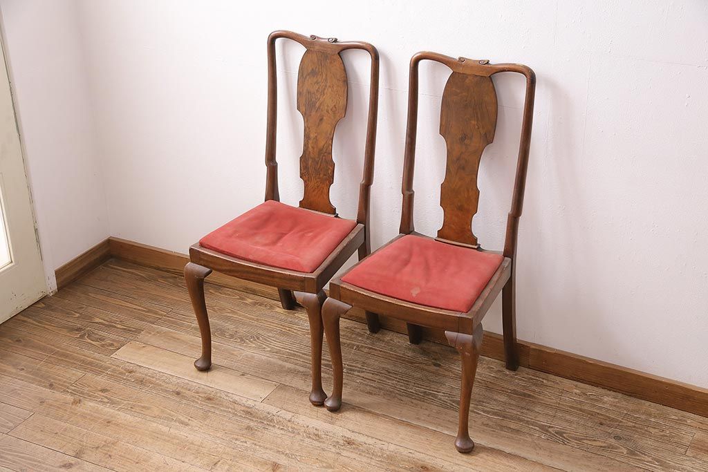 状態が気になる方には現状販売はおすすめできませんので、慎重なご検討をお願いいたします。イギリスアンティーク ウォールナット材 美しいバーズアイの杢目が楽しめるチェア2脚セット(ダイニングチェア、椅子)(R-048454)です。