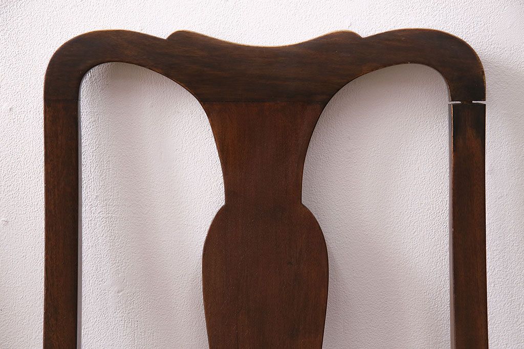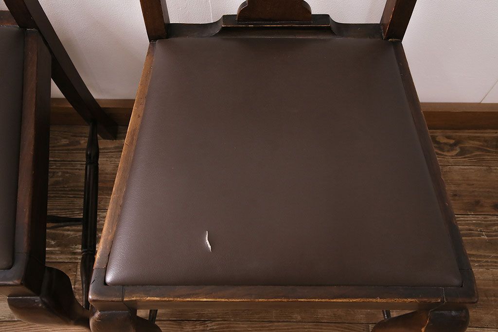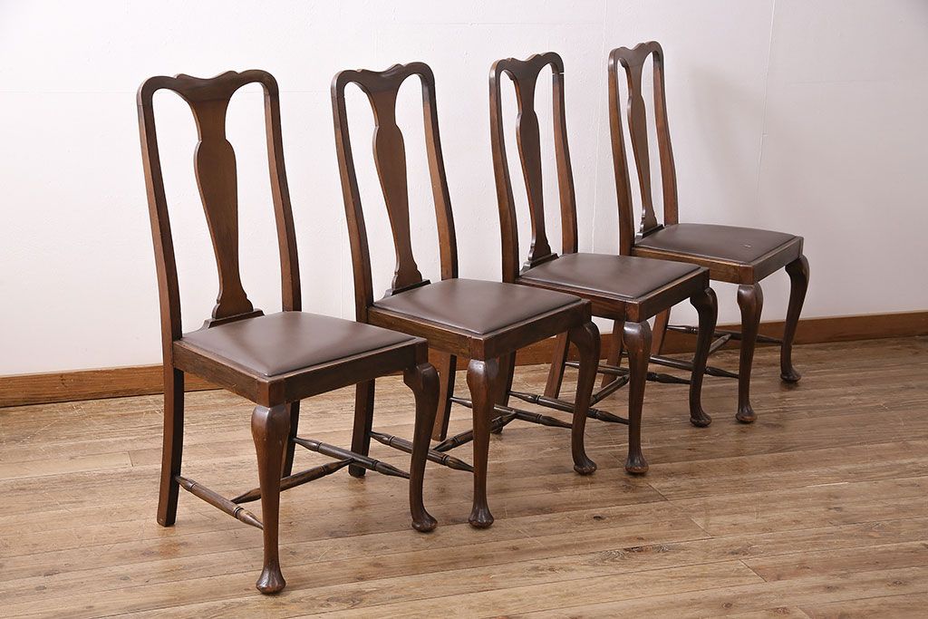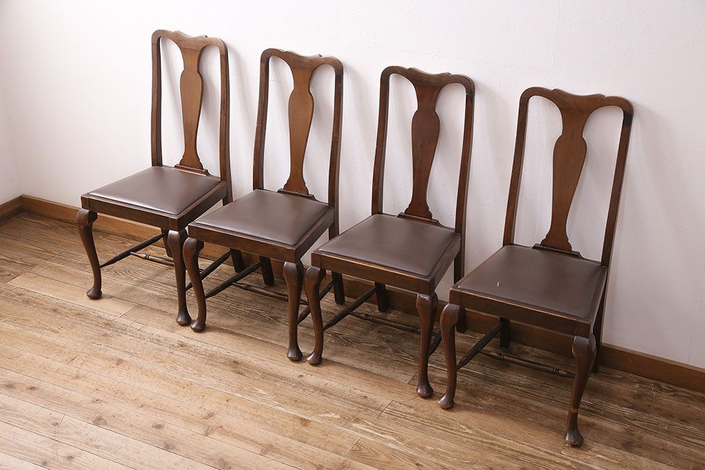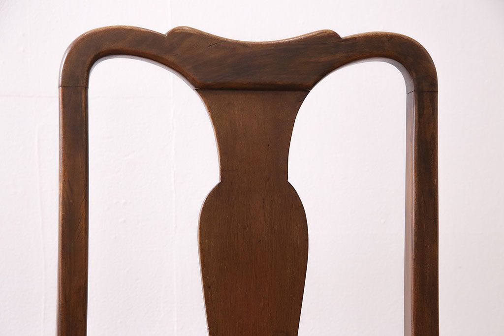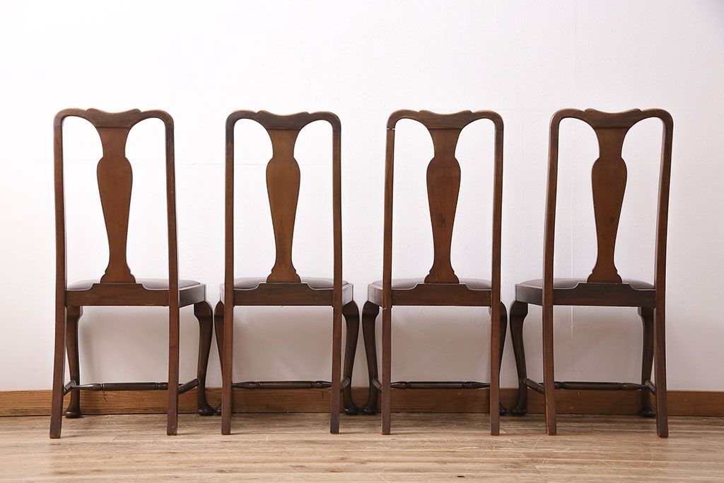 状態が気になる方には現状販売はおすすめできませんので、慎重なご検討をお願いいたします。イギリスアンティーク ウォールナット材 優美な雰囲気のクイーンアンチェア4脚セット(ダイニングチェア、椅子、バラ売り可能)(R-048392)です。