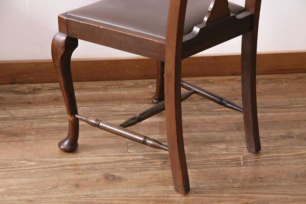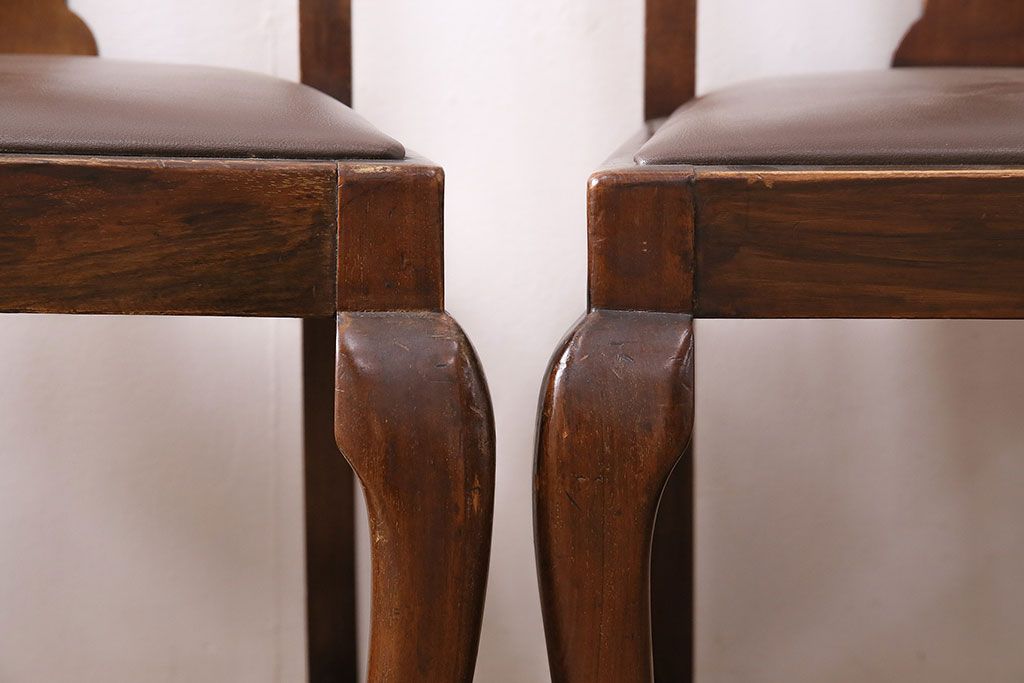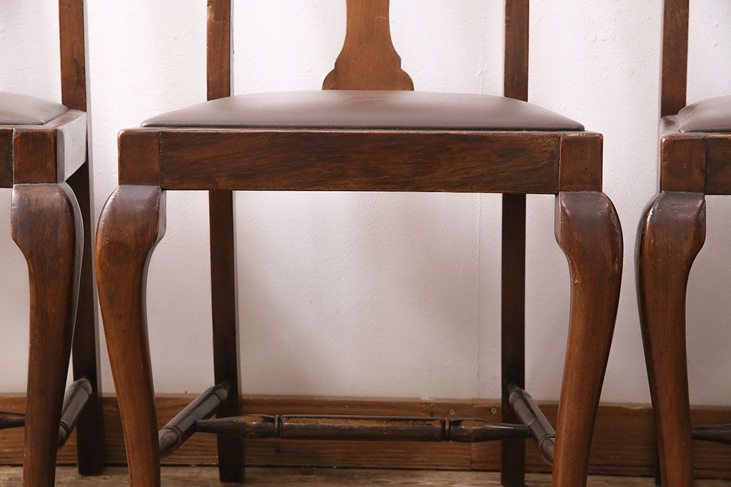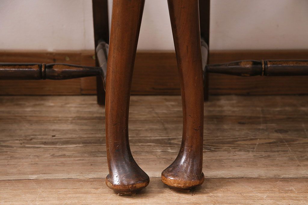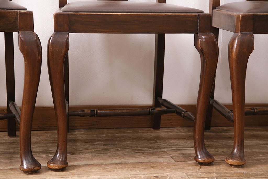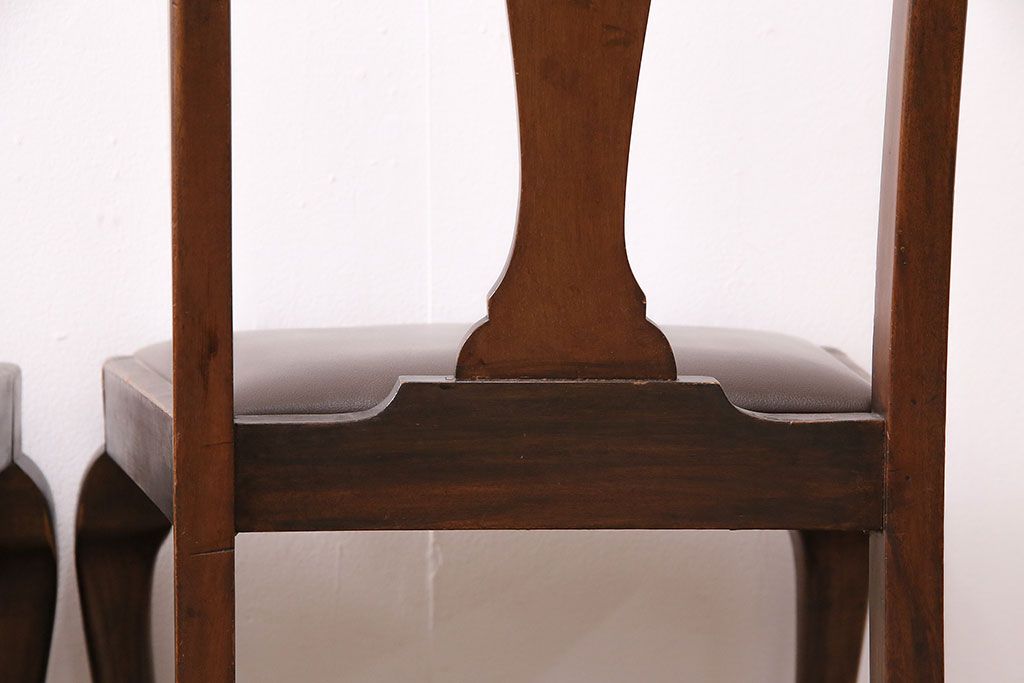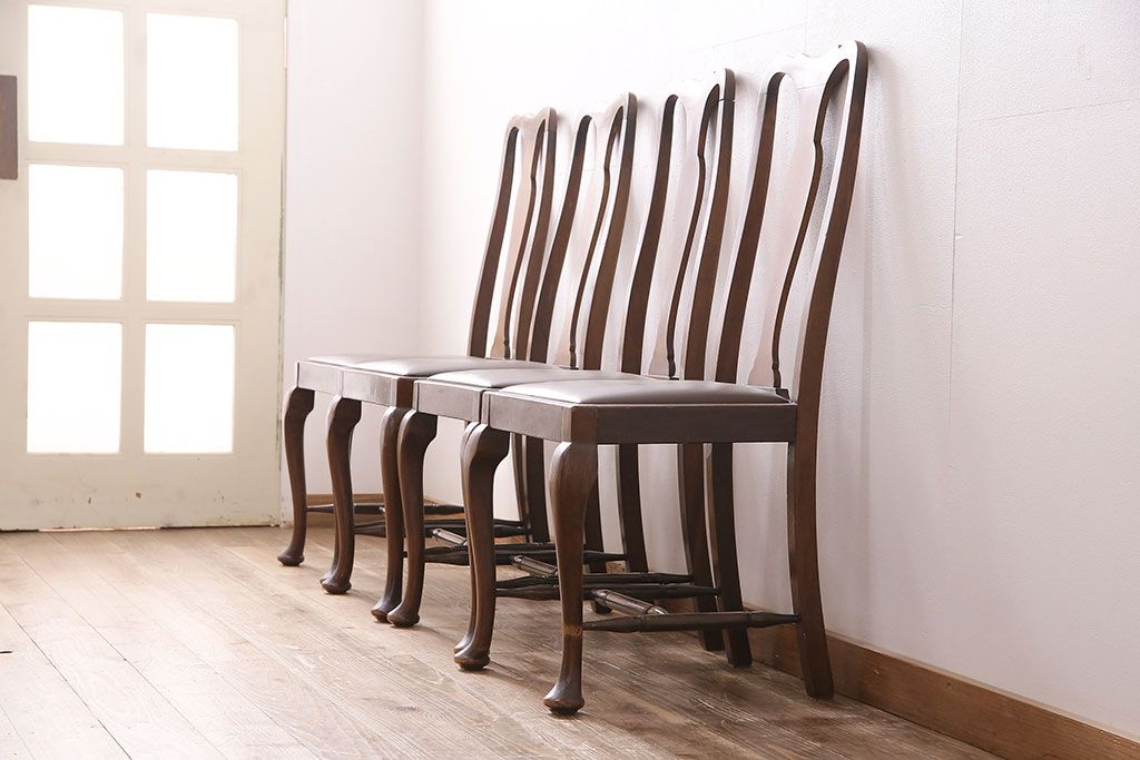 状態が気になる方には現状販売はおすすめできませんので、慎重なご検討をお願いいたします。イギリスアンティーク ウォールナット材 優美な雰囲気のクイーンアンチェア4脚セット(ダイニングチェア、椅子、バラ売り可能)(R-048392)です。