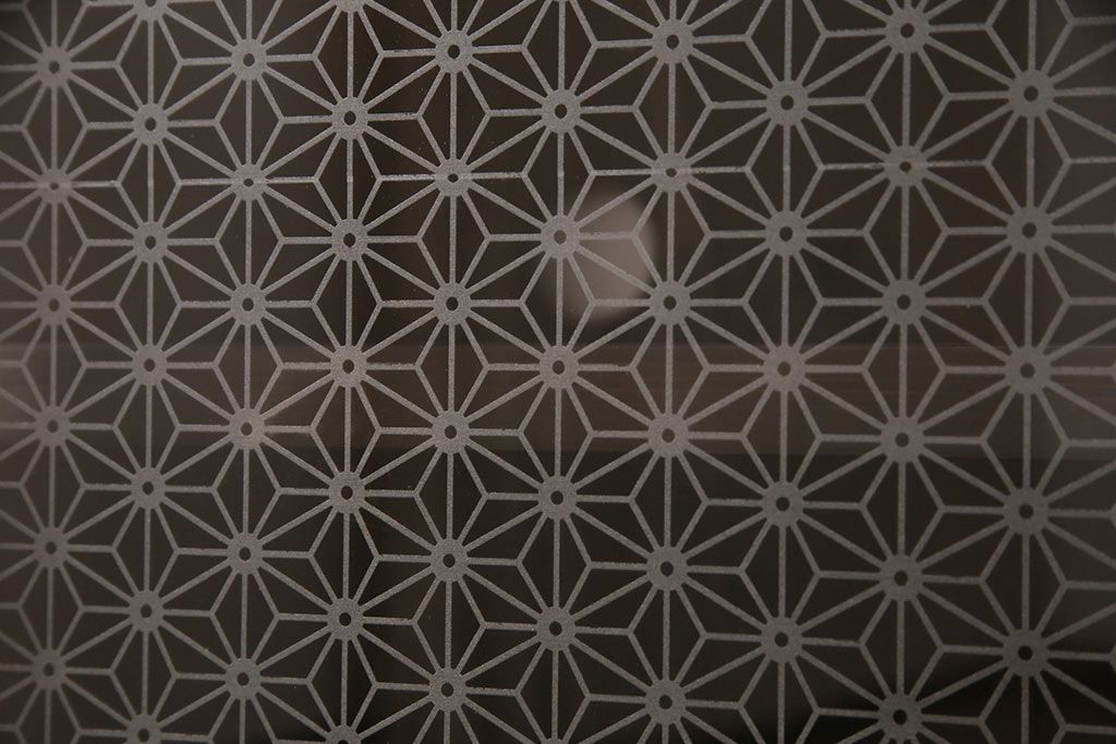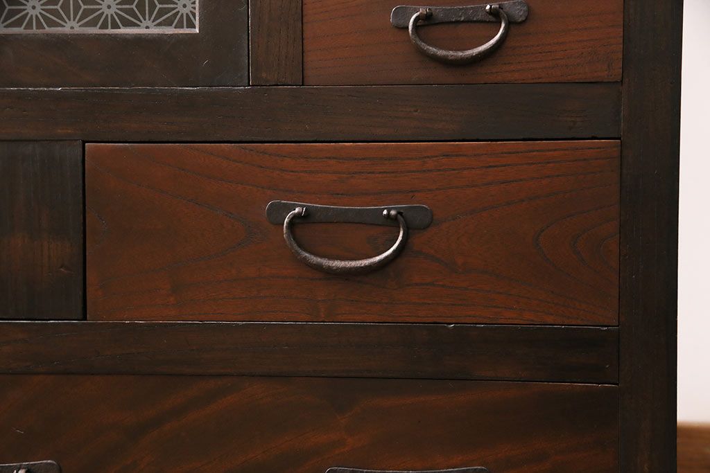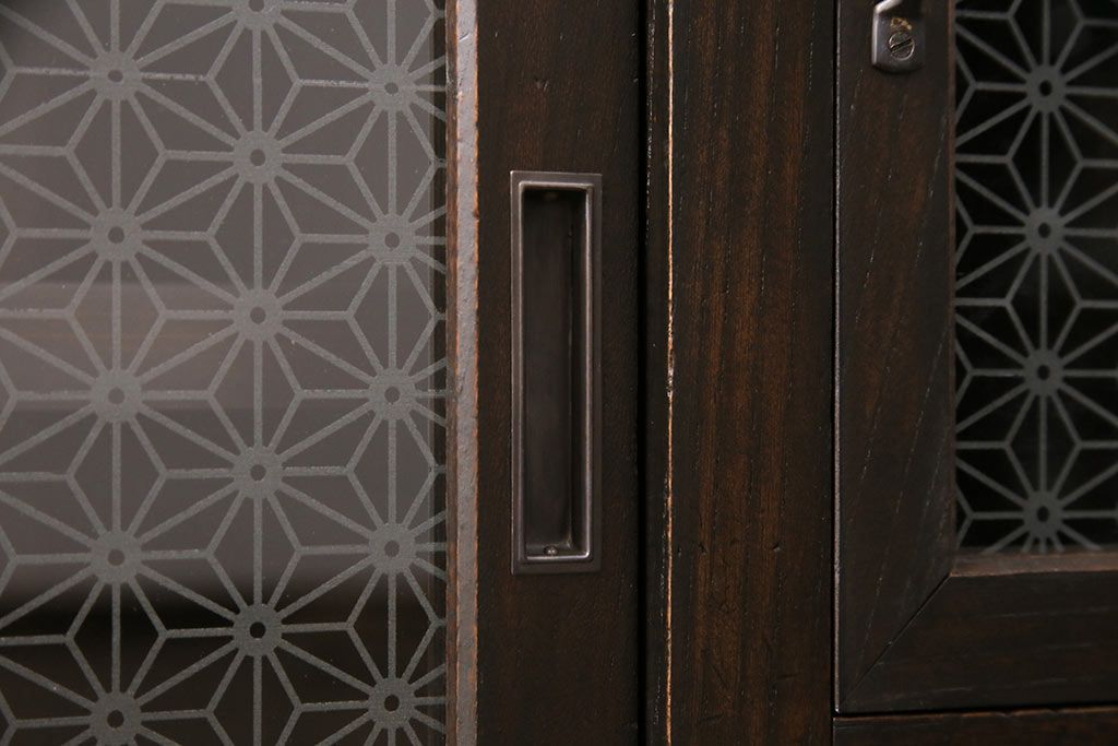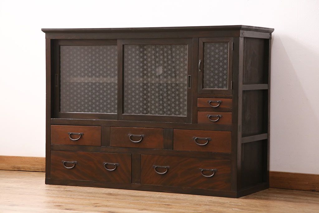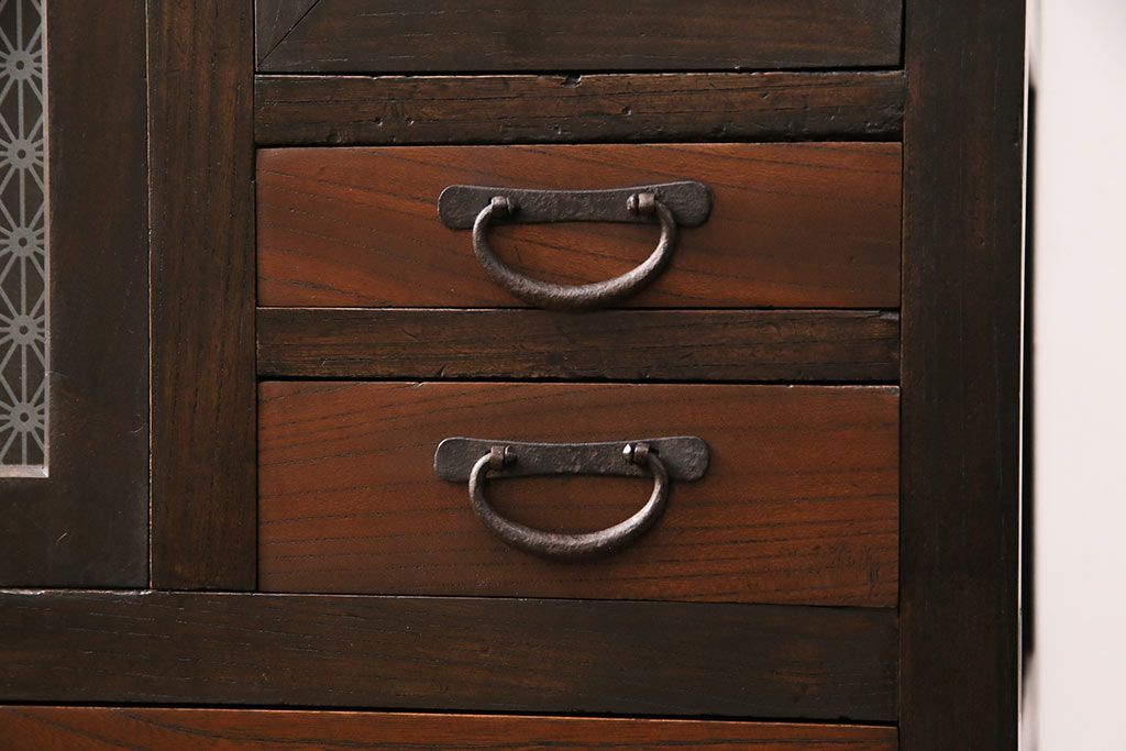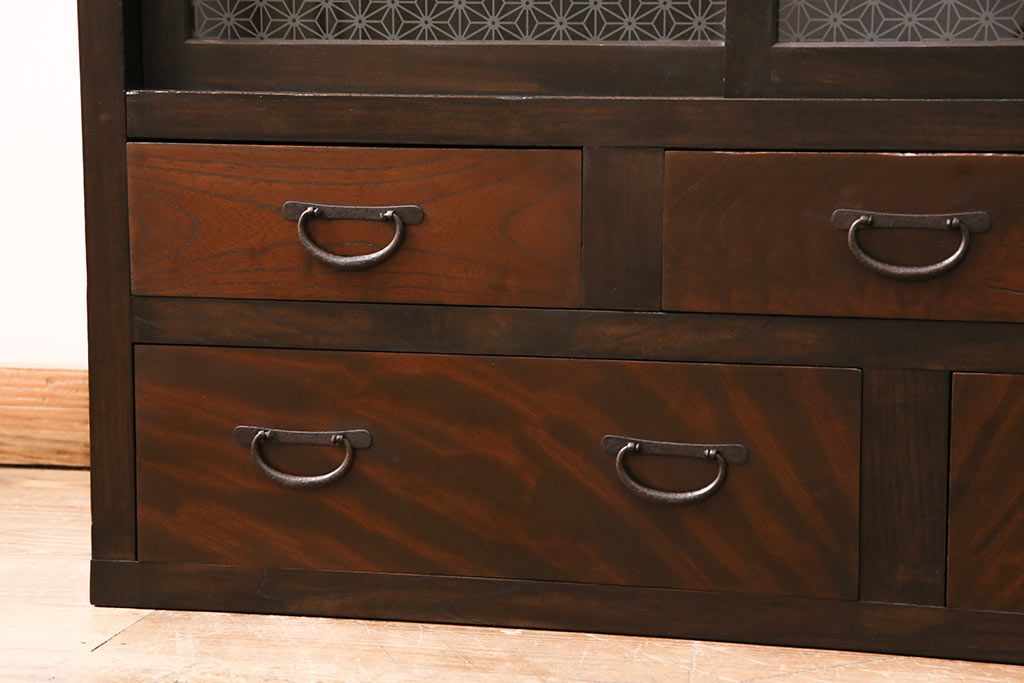 ラフジュ工房> 和箪笥> 水屋箪笥 > 大正期の関東水屋箪笥をリペア&カスタム!左上戸内に棚板を追加し、背面穴開け加工。ヒノキ無垢材の天板を取り付け。板戸を麻の葉模様ガラスに入れ替え。本体は濃い茶色、引き出し前板は明るめの茶色に着色し仕上げ。(収納棚、戸棚、食器棚)