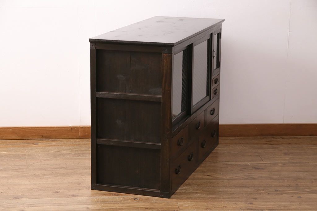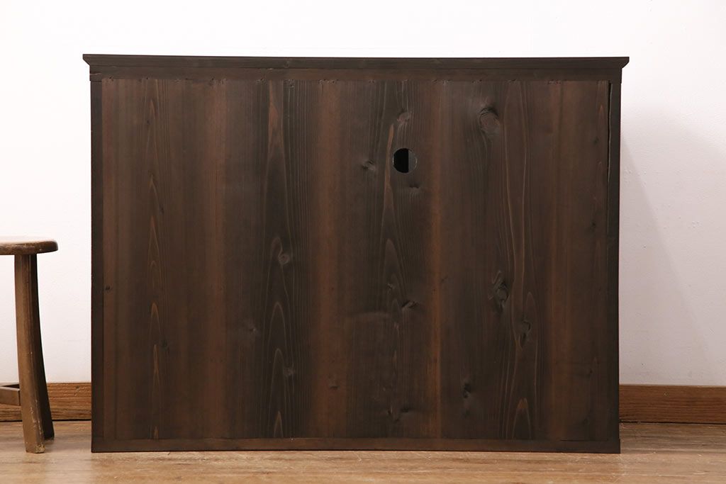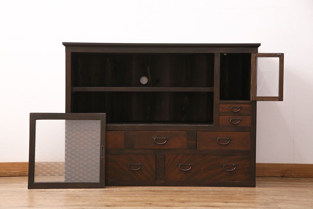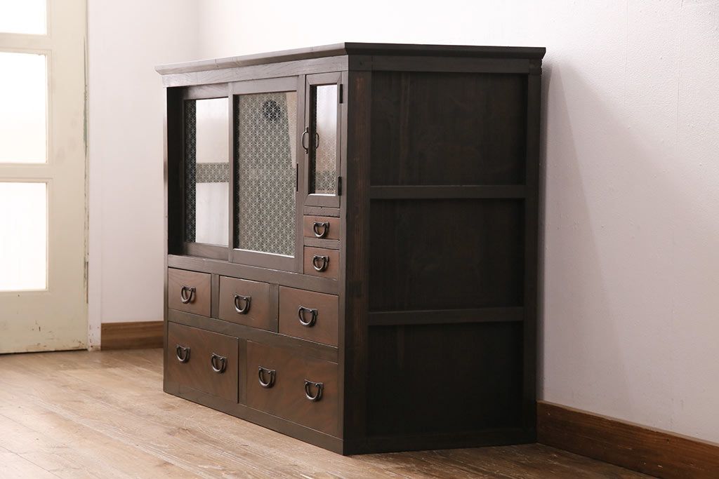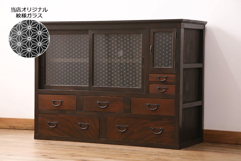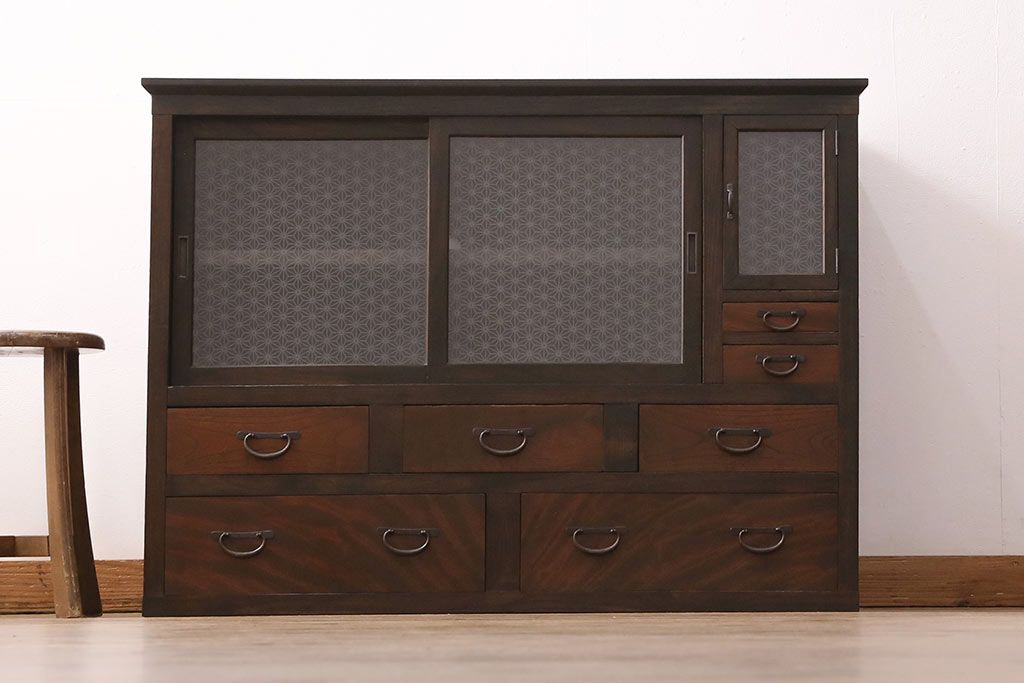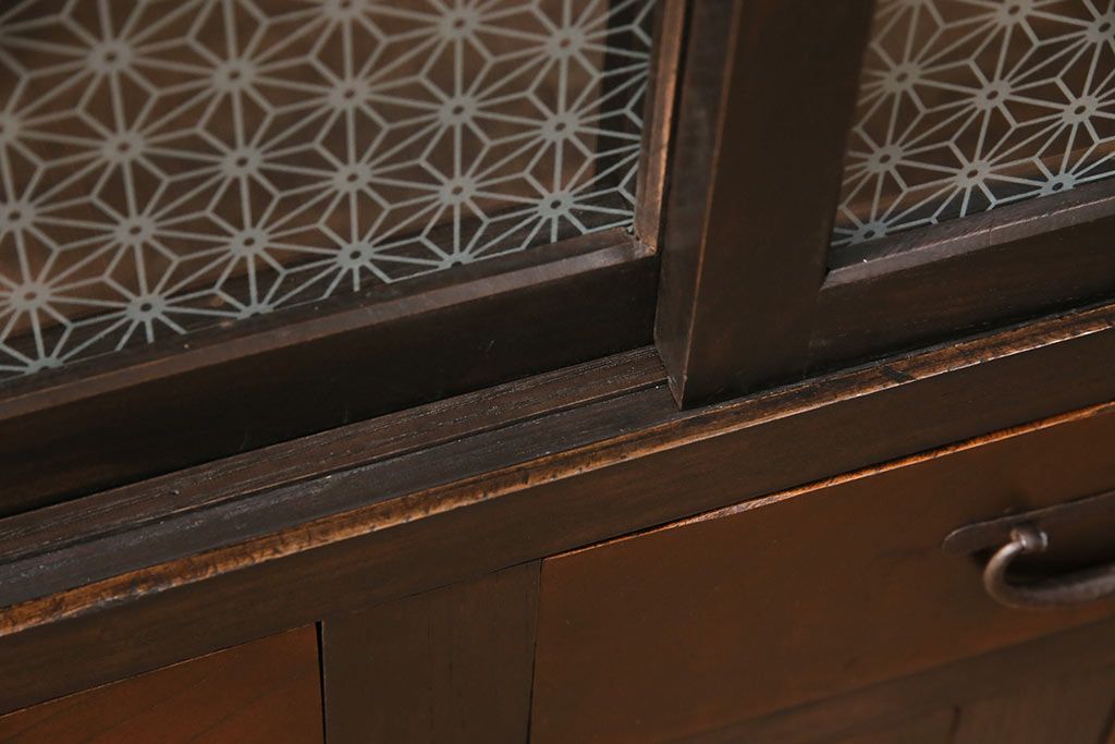 大正期の関東水屋箪笥をリペア&カスタム!左上戸内に棚板を追加し、背面穴開け加工。ヒノキ無垢材の天板を取り付け。板戸を麻の葉模様ガラスに入れ替え。本体は濃い茶色、引き出し前板は明るめの茶色に着色し仕上げ。(収納棚、戸棚、食器棚)