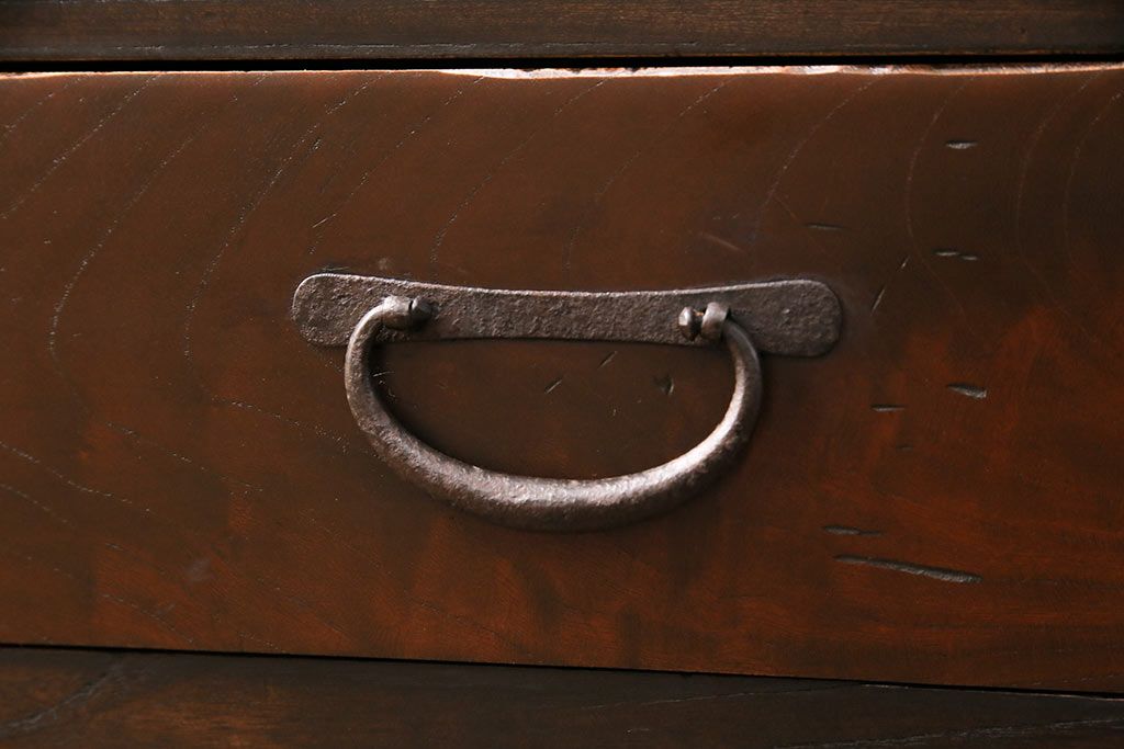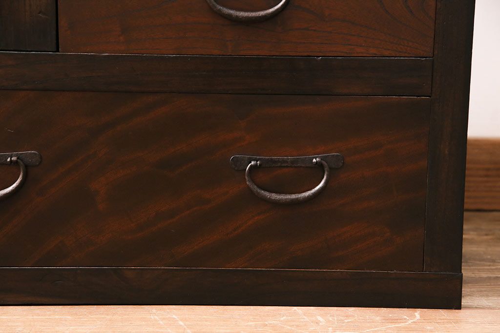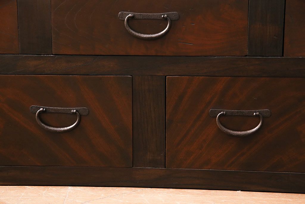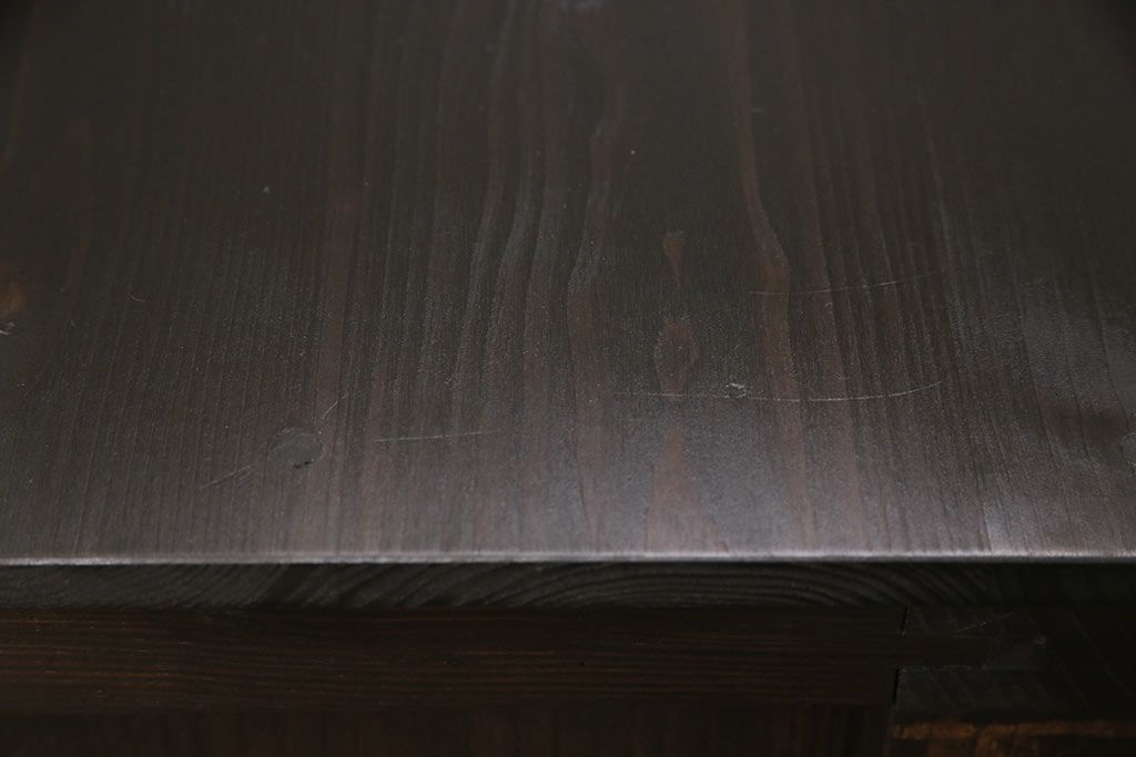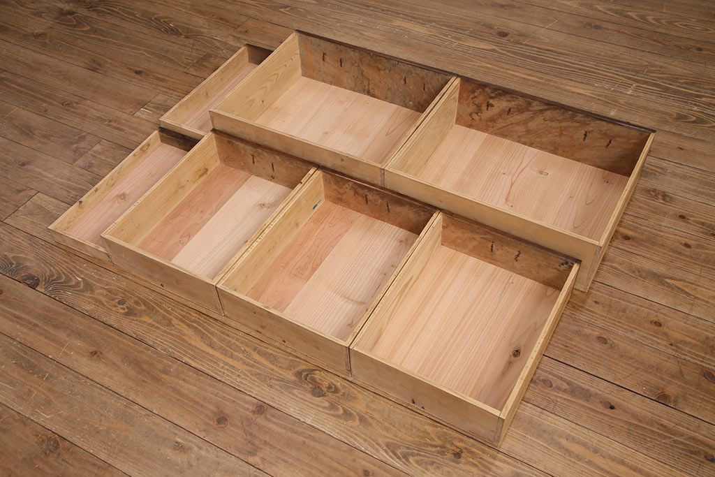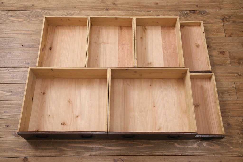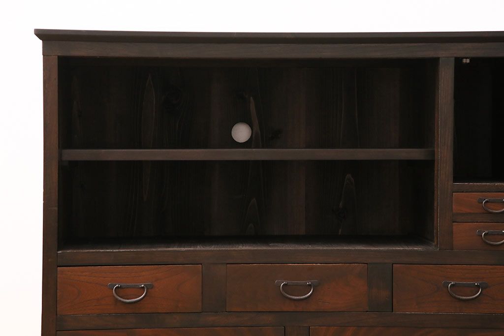 大正期の関東水屋箪笥をリペア&カスタム!左上戸内に棚板を追加し、背面穴開け加工。ヒノキ無垢材の天板を取り付け。板戸を麻の葉模様ガラスに入れ替え。本体は濃い茶色、引き出し前板は明るめの茶色に着色し仕上げ。(収納棚、戸棚、食器棚)