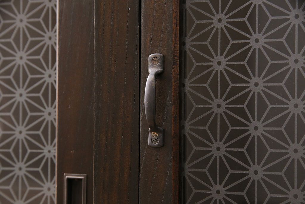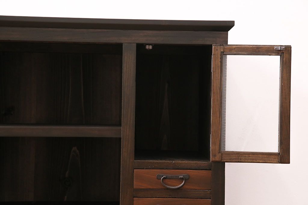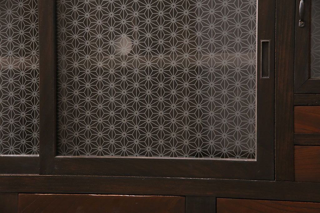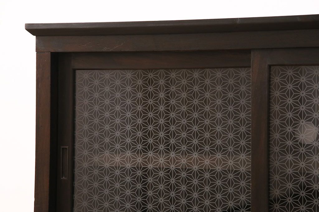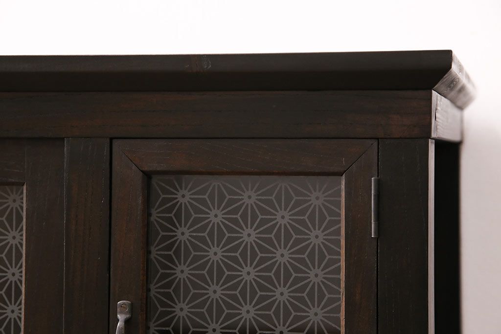 ラフジュ工房> キャビネット・戸棚> サイドボード > 大正期の関東水屋箪笥をリペア&カスタム!左上戸内に棚板を追加し、背面穴開け加工。ヒノキ無垢材の天板を取り付け。板戸を麻の葉模様ガラスに入れ替え。本体は濃い茶色、引き出し前板は明るめの茶色に着色し仕上げ。(収納棚、戸棚、食器棚)