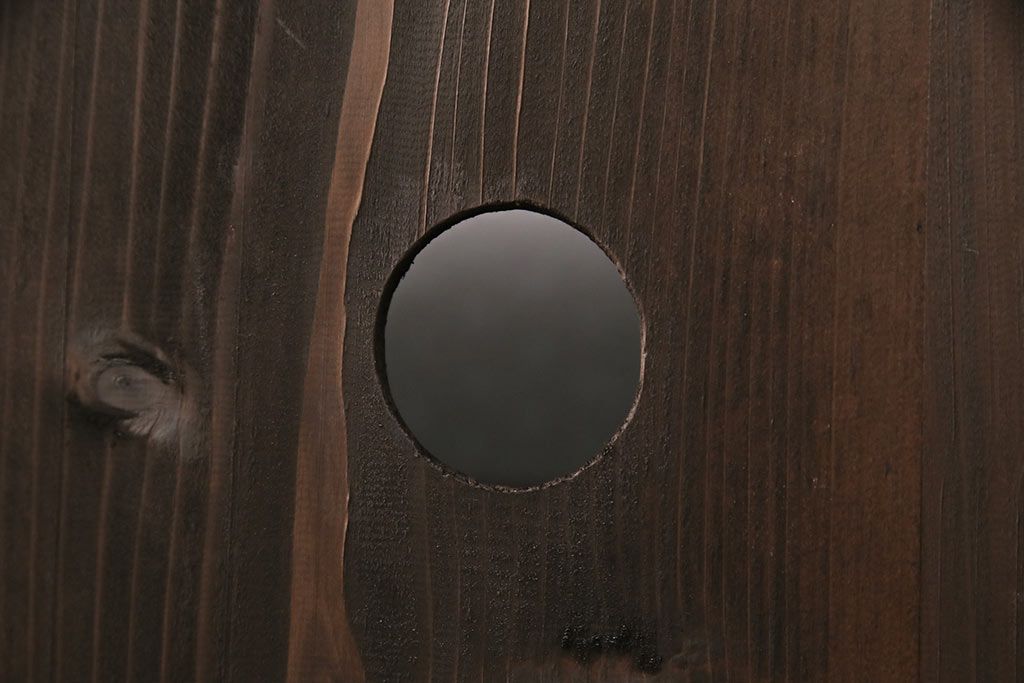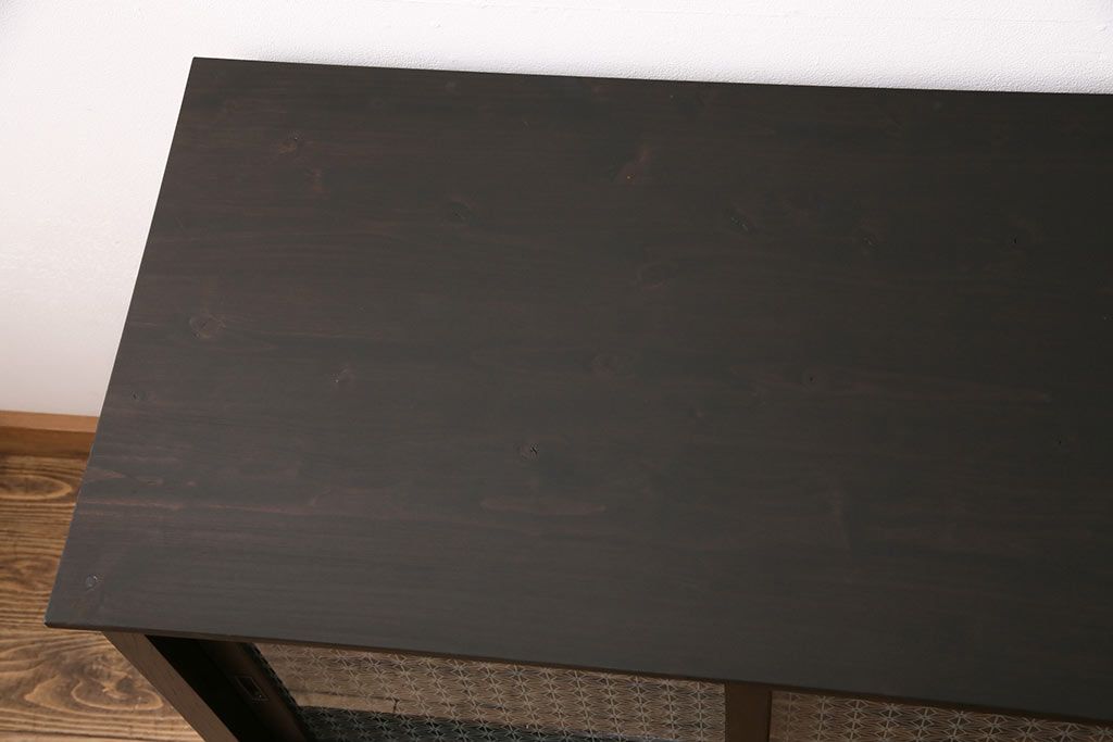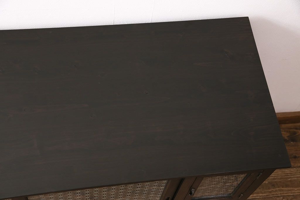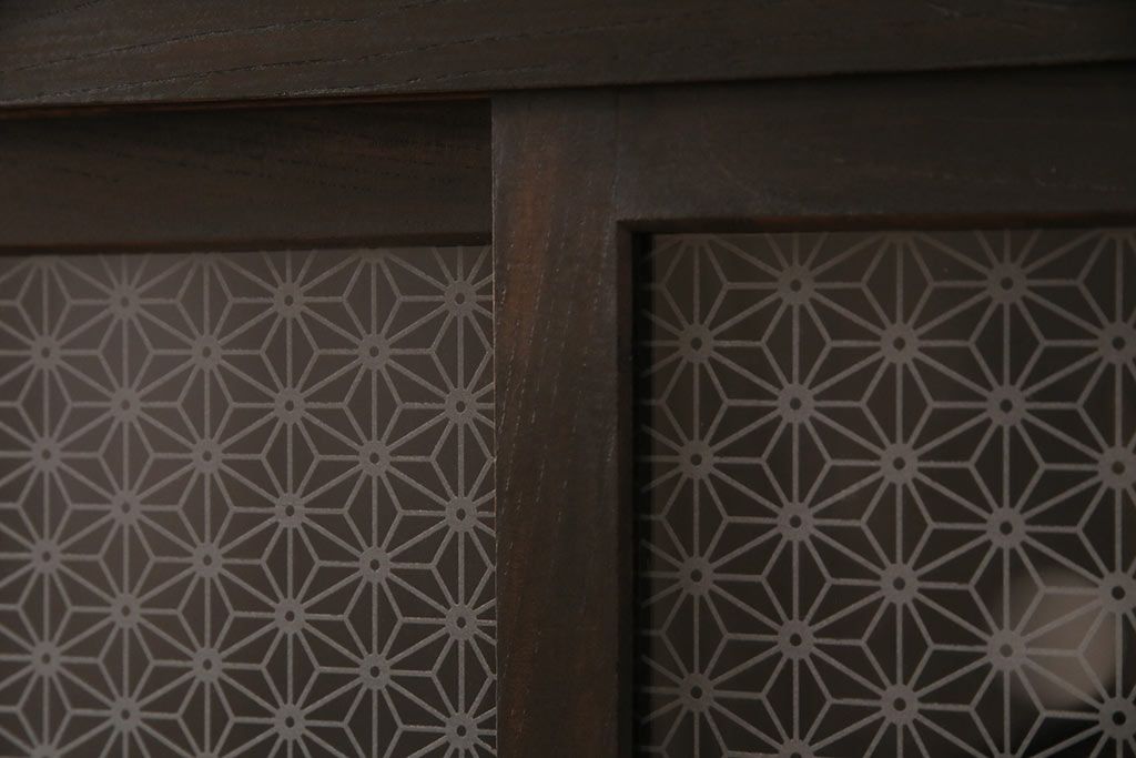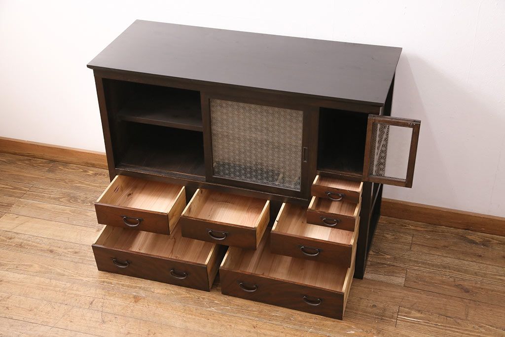 ラフジュ工房> キャビネット・戸棚> サイドボード > 大正期の関東水屋箪笥をリペア&カスタム!左上戸内に棚板を追加し、背面穴開け加工。ヒノキ無垢材の天板を取り付け。板戸を麻の葉模様ガラスに入れ替え。本体は濃い茶色、引き出し前板は明るめの茶色に着色し仕上げ。(収納棚、戸棚、食器棚)