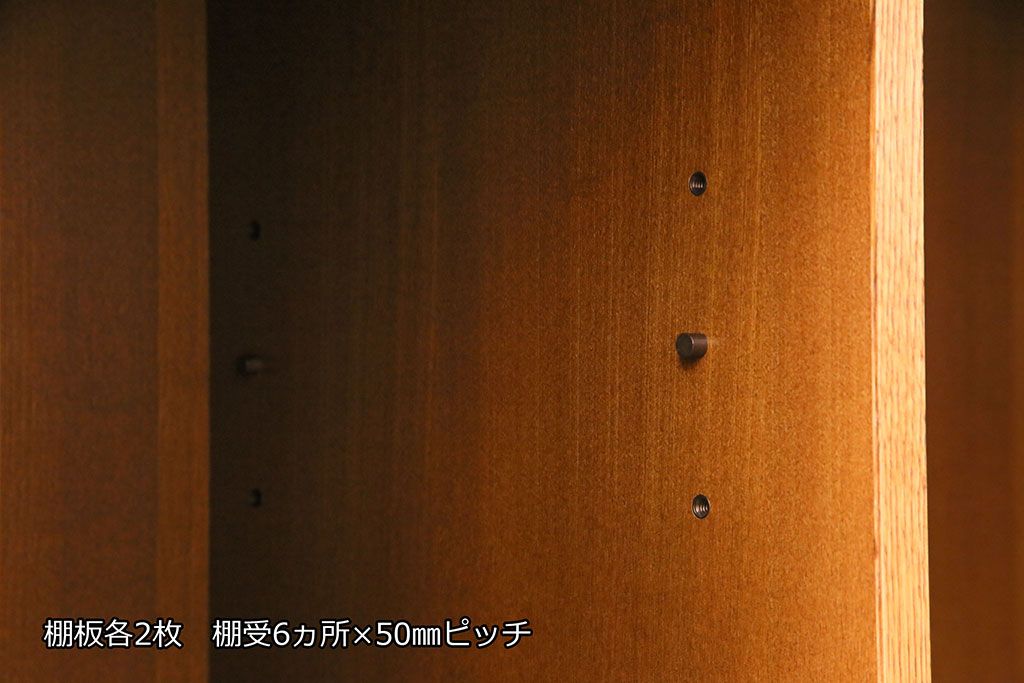 棚板は取り外しできます。棚板は各2枚あります。棚受けは6ヶ所、50mmピッチで調整できます。棚幅サイズのものが1枚の作りです。