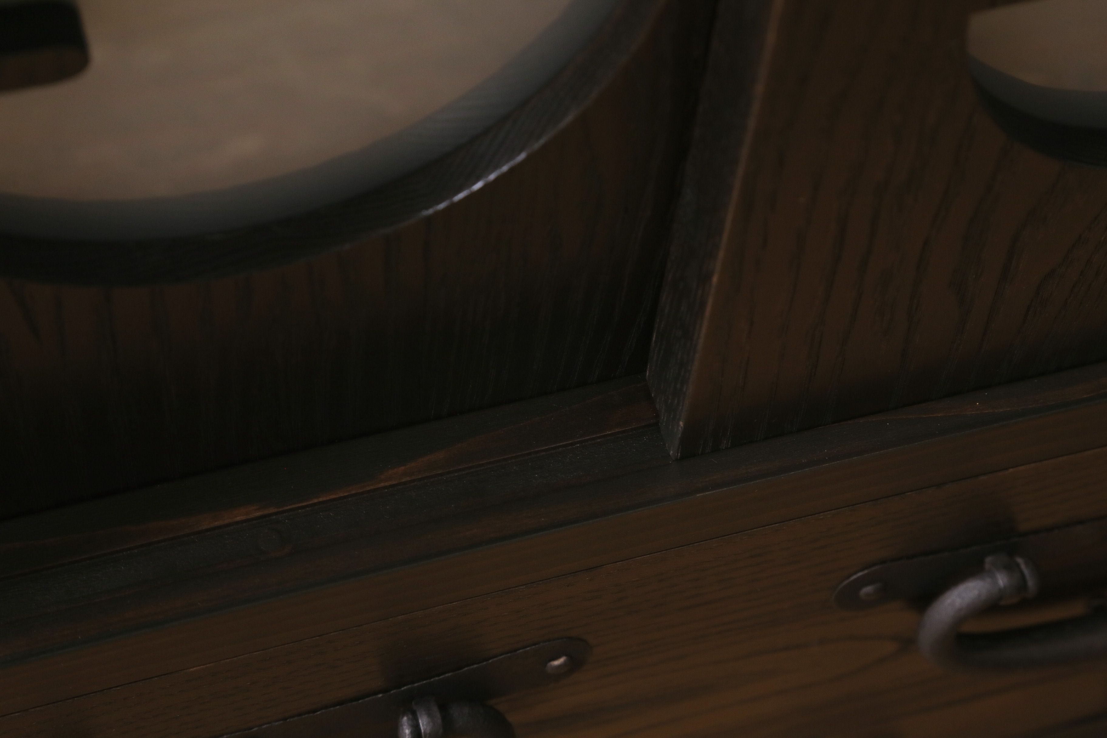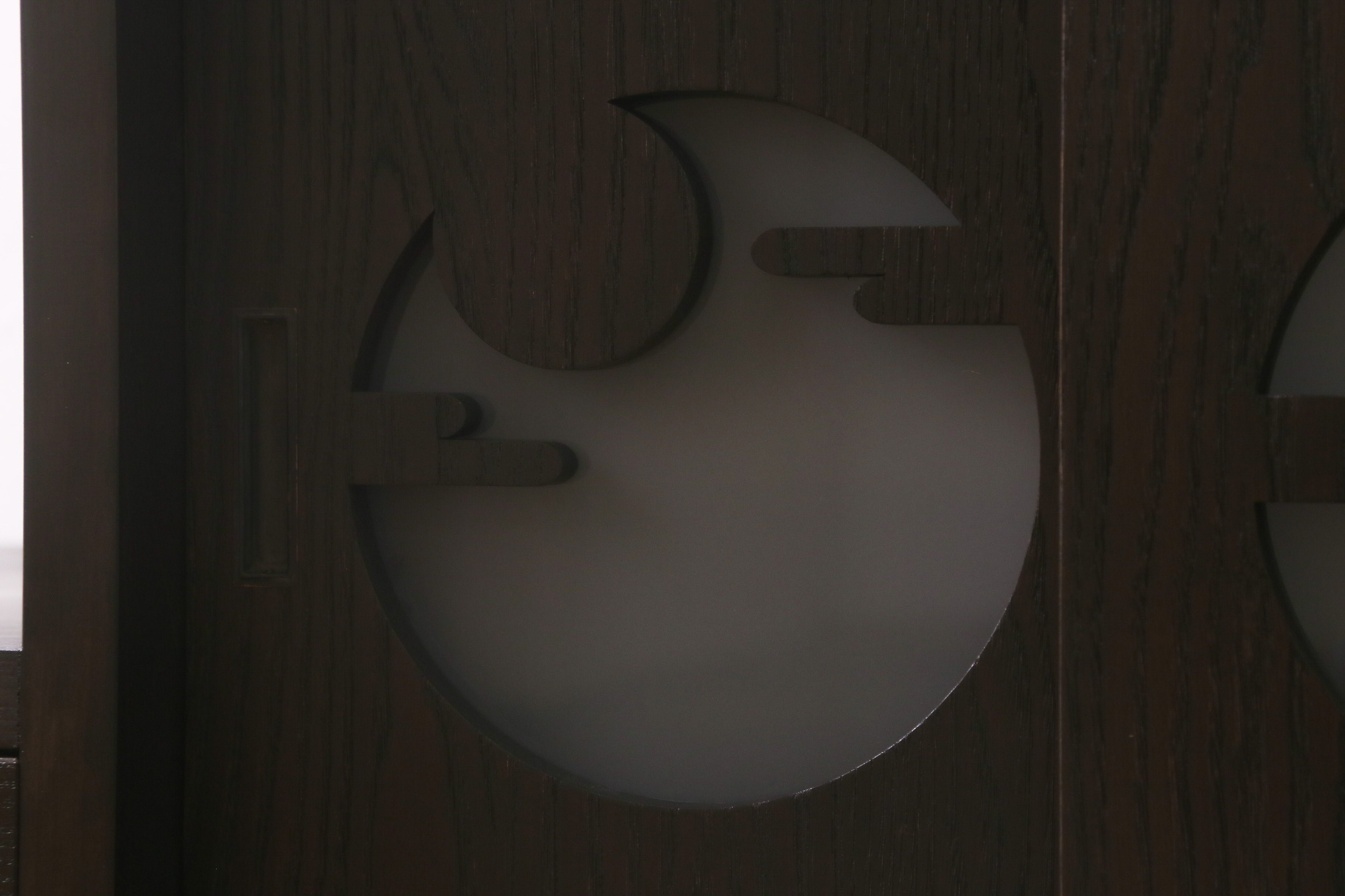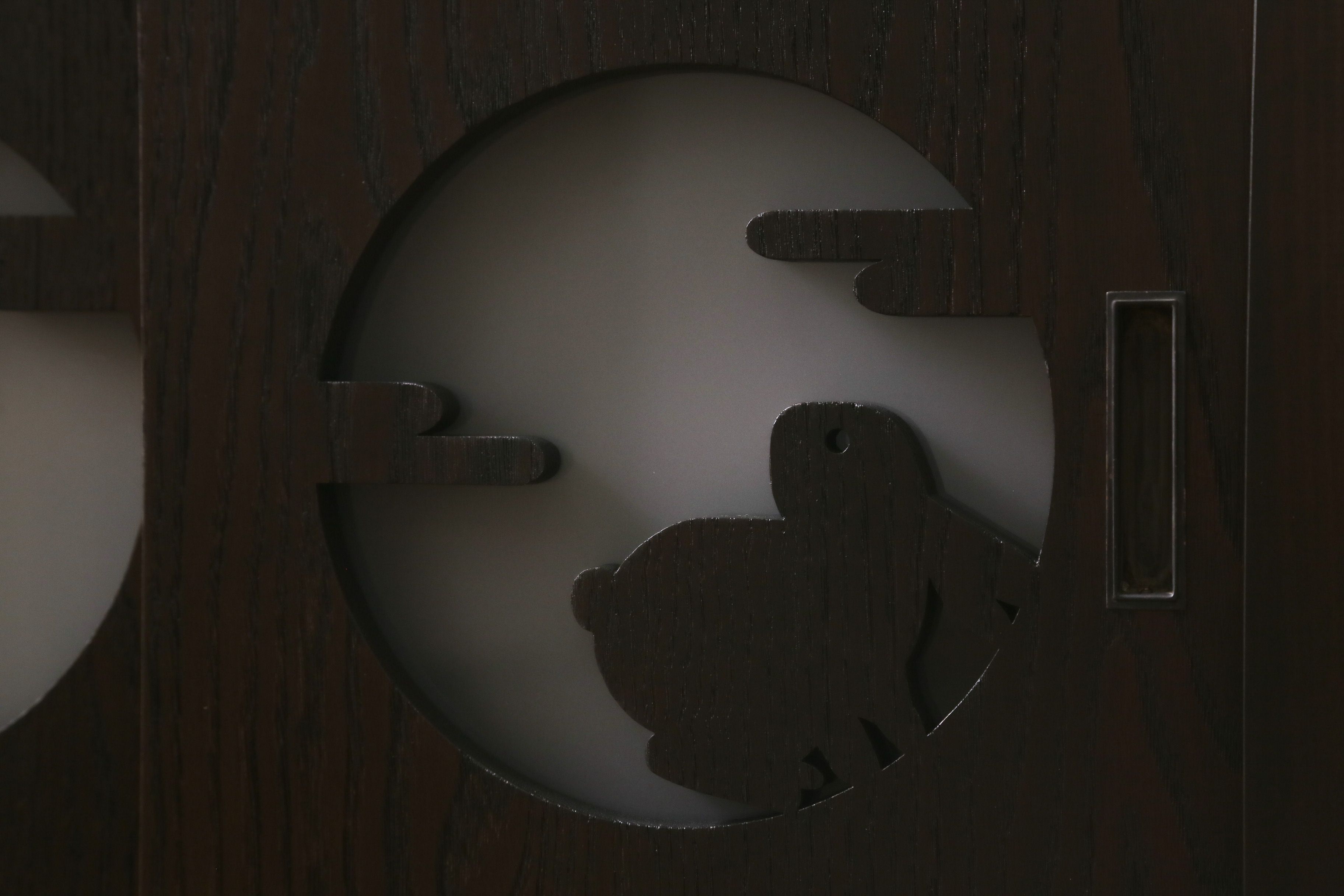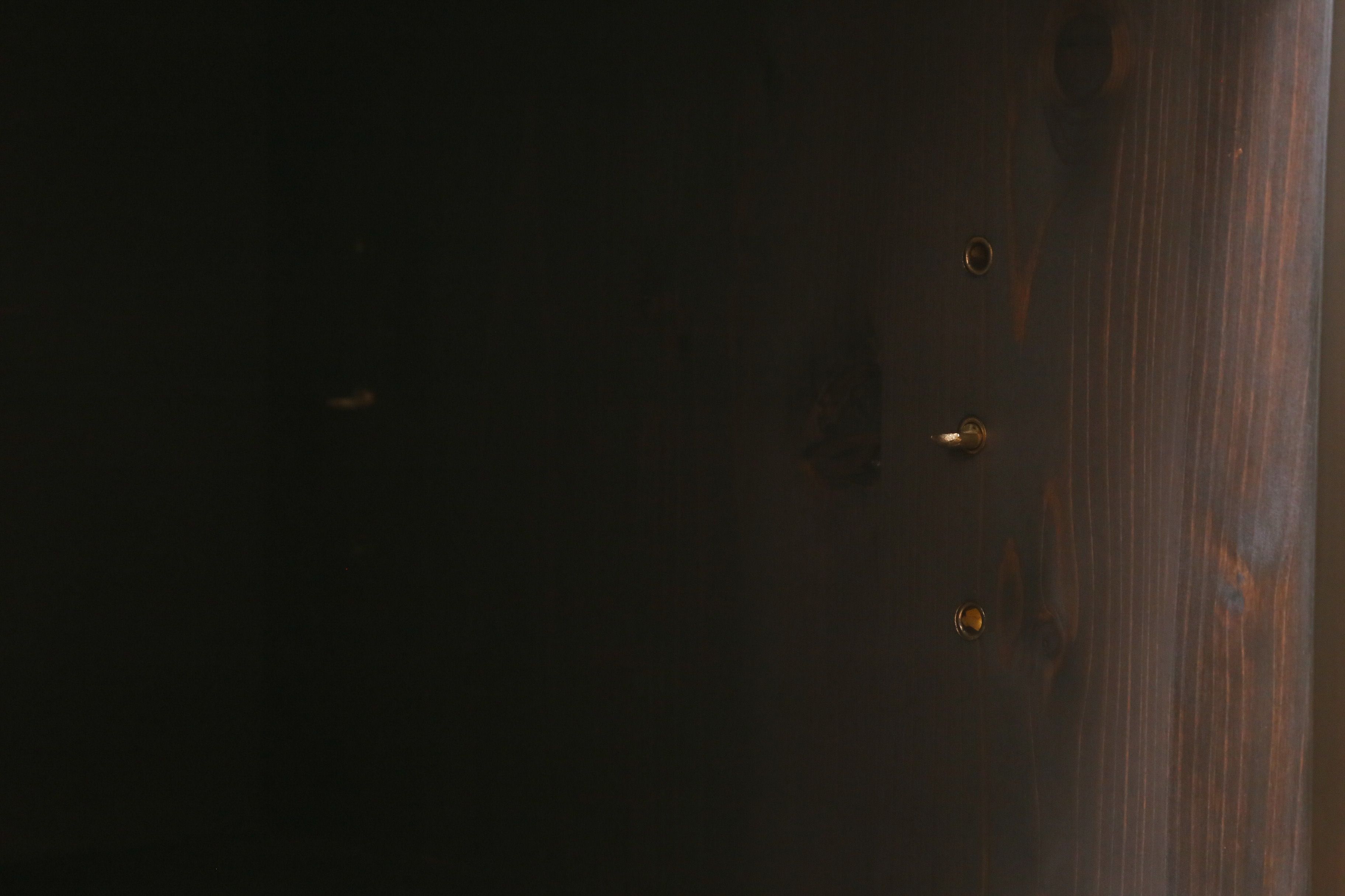 フルオーダー家具実績 > 階段箪笥を新規製作!明治期の引き手と錠前金具を使用。本体は新材で製作。引き戸に月とうさぎの透かし。濃い茶色で着色し仕上げ。(和タンス、収納箪笥)
