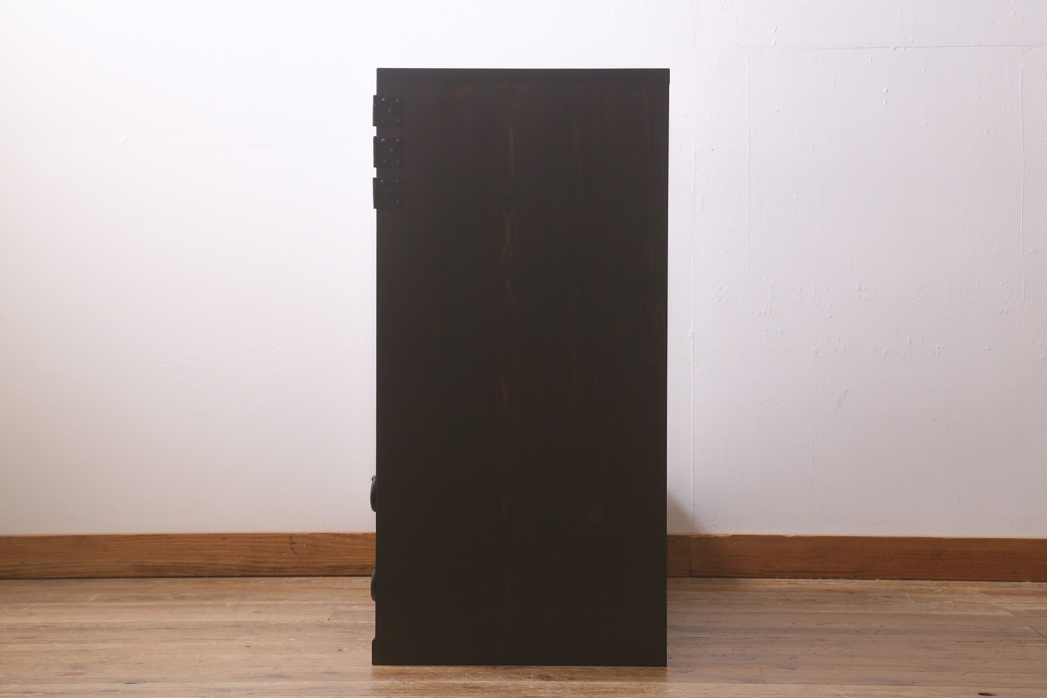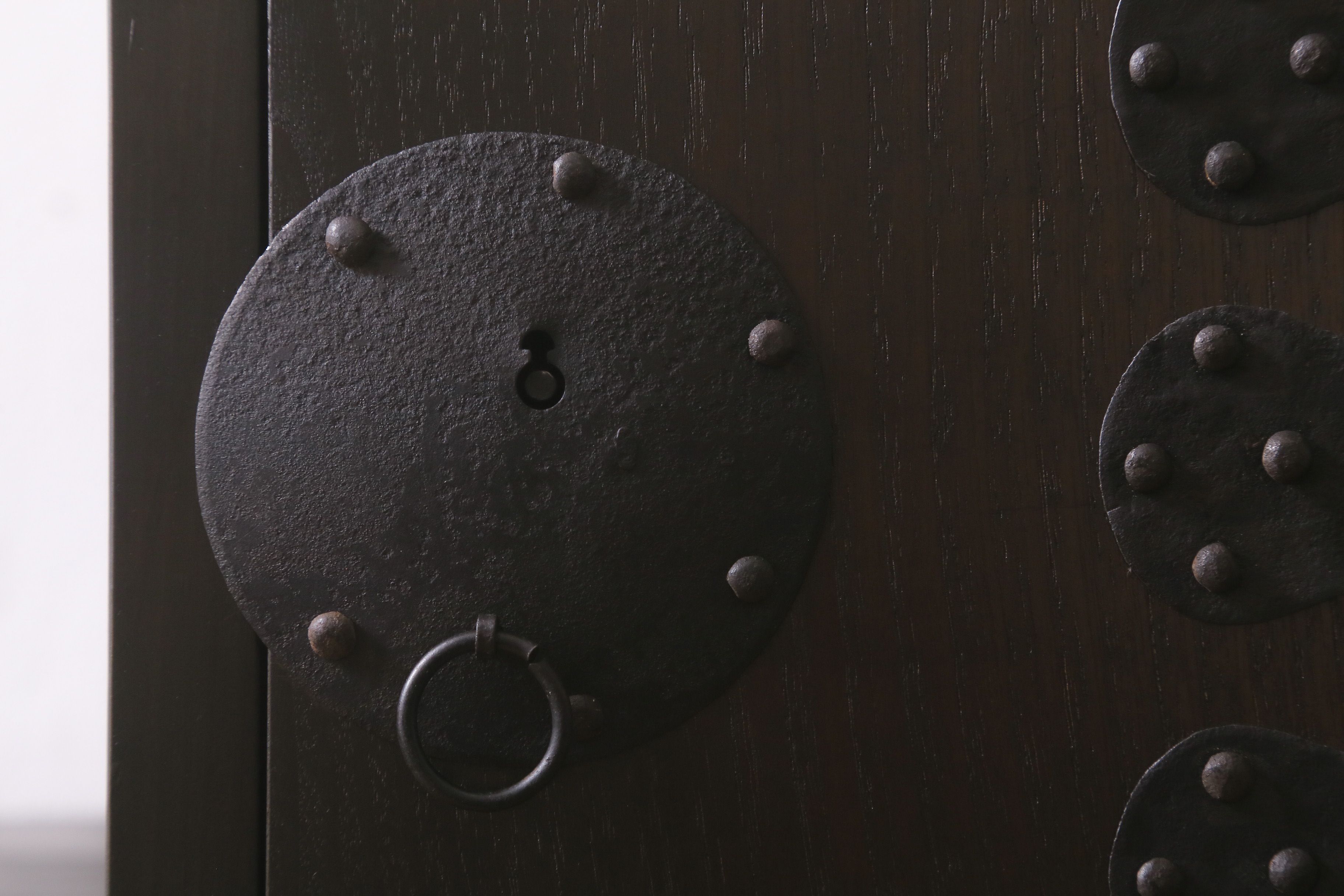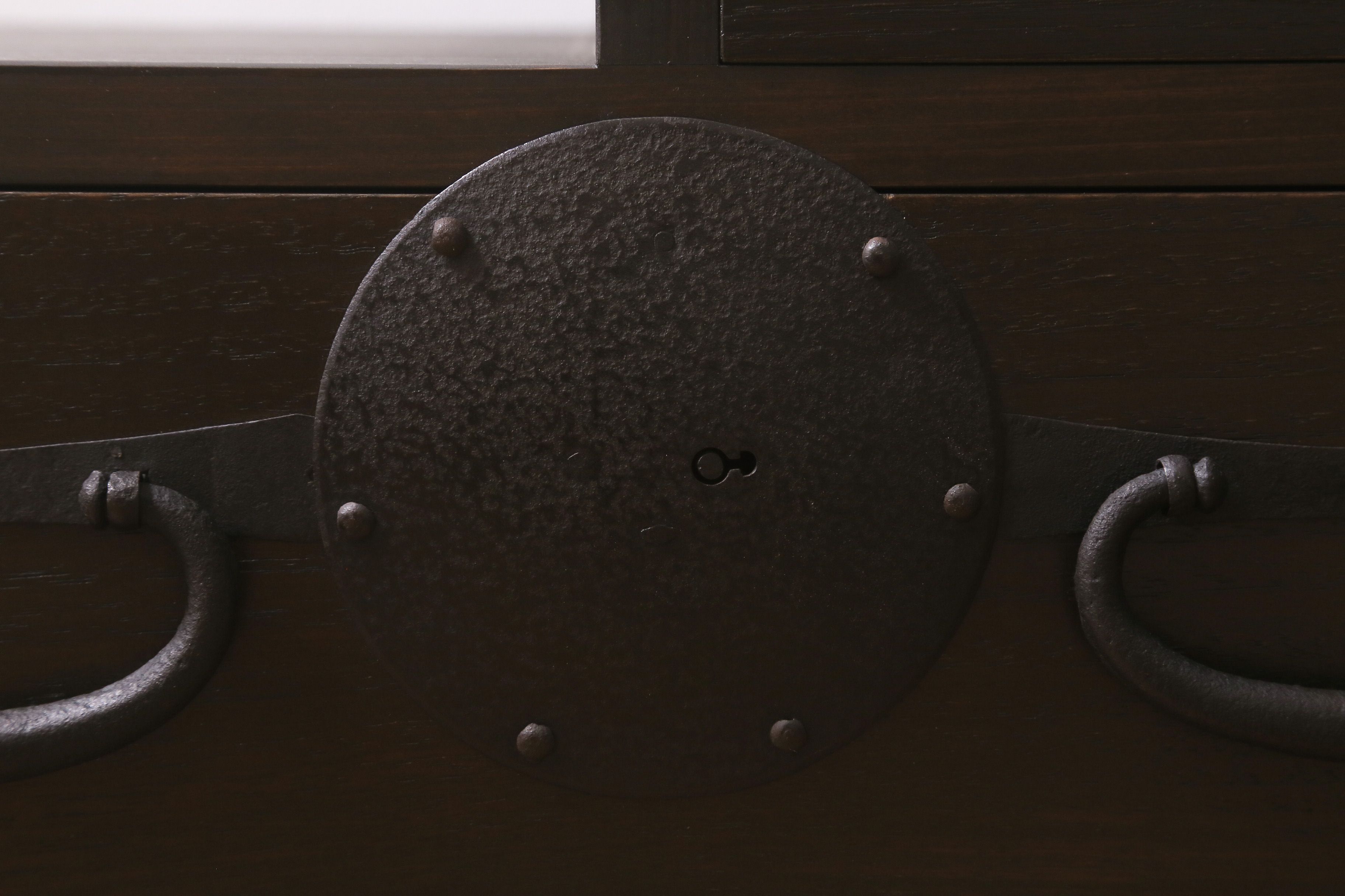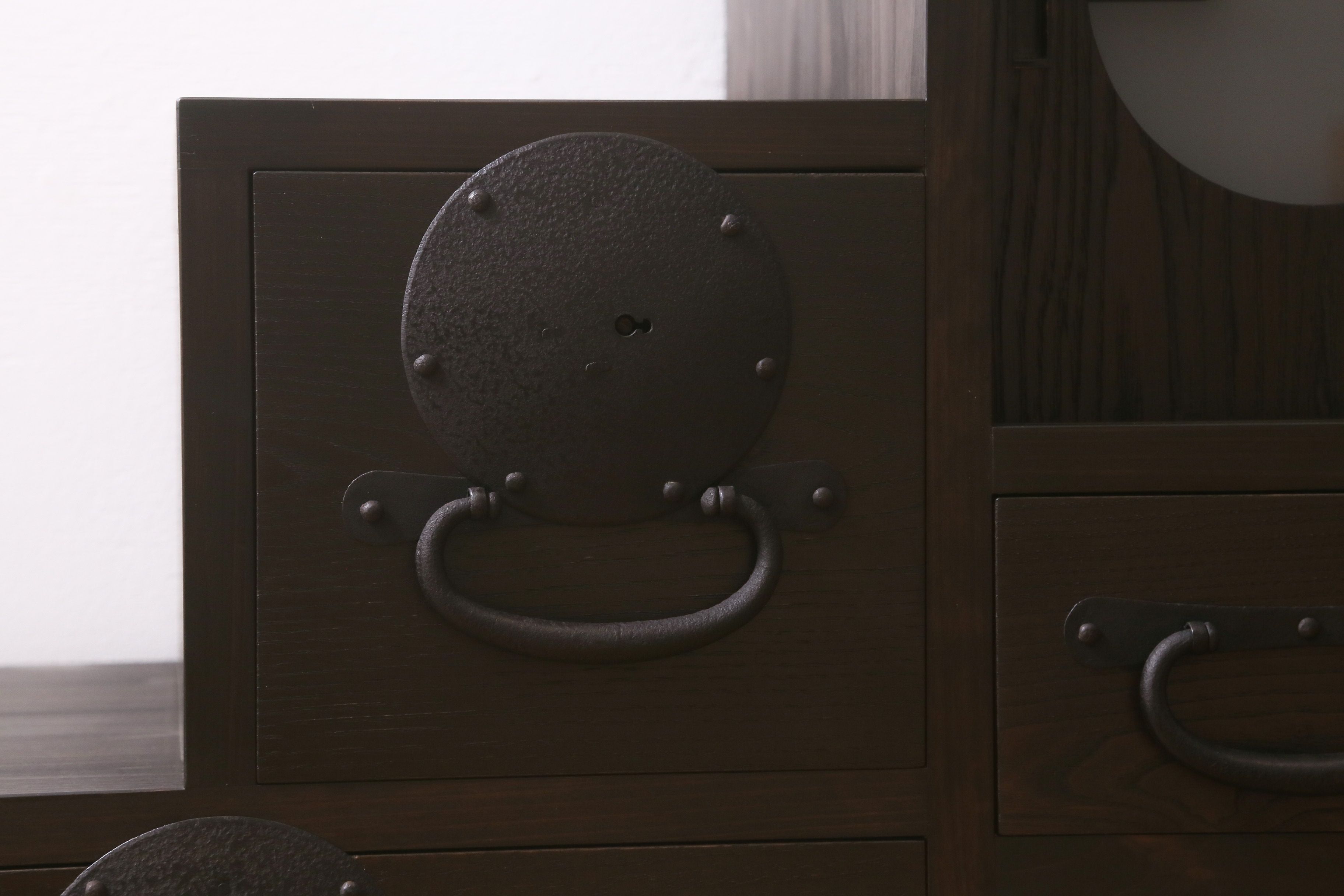 和箪笥 > 階段箪笥を新規製作!明治期の引き手と錠前金具を使用。本体は新材で製作。引き戸に月とうさぎの透かし。濃い茶色で着色し仕上げ。(和タンス、収納箪笥)