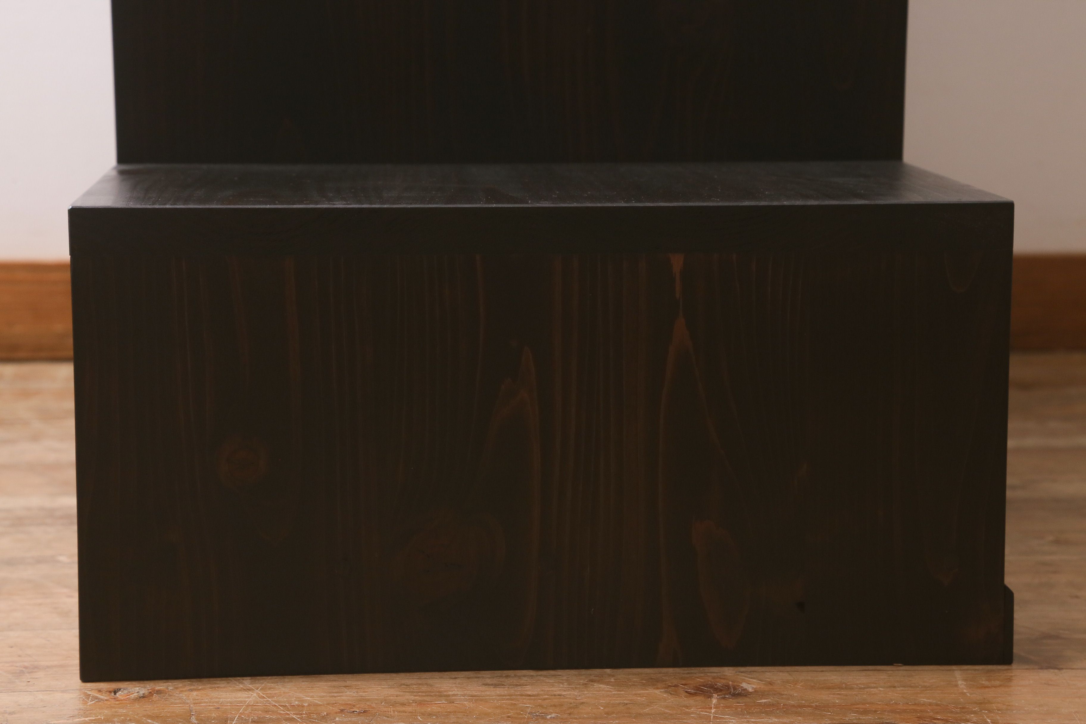 階段箪笥を新規製作!明治期の引き手と錠前金具を使用。本体は新材で製作。引き戸に月とうさぎの透かし。濃い茶色で着色し仕上げ。(和タンス、収納箪笥)