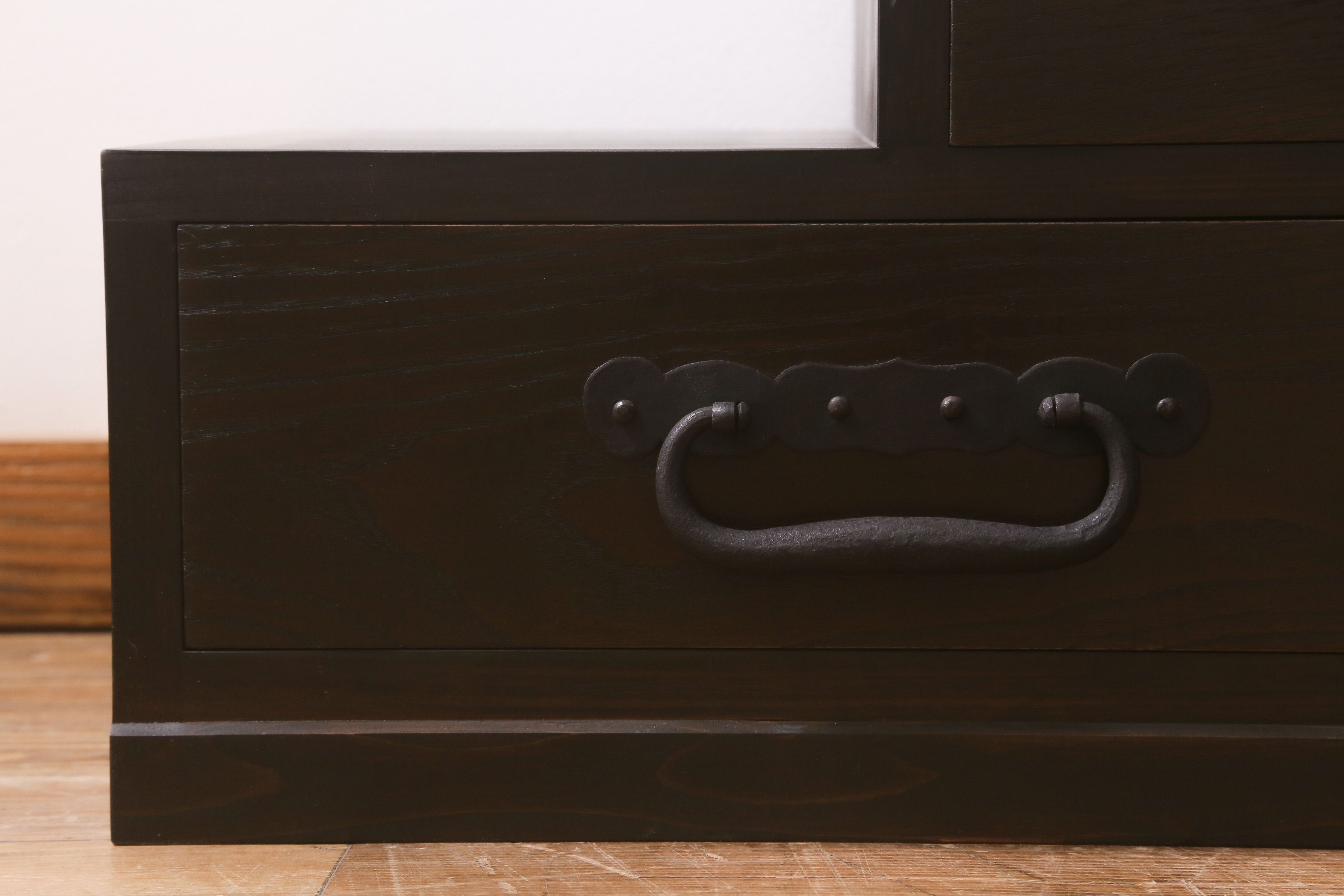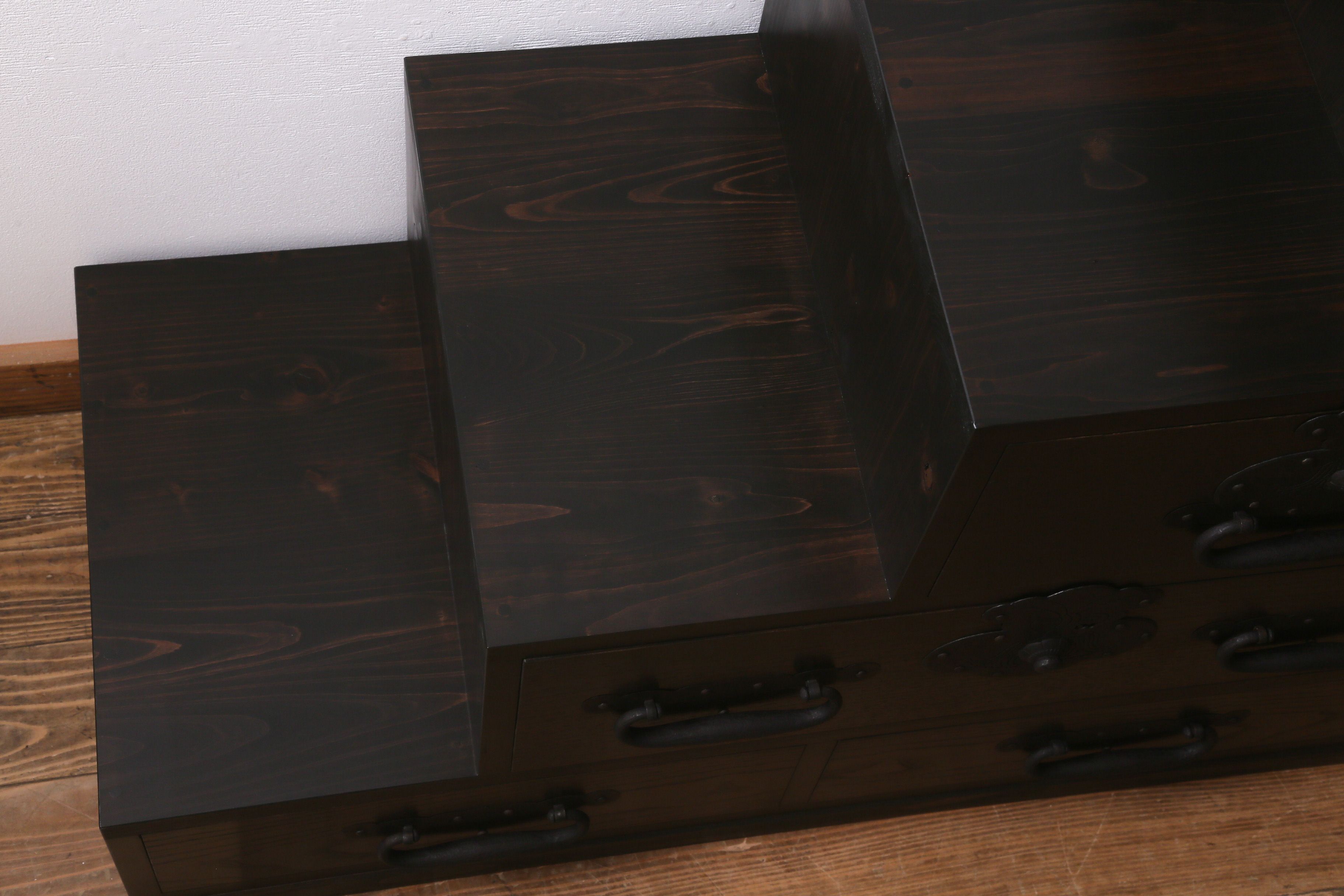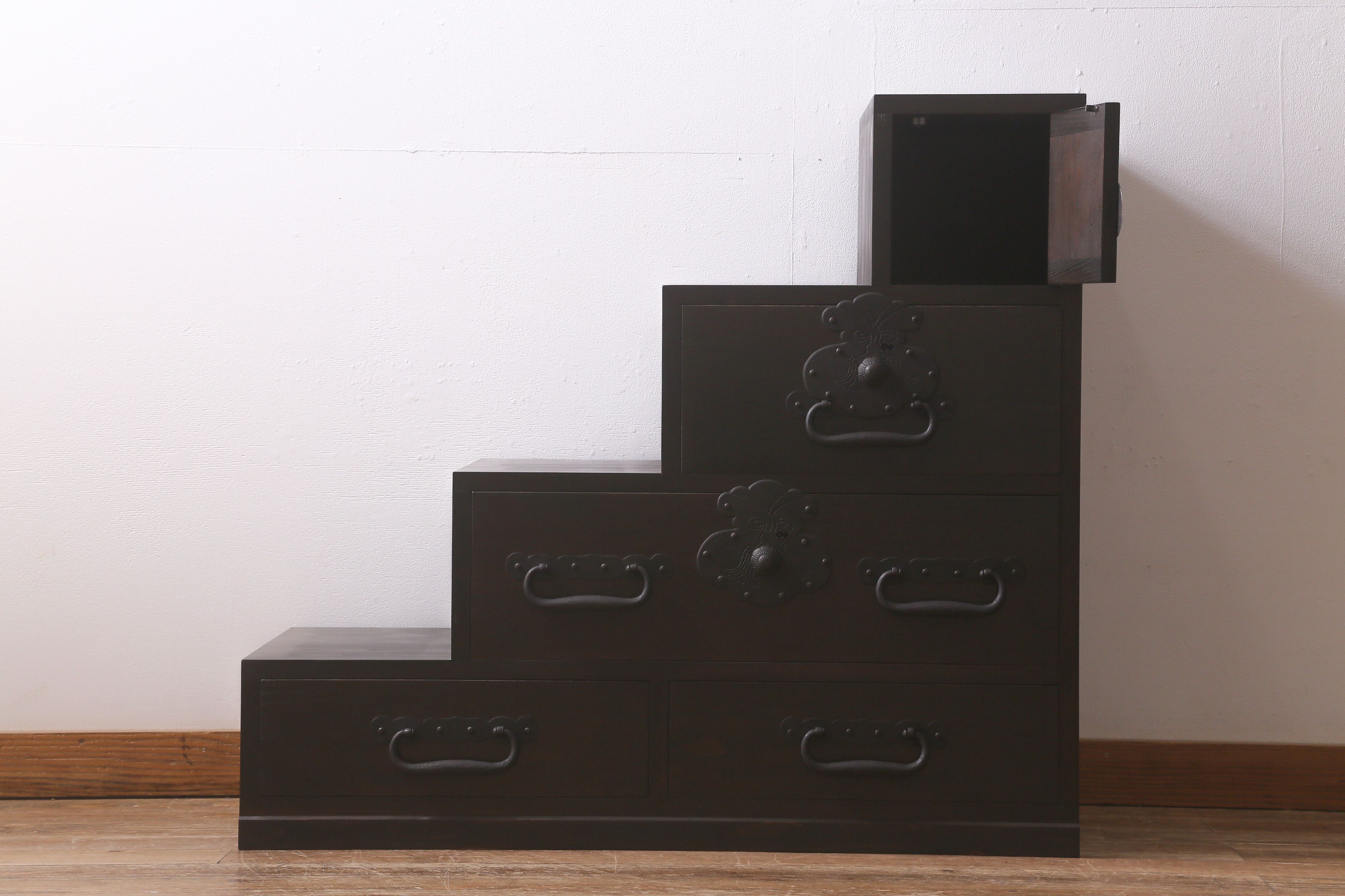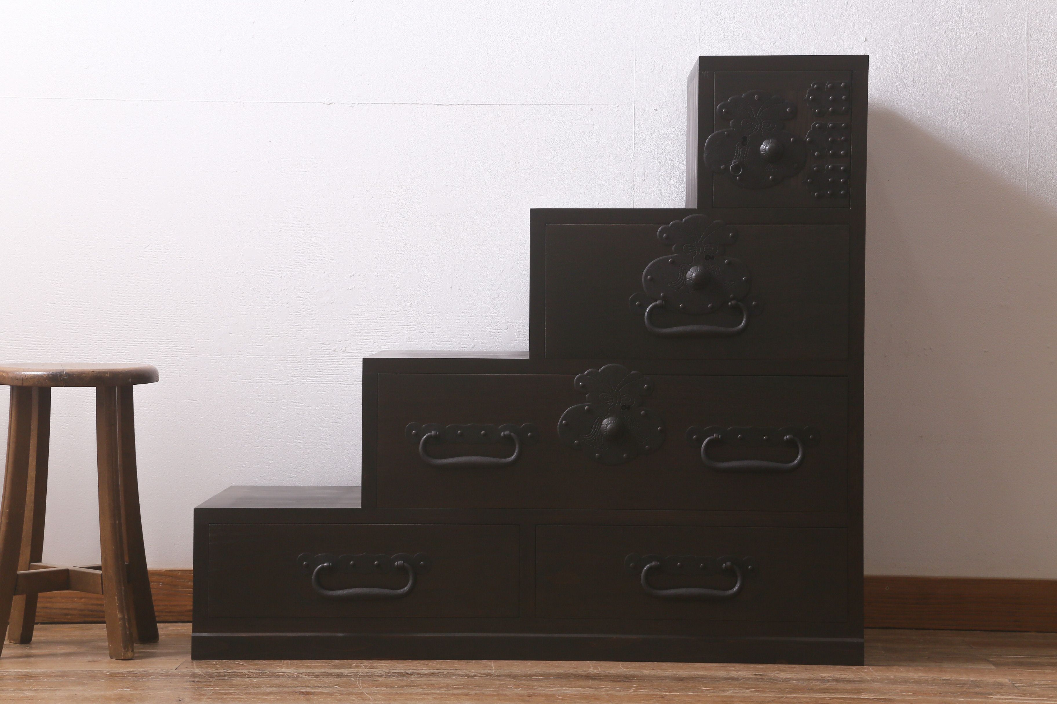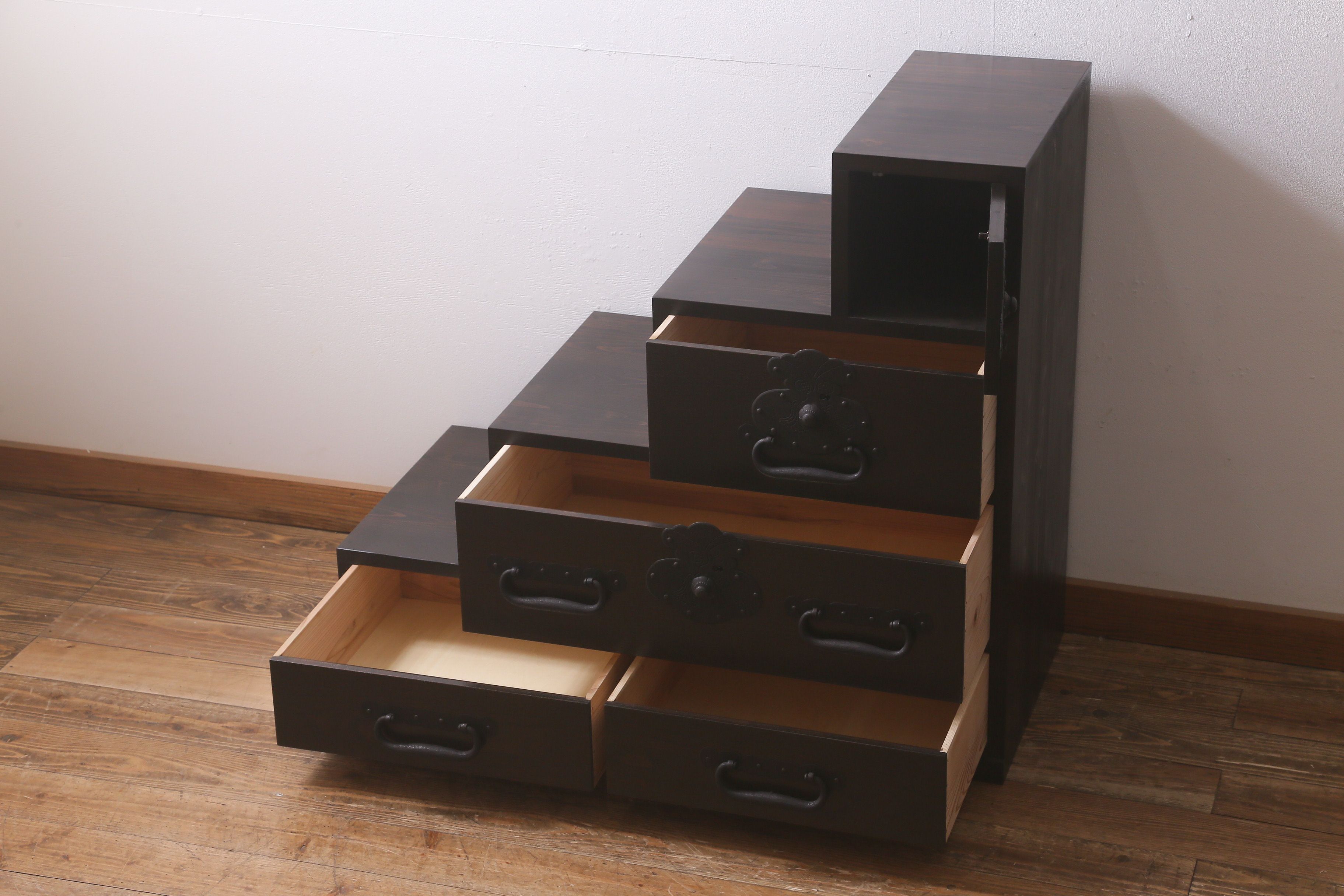 和箪笥 > 階段箪笥を新規製作!明治期の引き手と錠前金具を使用。本体は新材で製作。濃い茶色で着色し仕上げ。(和タンス、収納箪笥)