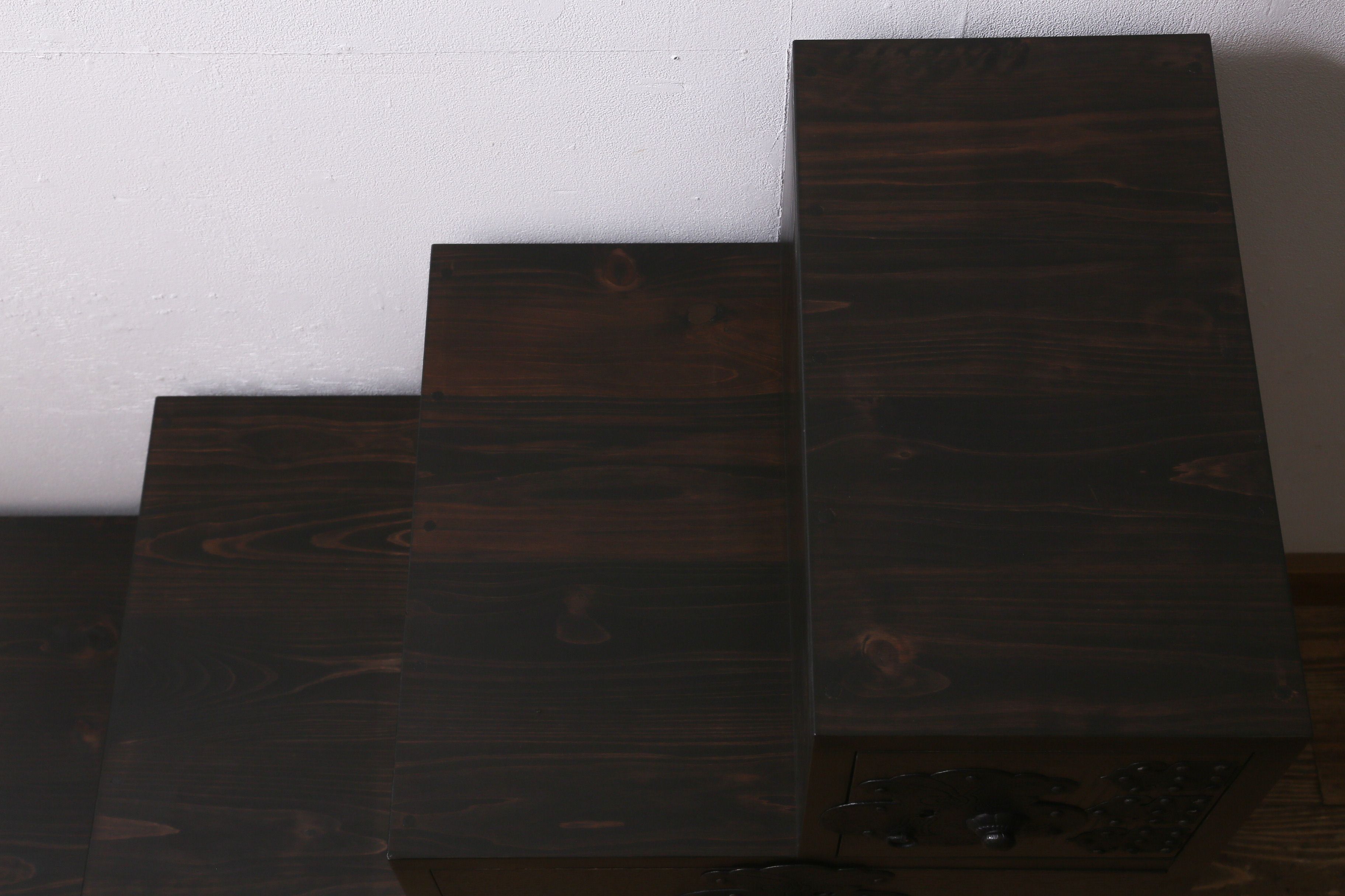 階段箪笥を新規製作!明治期の引き手と錠前金具を使用。本体は新材で製作。濃い茶色で着色し仕上げ。(和タンス、収納箪笥)