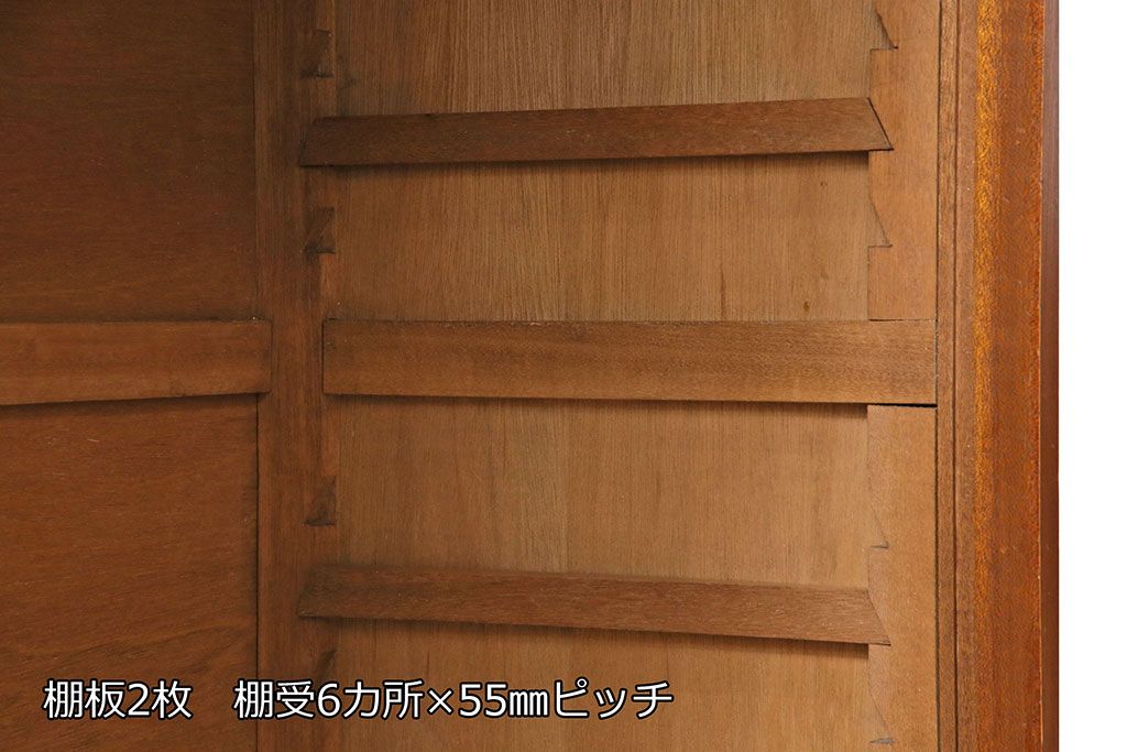 棚板は取り外しできます。棚板は2枚あります。棚受けは6ヶ所、55mmピッチで調整できます。左右別々に取り外しが可能です。