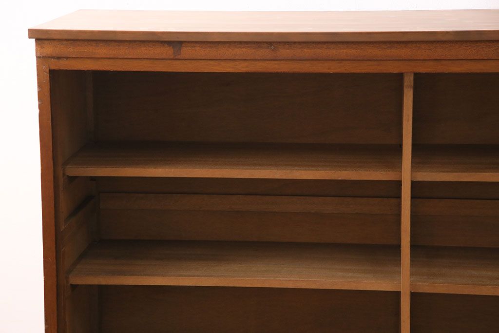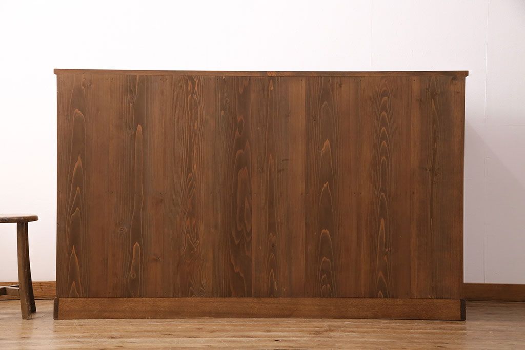 セミオーダー家具実績 > 戸棚をリペア&カスタム!ヒノキ無垢材の天板を取り付け。建具のガラスはクリアガラスに変更。台輪を新たに製作。背板は杉材に張り替え。現状の色味に合わせて着色し、蜜蝋ワックス仕上げ。(収納棚、キャビネット、食器棚)