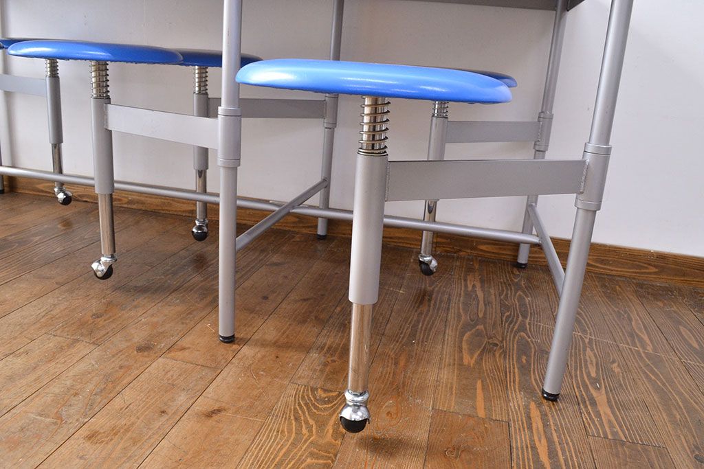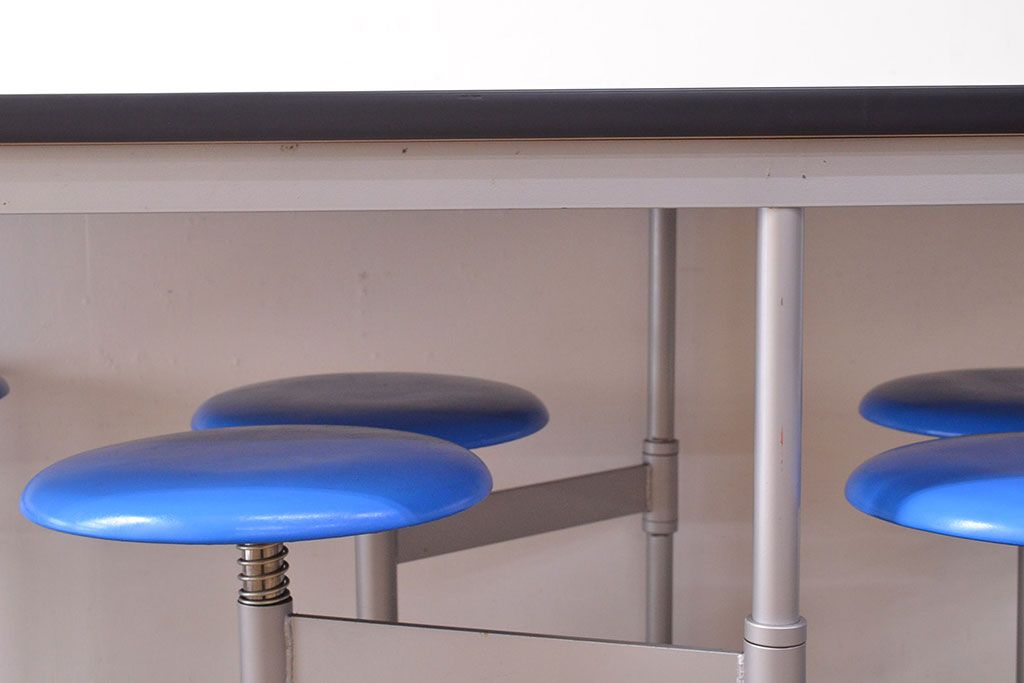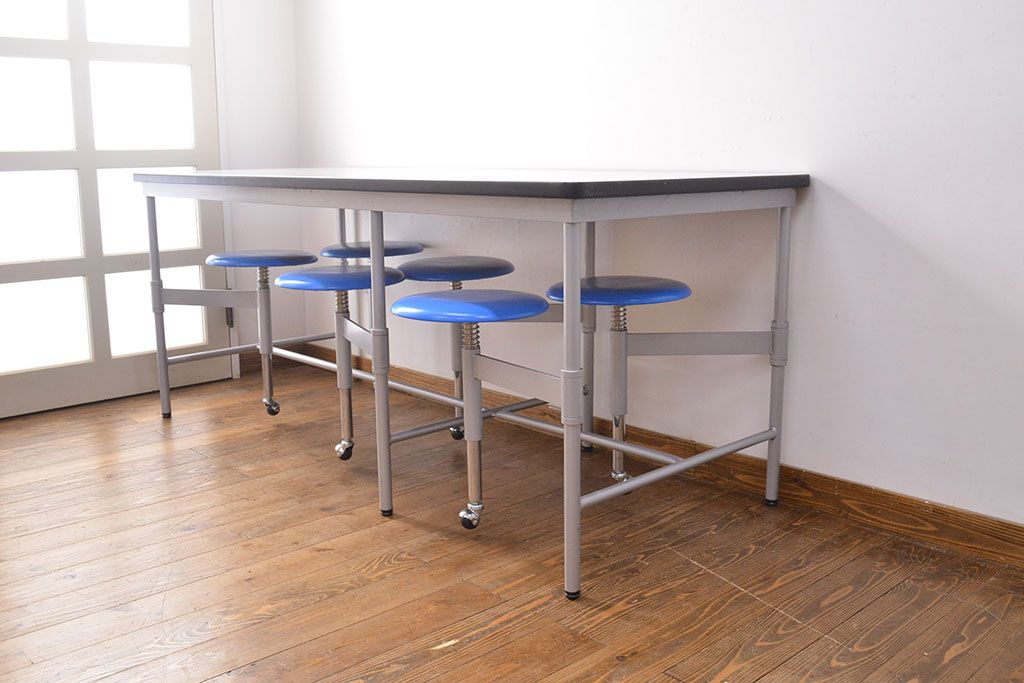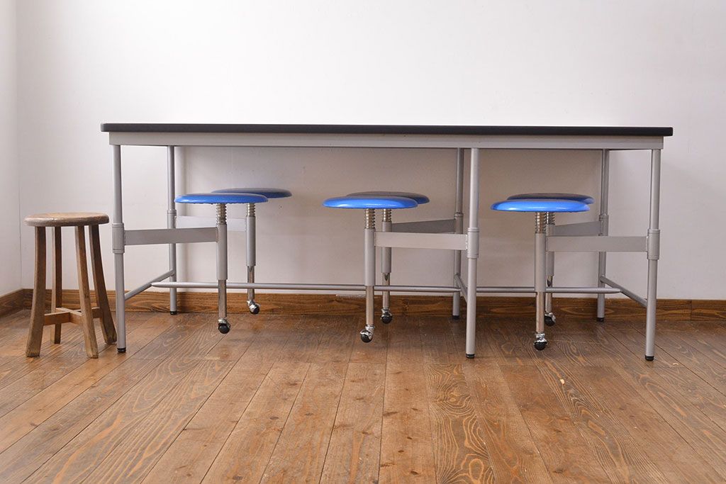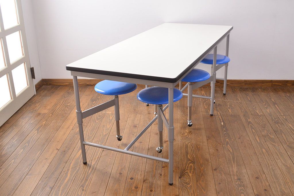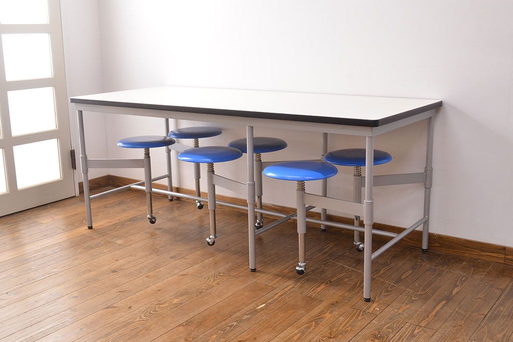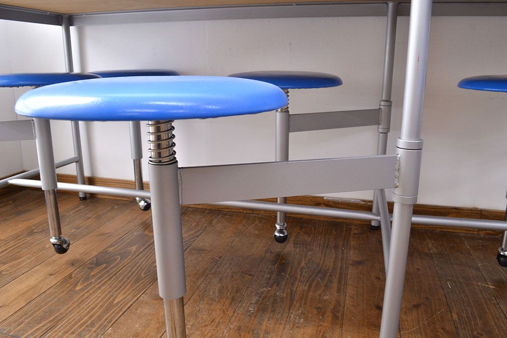 ラフジュ工房> テーブル> 鉄脚テーブル > 見た目のユニークさと機能性を兼ね備えた格納スツール6脚付きテーブル(6人用ダイニングテーブル、作業台)(R-049933)