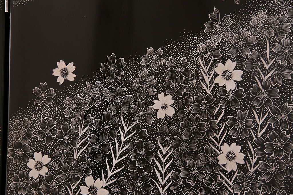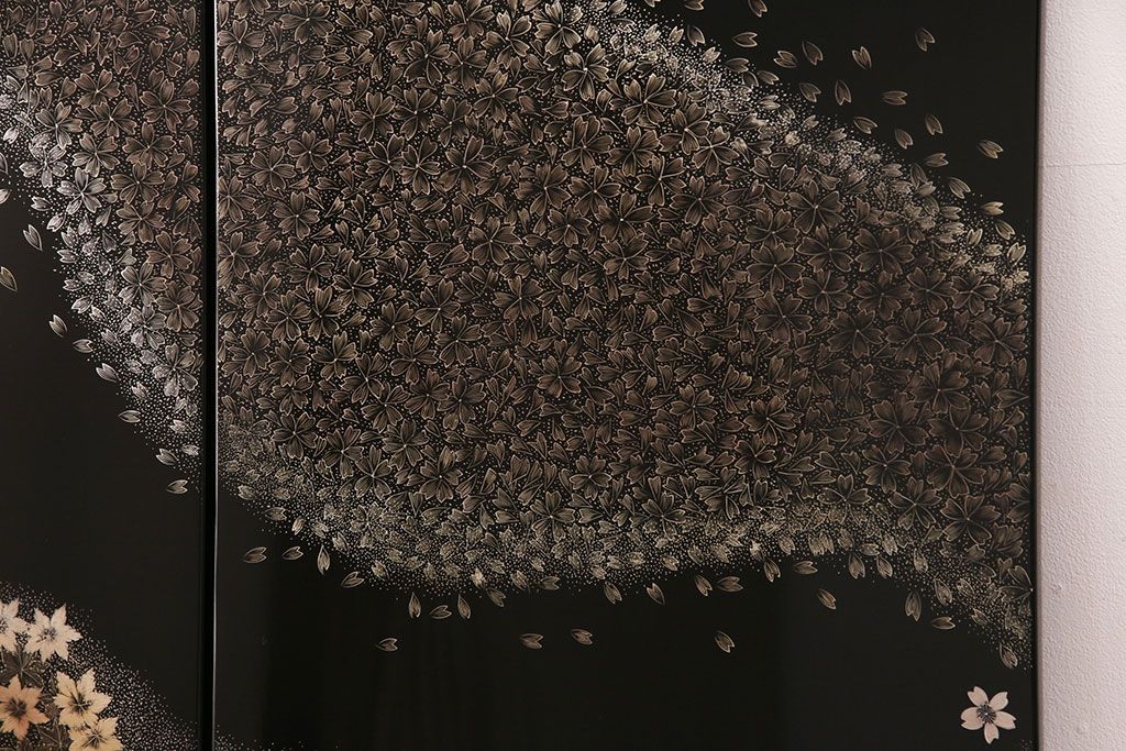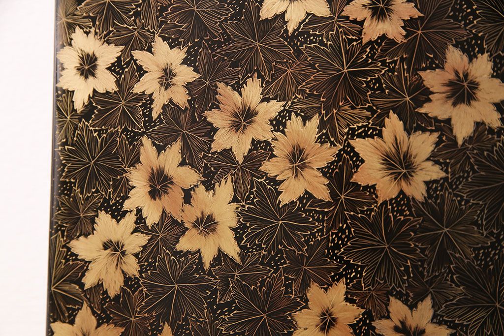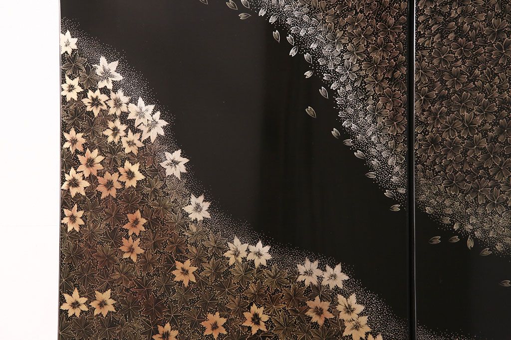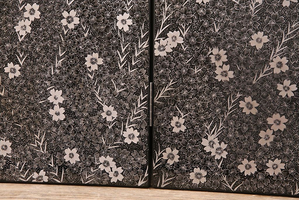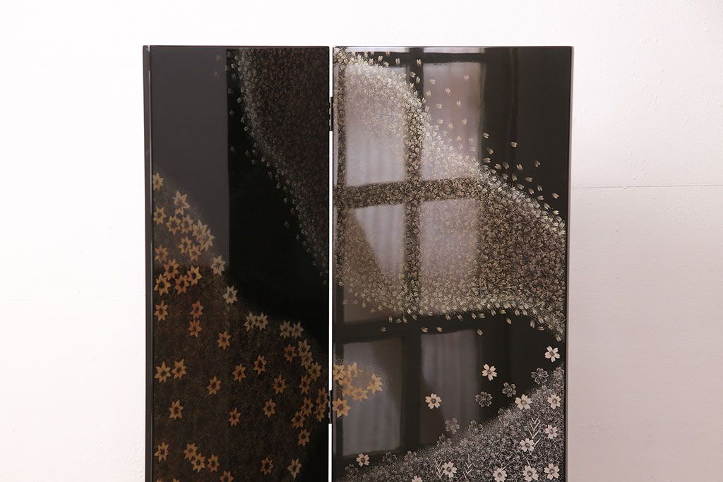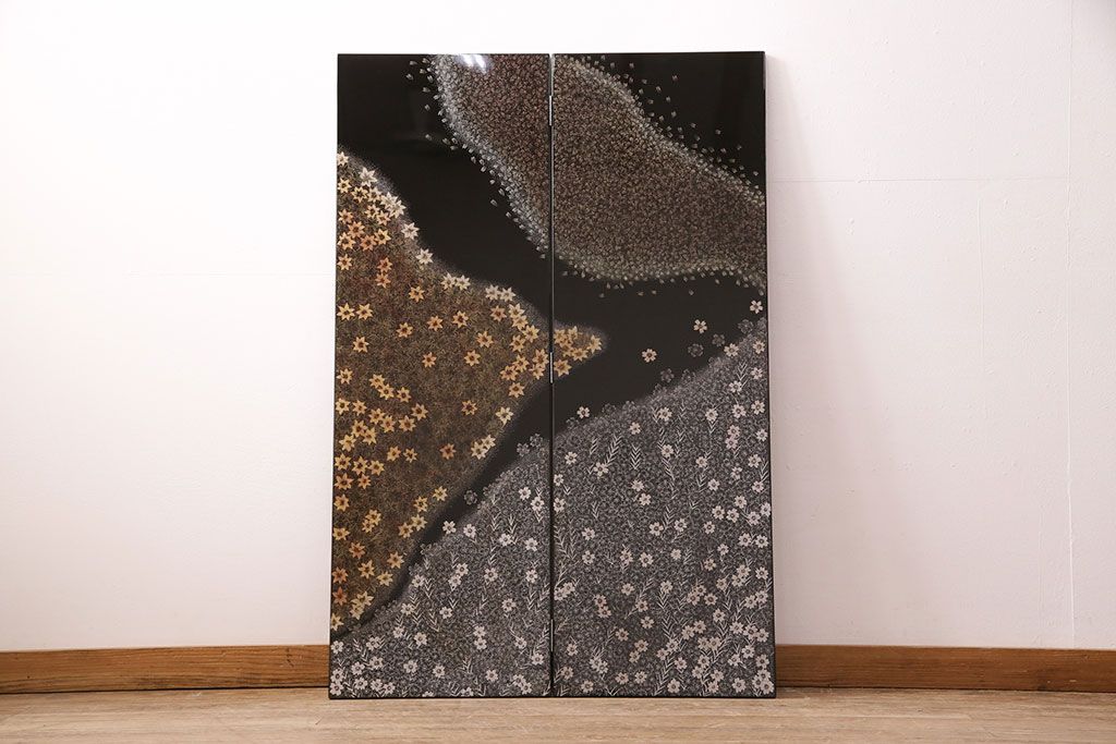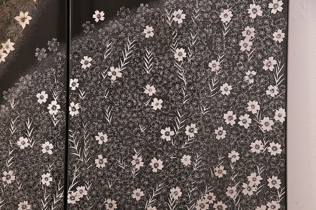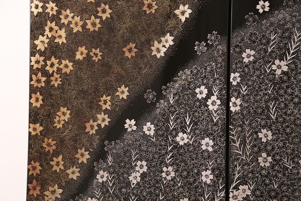 中古 美品 民芸家具 木曽塗り 3種の花の図柄が空間を彩る衝立(つい立て、パーテーション)(R-050410)