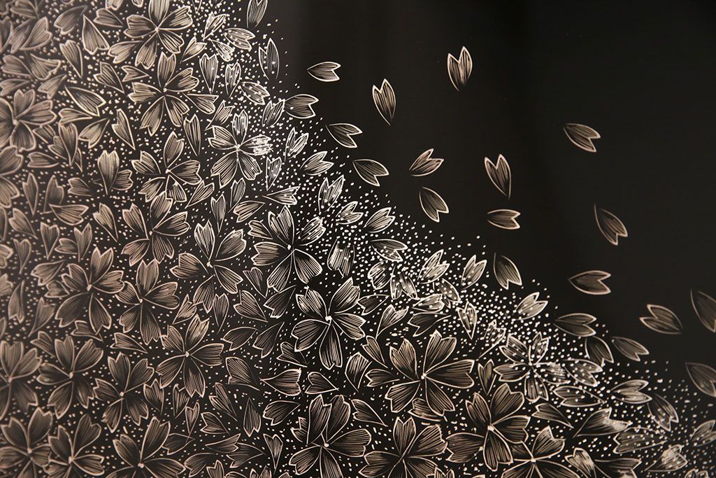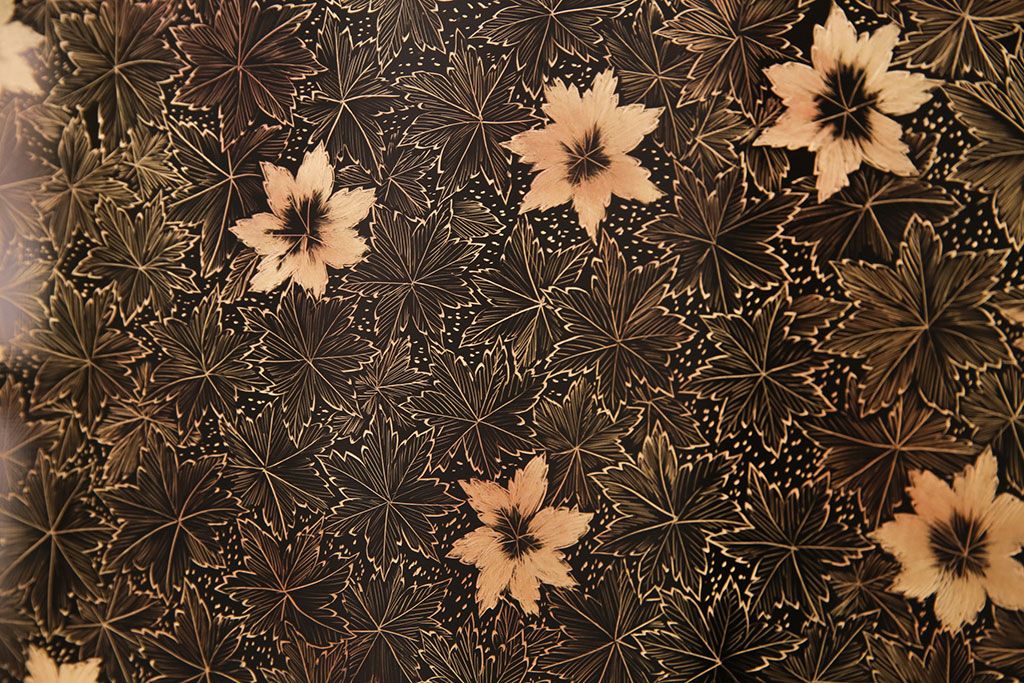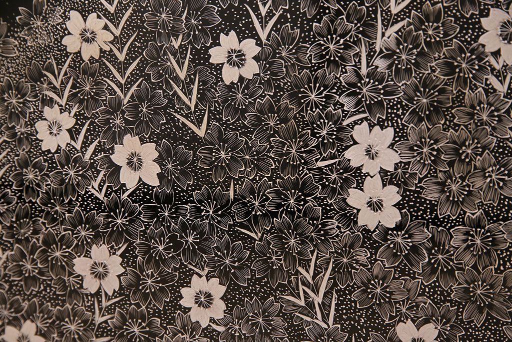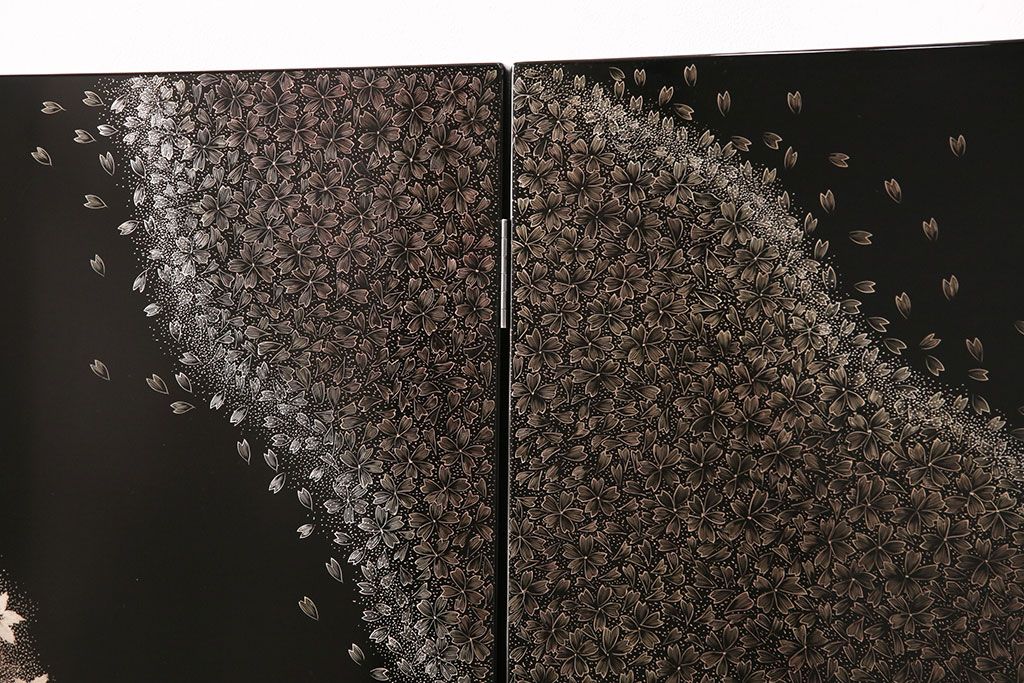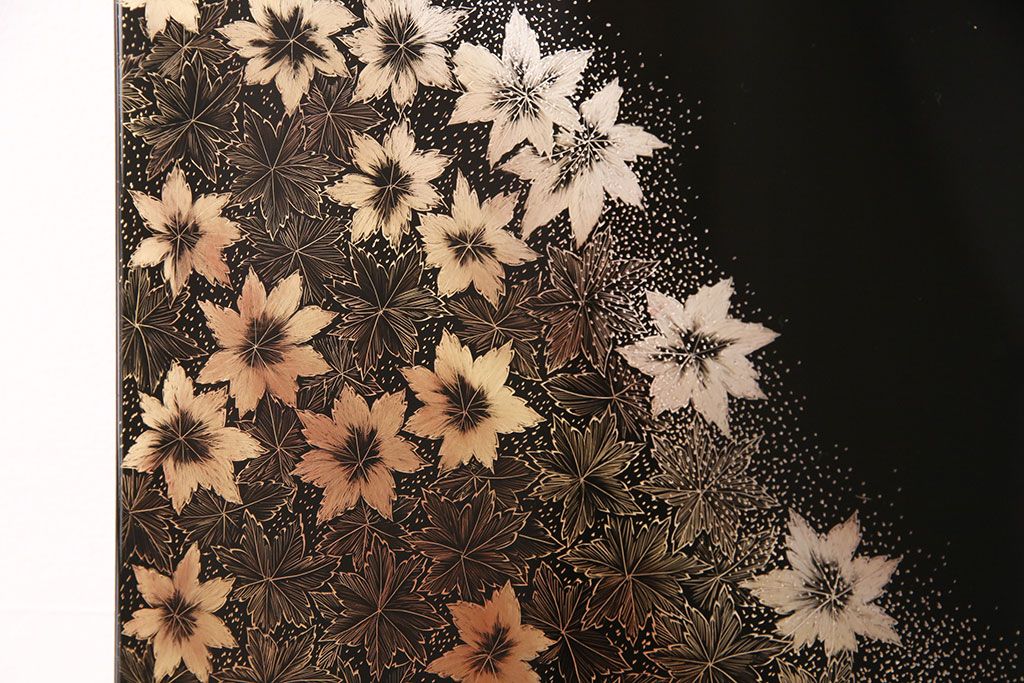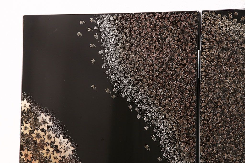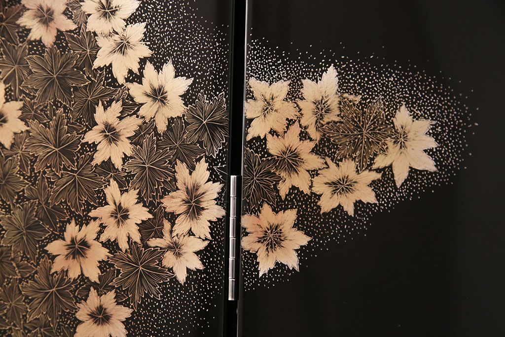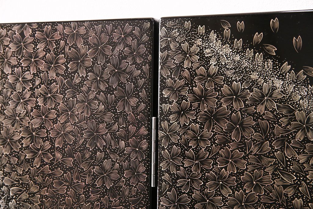 中古 美品 民芸家具 木曽塗り 3種の花の図柄が空間を彩る衝立(つい立て、パーテーション)(R-050410)