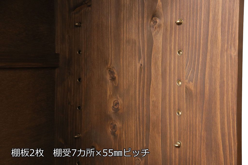 棚板は取り外しできます。棚板は2枚あります。棚受けは7ヶ所、55mmピッチで調整できます。棚幅サイズのものが1枚の作りです。