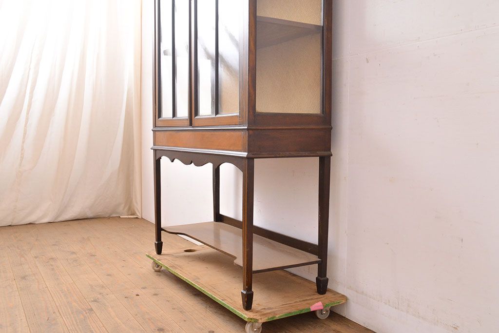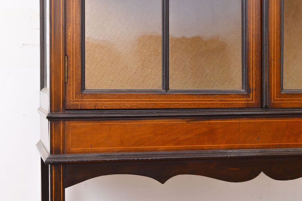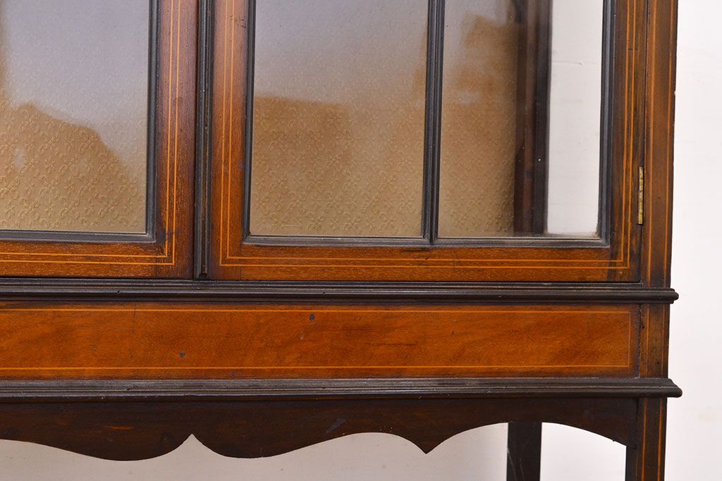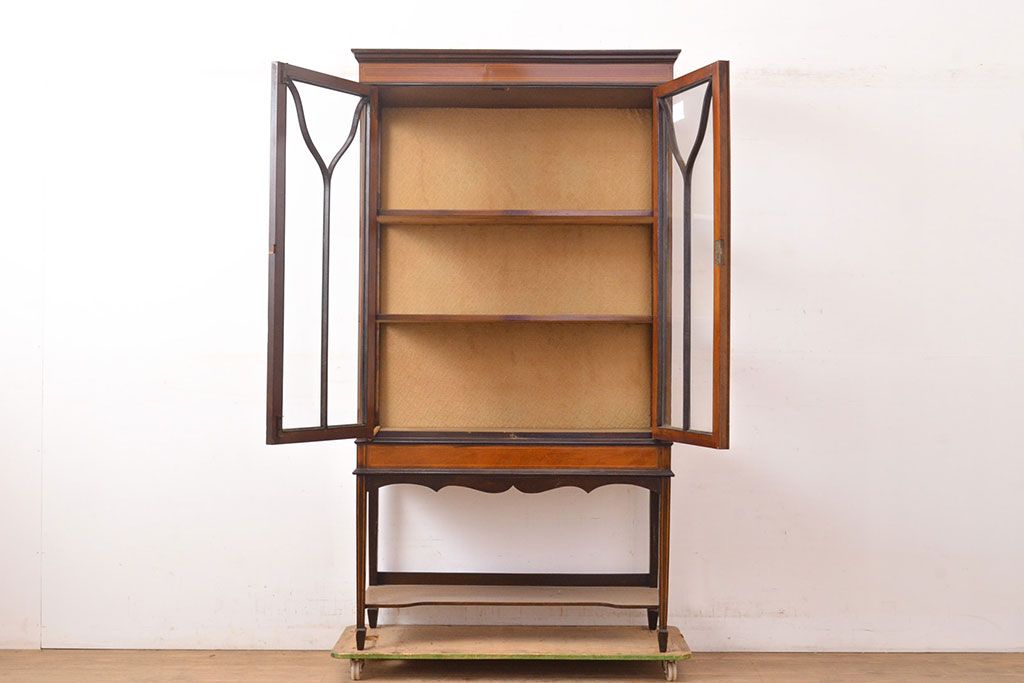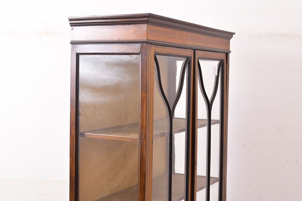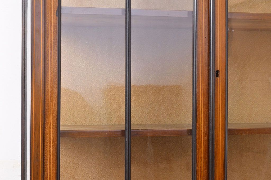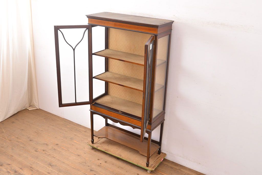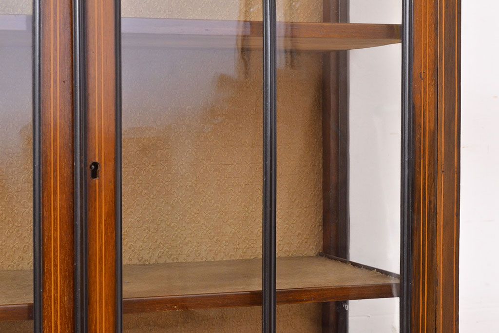 イギリスアンティーク 象嵌入り! シャープな雰囲気の飾り棚(ガラスケース、ショーケース、キャビネット)(R-050241)