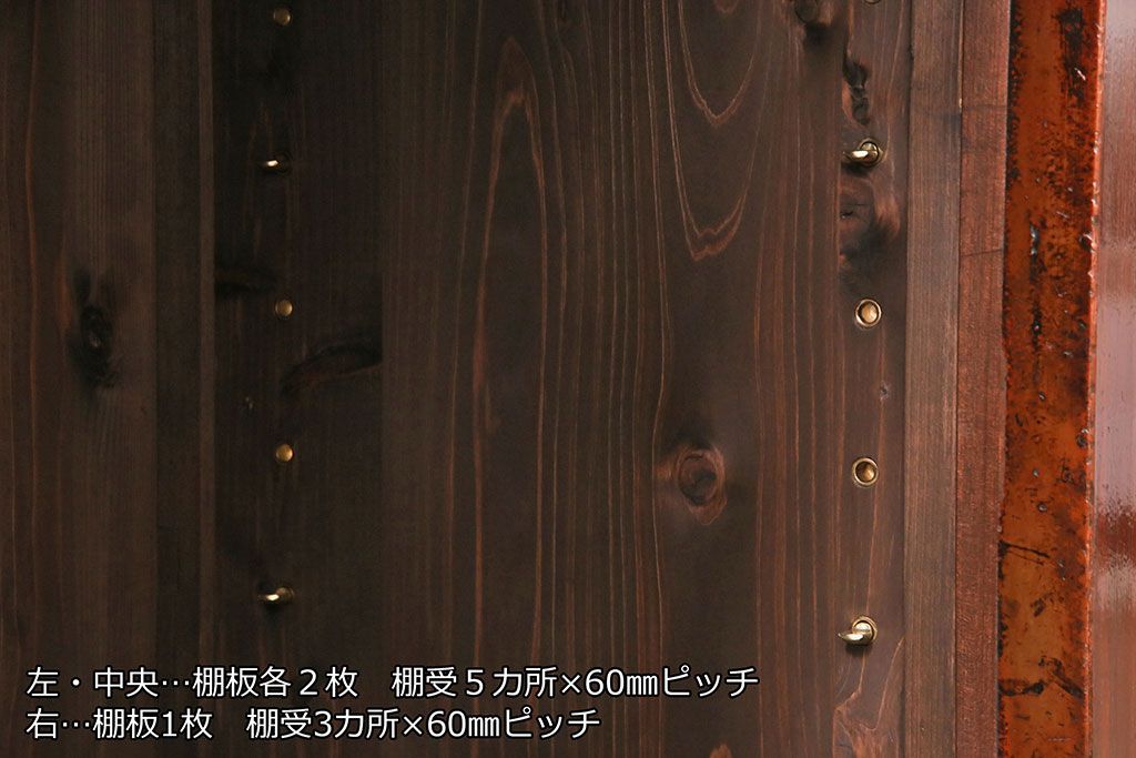 棚板は取り外しできます。左の棚板は各2枚あります。棚受けは5ヶ所、60mmピッチで調整できます。右の棚板は1枚あります。棚受けは3ヶ所、60mmピッチで調整できます。棚幅サイズのものが1枚の作りです。
