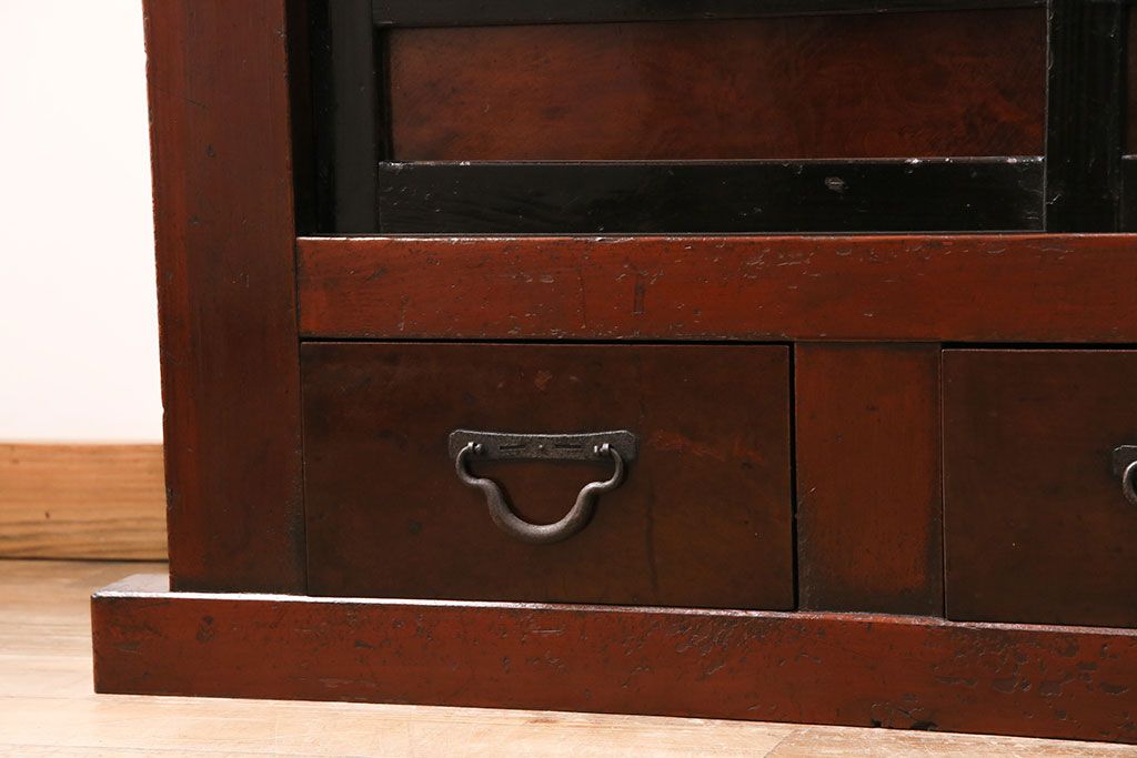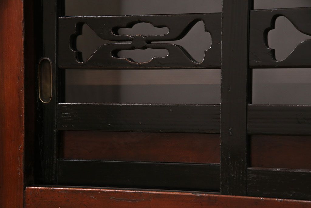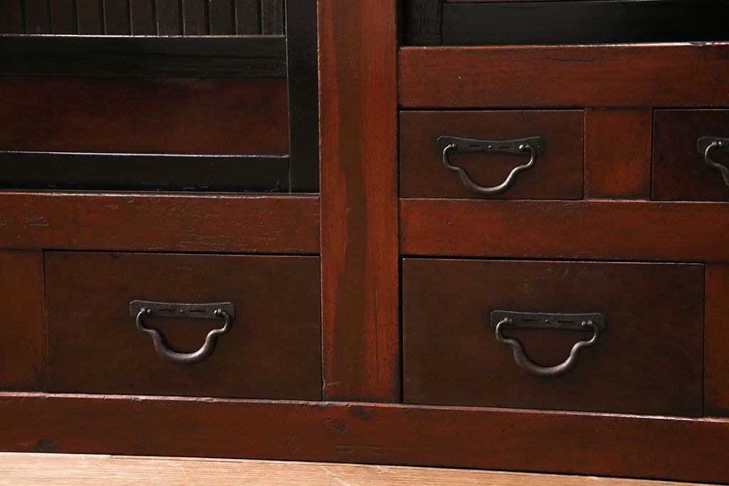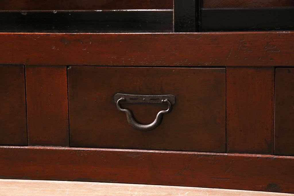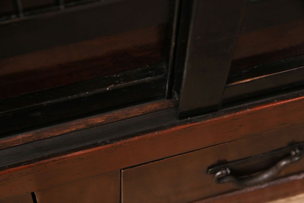 和箪笥> 水屋箪笥 > 明治期の水屋箪笥・上段をリペア&カスタム!高さと奥行きをリサイズ。建具の金網をクリアガラスに変更。可動式の棚板を設置。天板を取り付け。(食器棚、収納棚、戸棚)