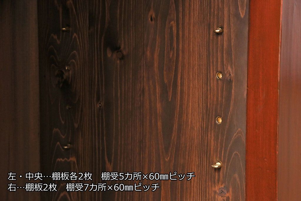 棚板は取り外しできます。棚板は左右各2枚あります。棚受けは左は5ヶ所、右は7ヶ所、各60mmピッチで調整できます。棚幅サイズのものが1枚の作りです。