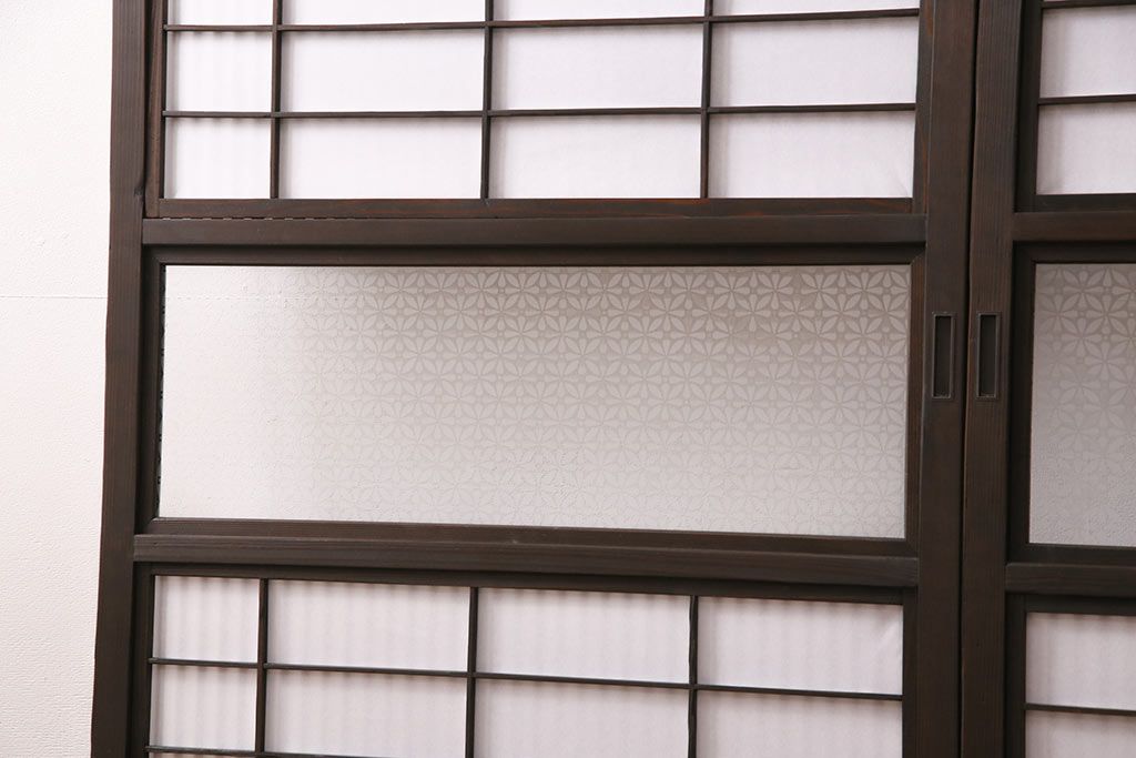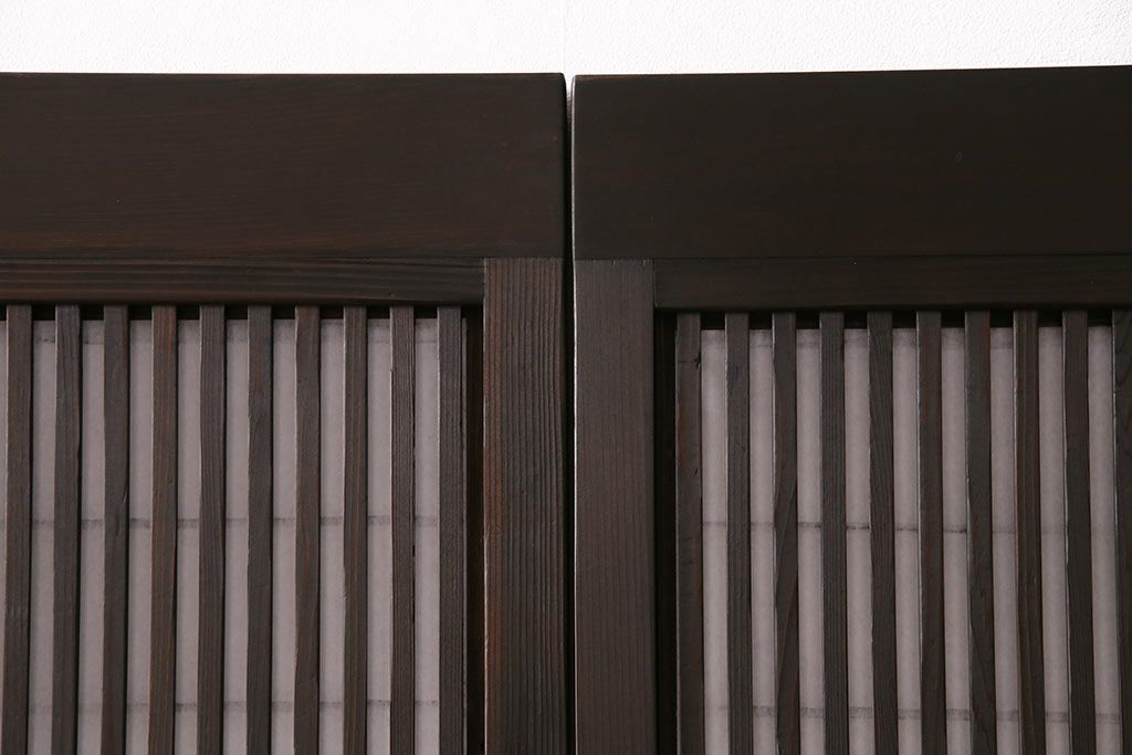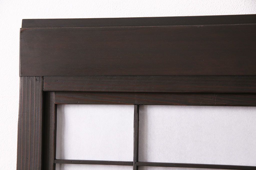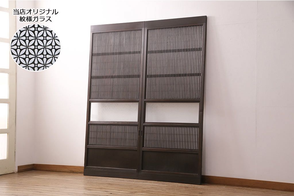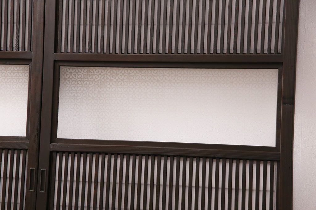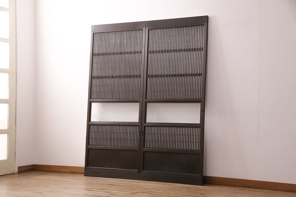 ドア・建具> 格子戸 > 格子戸2枚をリペア&カスタム!設置場所に合わせてリサイズ。裏障子は破れにくい障子紙に張り替え。ガラスは花菱模様ガラスに入れ替え。濃い茶色で着色し仕上げ。(引き戸、建具)