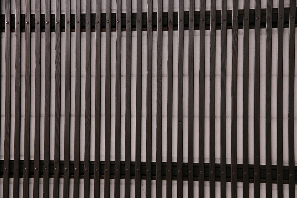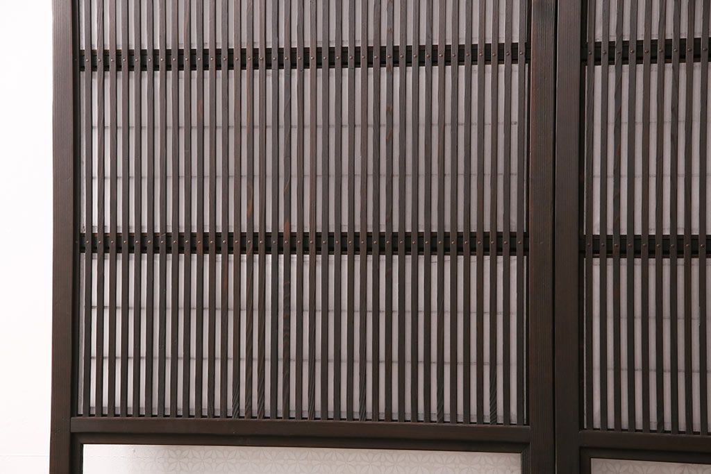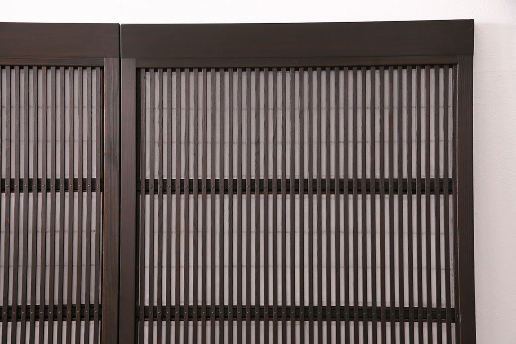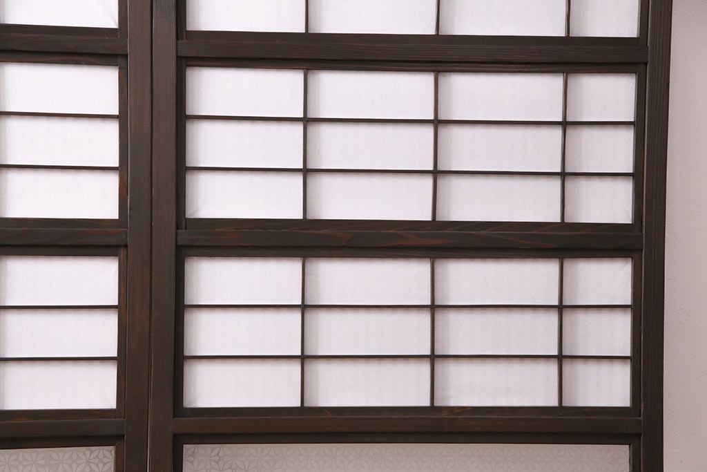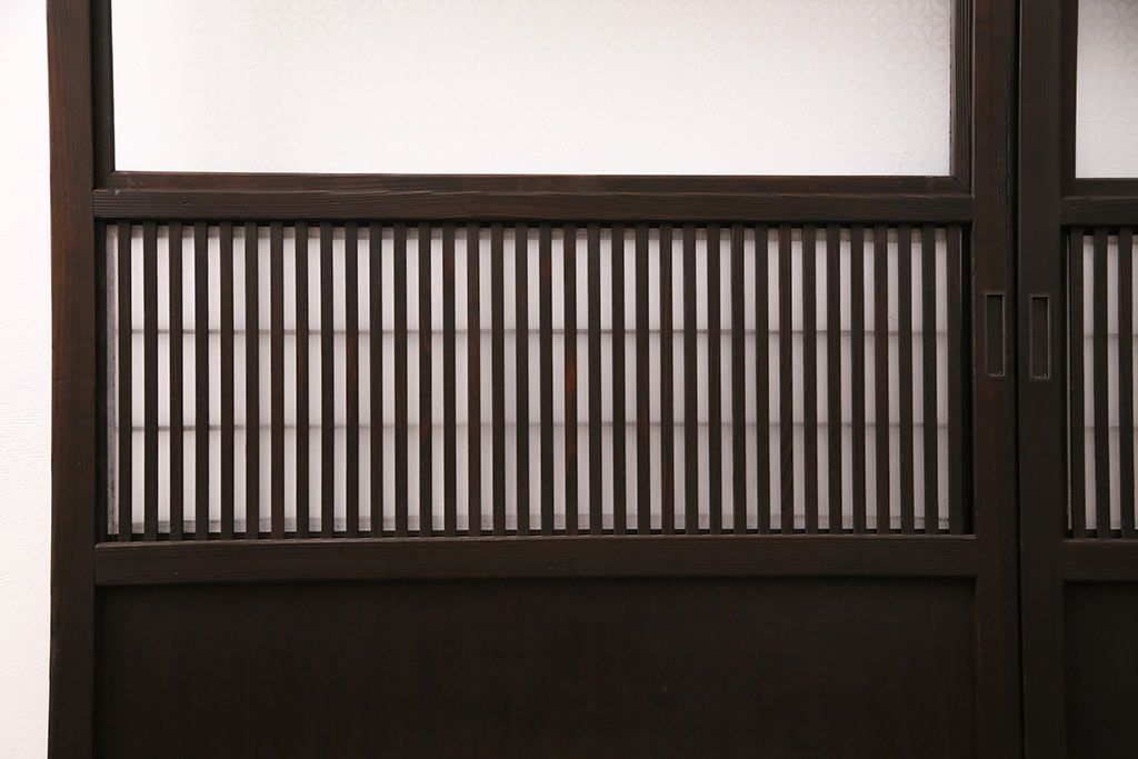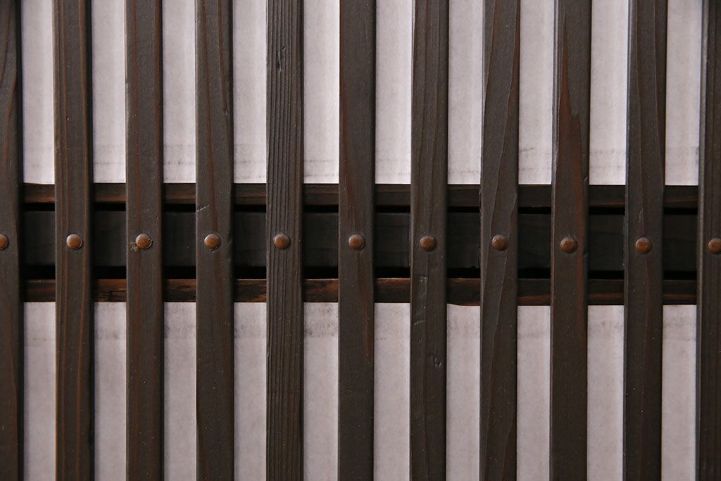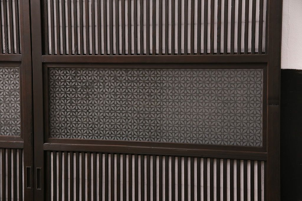 ドア・建具> 格子戸 > 格子戸2枚をリペア&カスタム!設置場所に合わせてリサイズ。裏障子は破れにくい障子紙に張り替え。ガラスは花菱模様ガラスに入れ替え。濃い茶色で着色し仕上げ。(引き戸、建具)