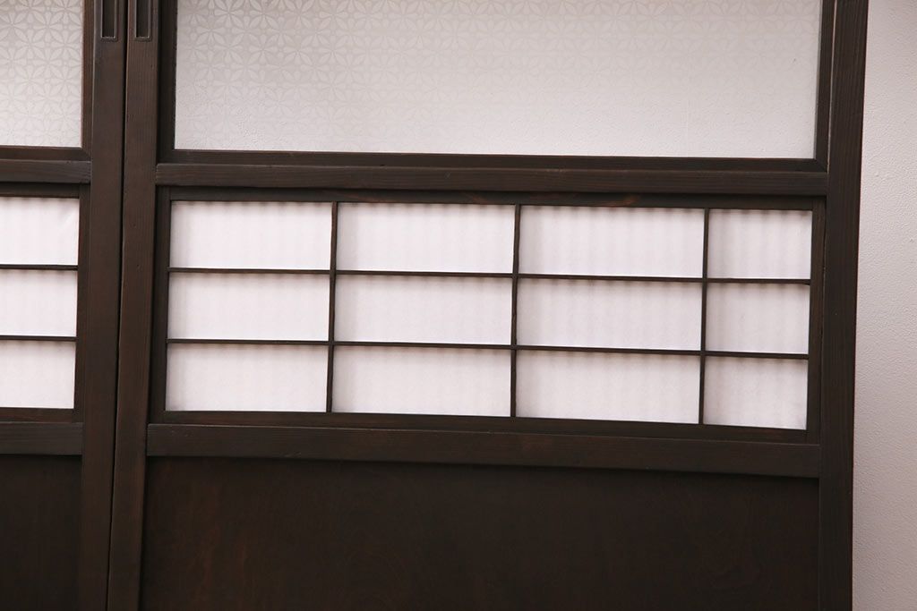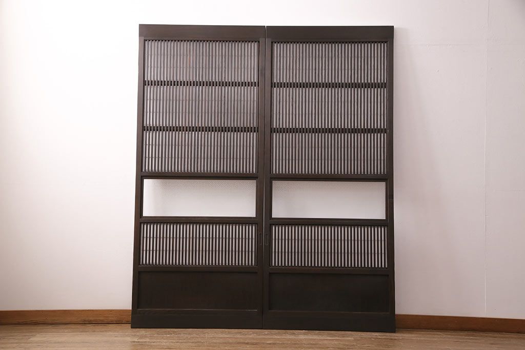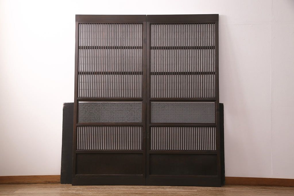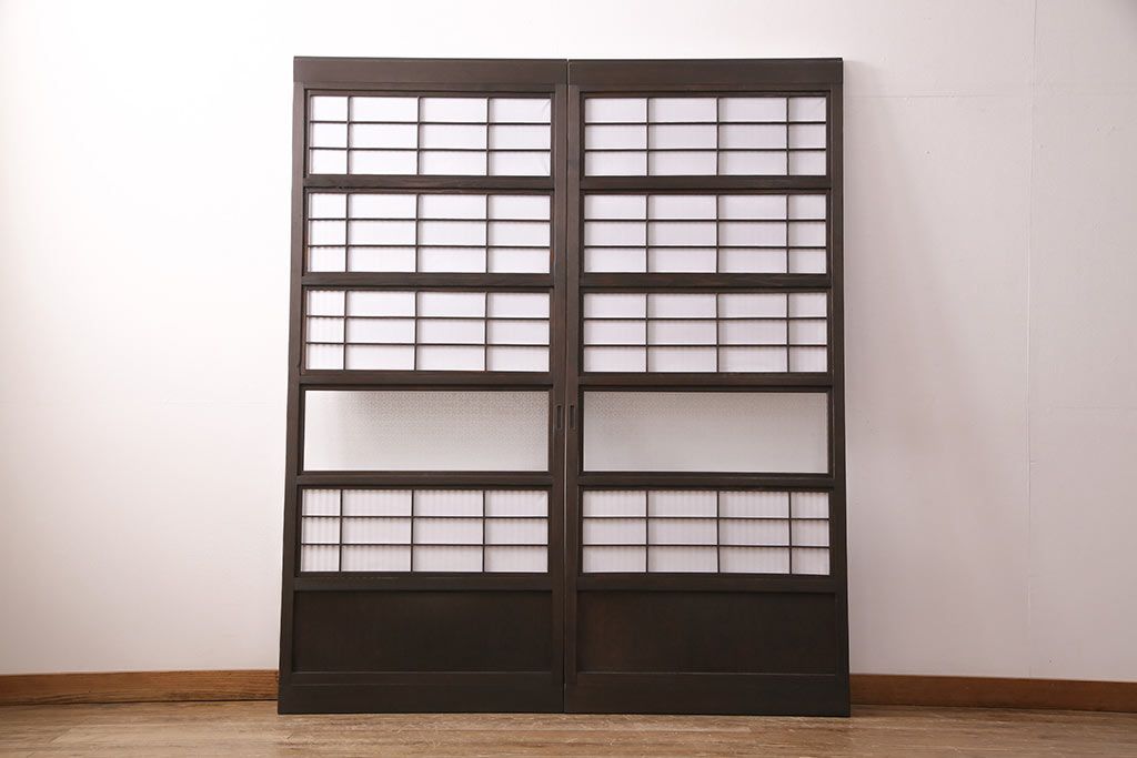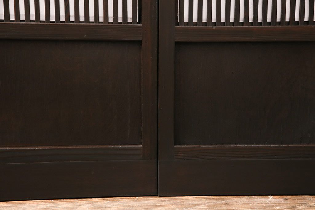 ドア・建具> 2枚・3枚セット > 格子戸2枚をリペア&カスタム!設置場所に合わせてリサイズ。裏障子は破れにくい障子紙に張り替え。ガラスは花菱模様ガラスに入れ替え。濃い茶色で着色し仕上げ。(引き戸、建具)