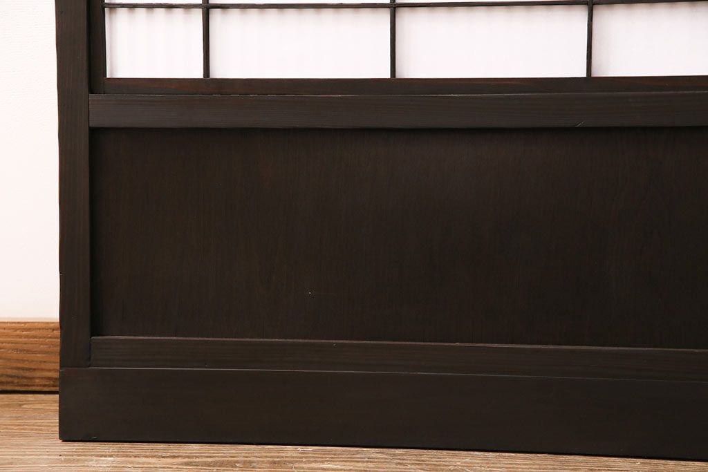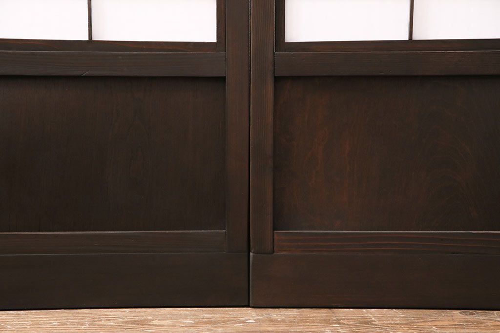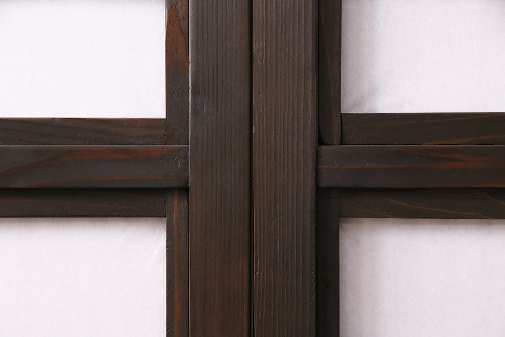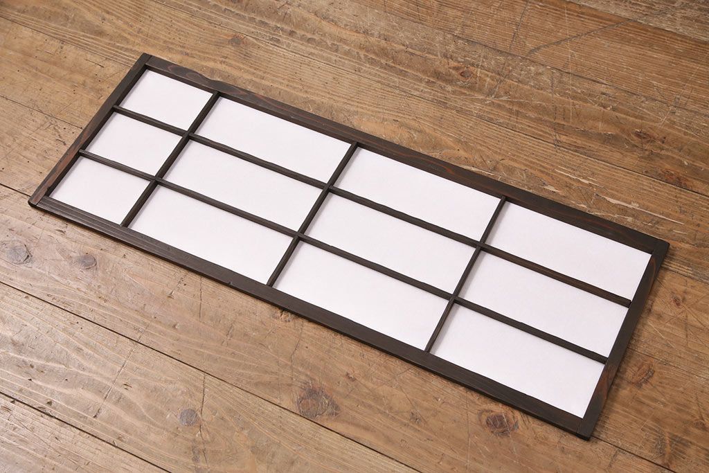 格子戸2枚をリペア&カスタム!設置場所に合わせてリサイズ。裏障子は破れにくい障子紙に張り替え。ガラスは花菱模様ガラスに入れ替え。濃い茶色で着色し仕上げ。(引き戸、建具)