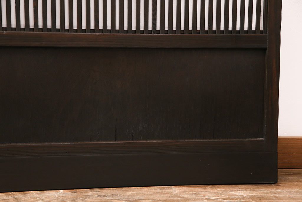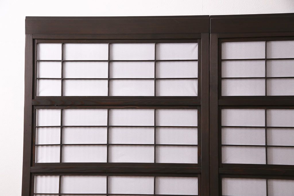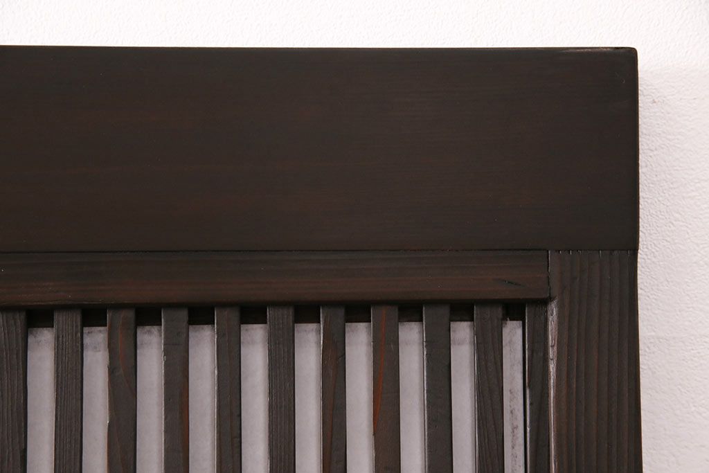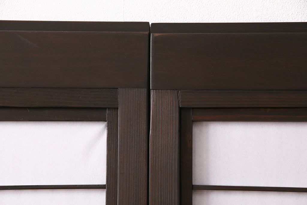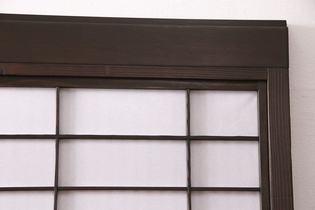格子戸2枚をリペア&カスタム!設置場所に合わせてリサイズ。裏障子は破れにくい障子紙に張り替え。ガラスは花菱模様ガラスに入れ替え。濃い茶色で着色し仕上げ。(引き戸、建具)