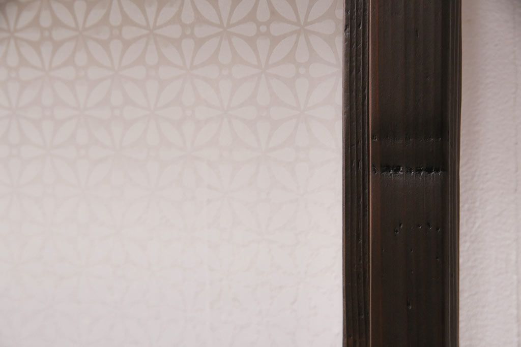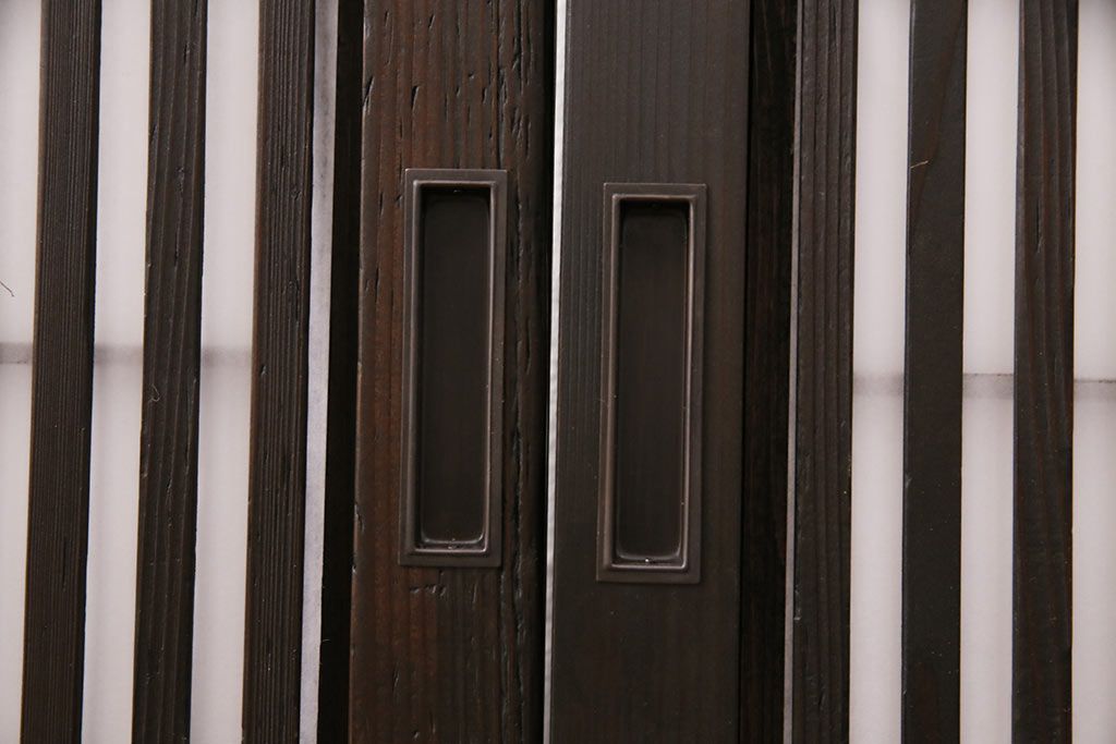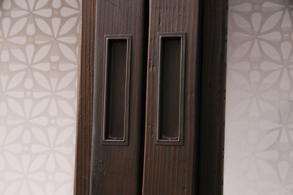ドア・建具> 引き戸 > 格子戸2枚をリペア&カスタム!設置場所に合わせてリサイズ。裏障子は破れにくい障子紙に張り替え。ガラスは花菱模様ガラスに入れ替え。濃い茶色で着色し仕上げ。(引き戸、建具)