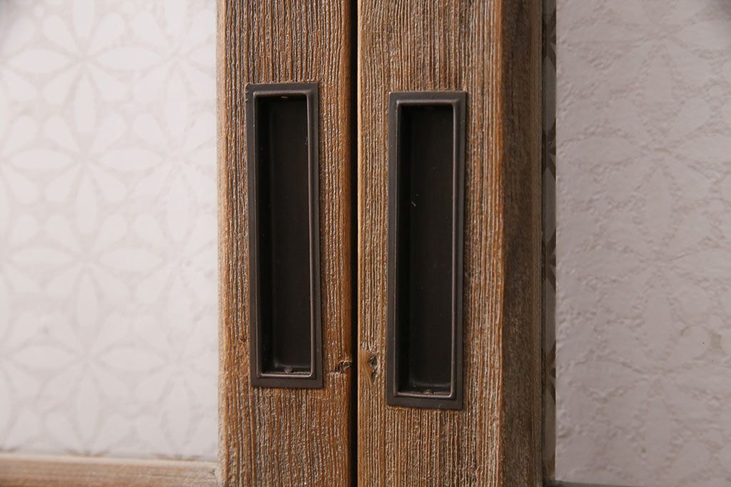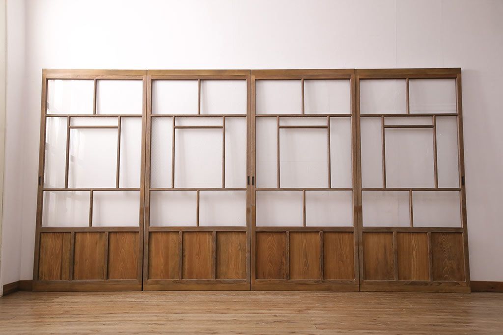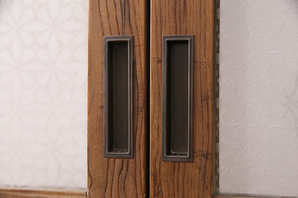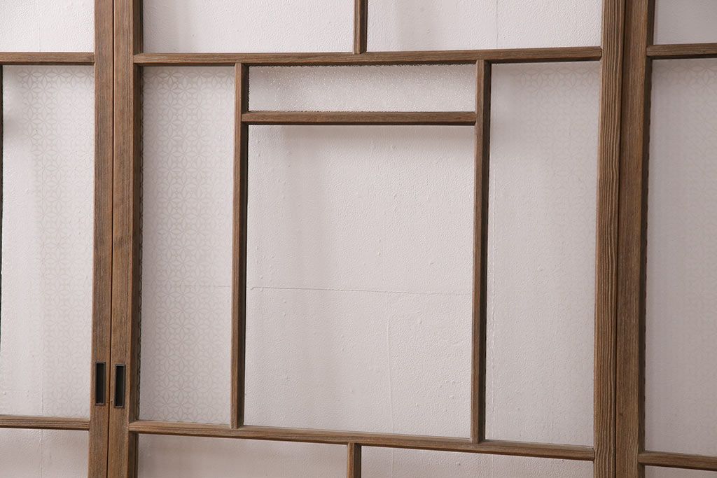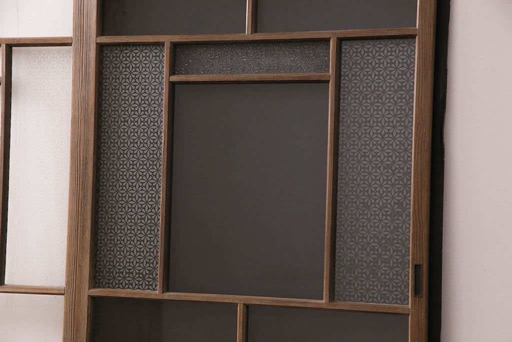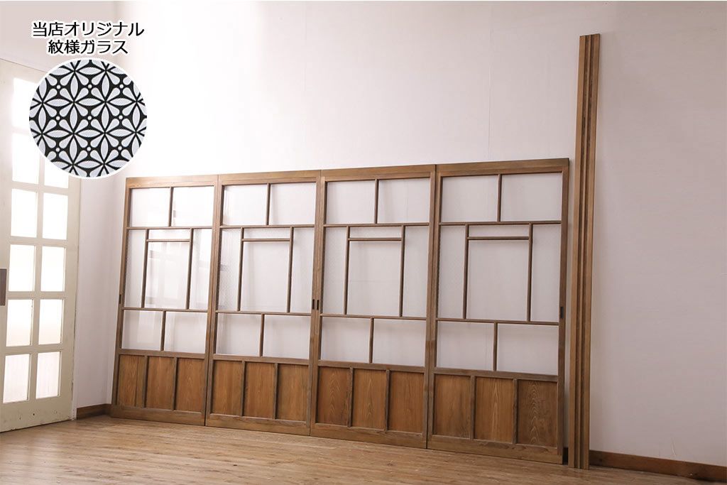 ドア・建具> 引き戸 > 昭和初期のガラス戸4枚をリペア&カスタム!設置場所に合わせてリサイズ。引手と戸車を取り付け。クリアガラス、ダイヤガラス、ゆらゆらガラス、変わり花菱模様ガラスに差し替え。クリアワックス仕上げ。戸枠を新たに製作。(引き戸、建具)