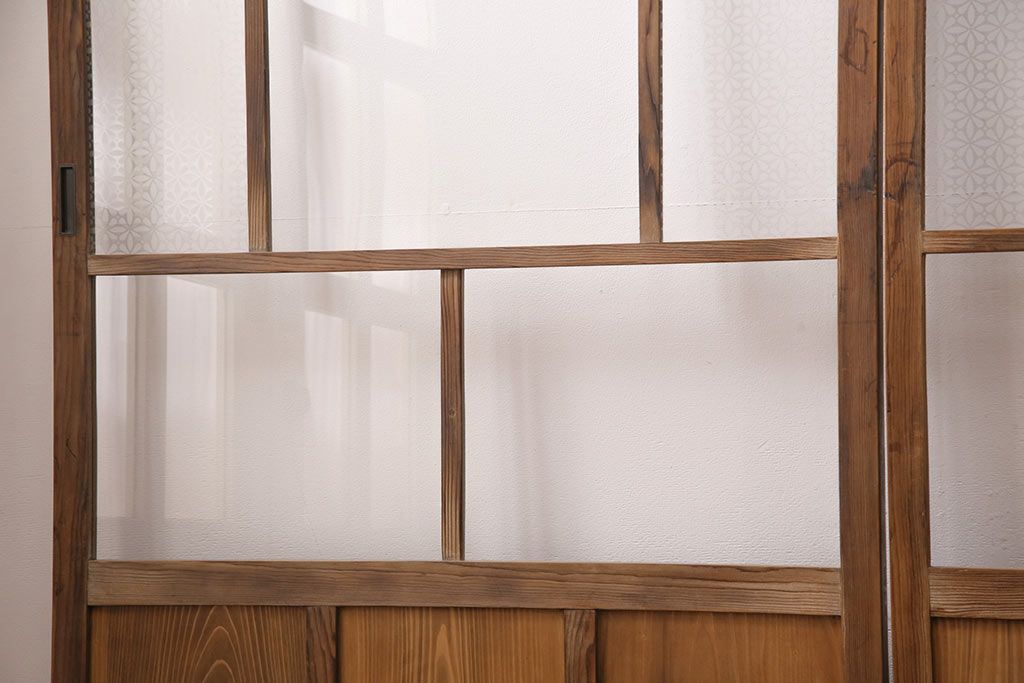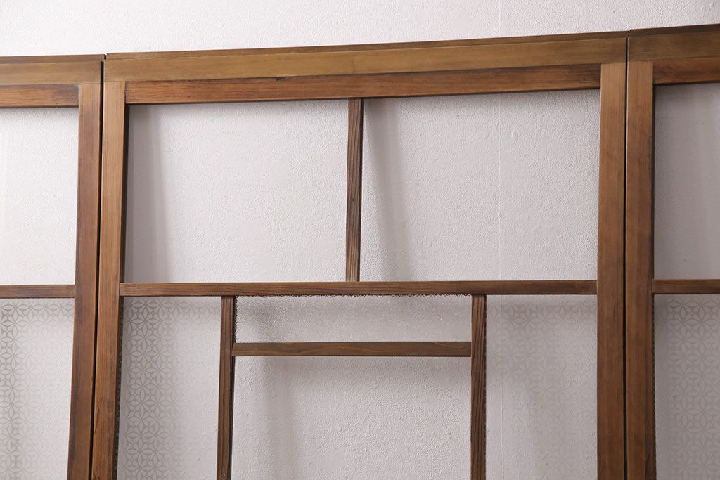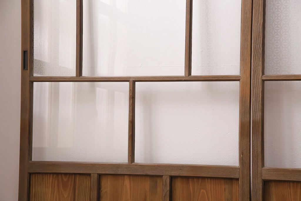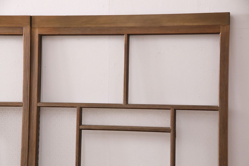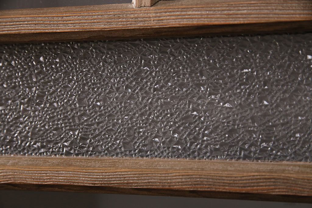 ドア・建具> ガラス戸 > 昭和初期のガラス戸4枚をリペア&カスタム!設置場所に合わせてリサイズ。引手と戸車を取り付け。クリアガラス、ダイヤガラス、ゆらゆらガラス、変わり花菱模様ガラスに差し替え。クリアワックス仕上げ。戸枠を新たに製作。(引き戸、建具)