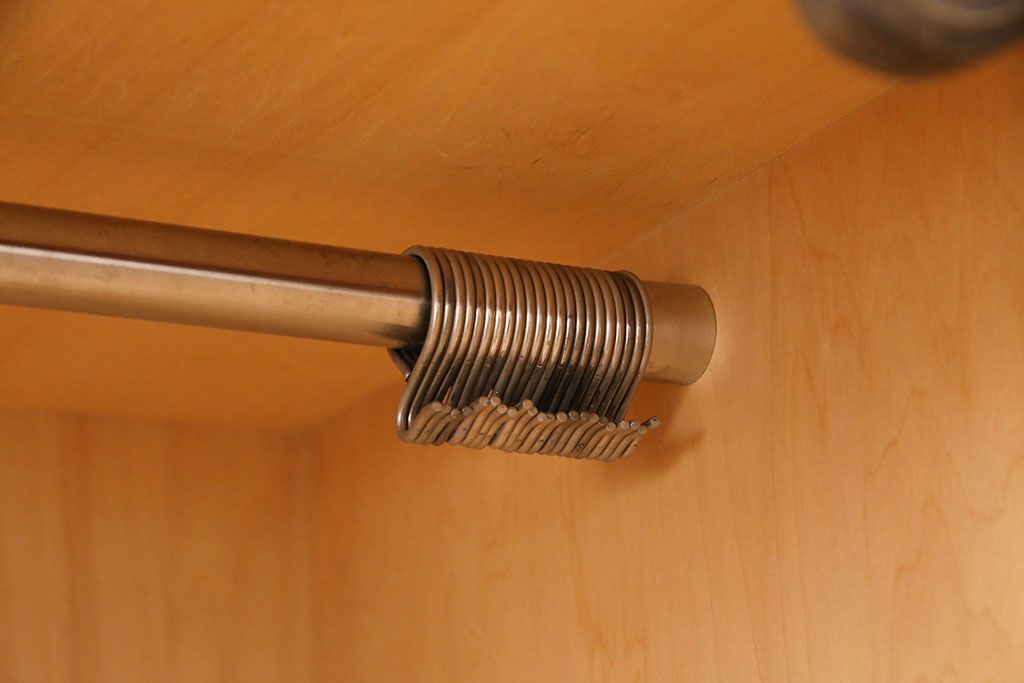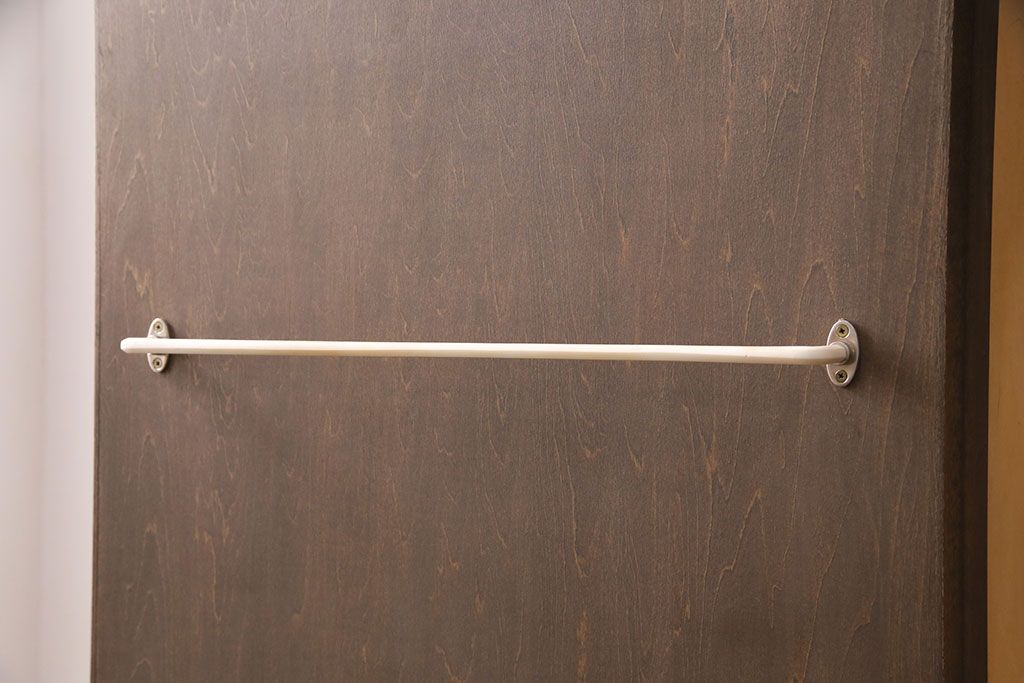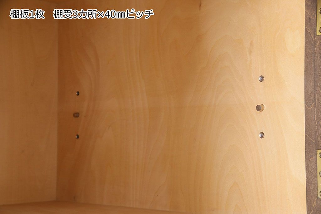 棚板は取り外しできます。棚板は1枚あります。棚受けは3ヶ所、40mmピッチで調整できます。棚幅サイズのものが1枚の作りです。