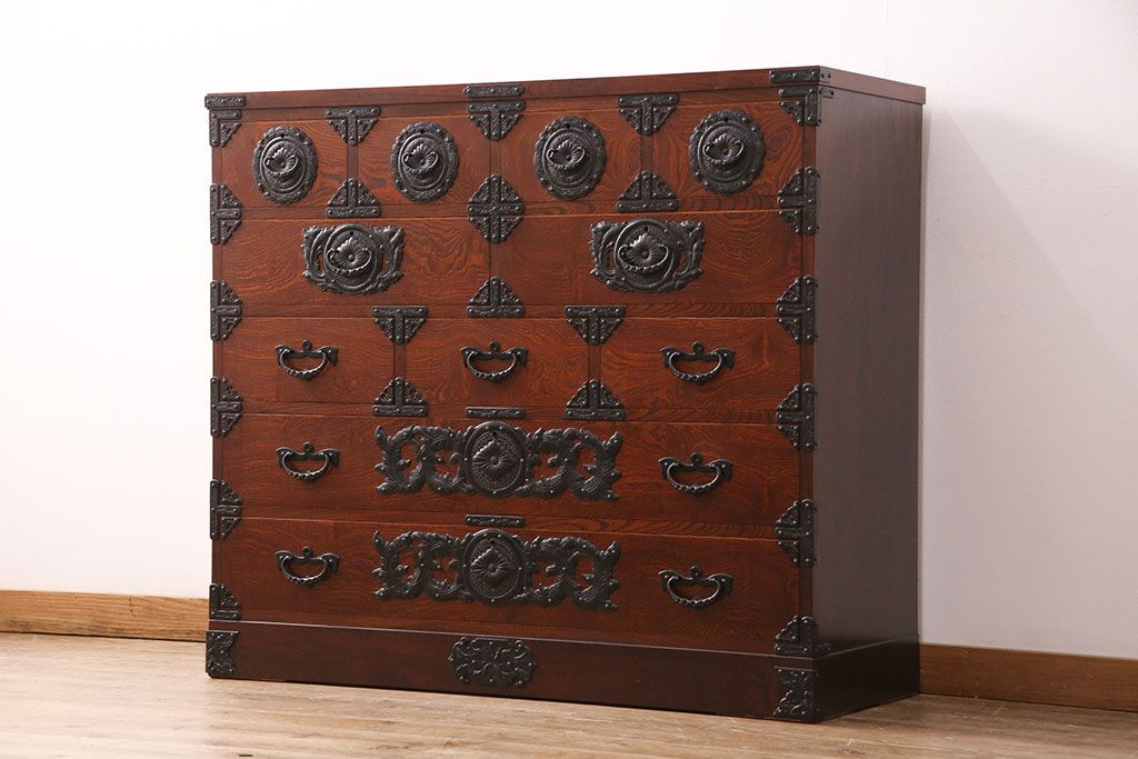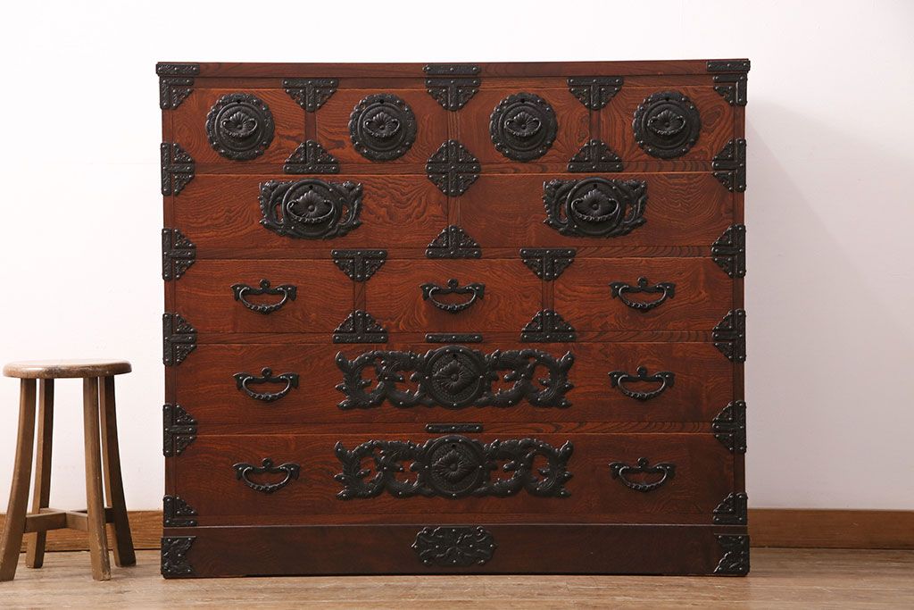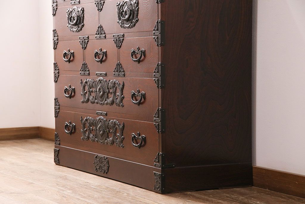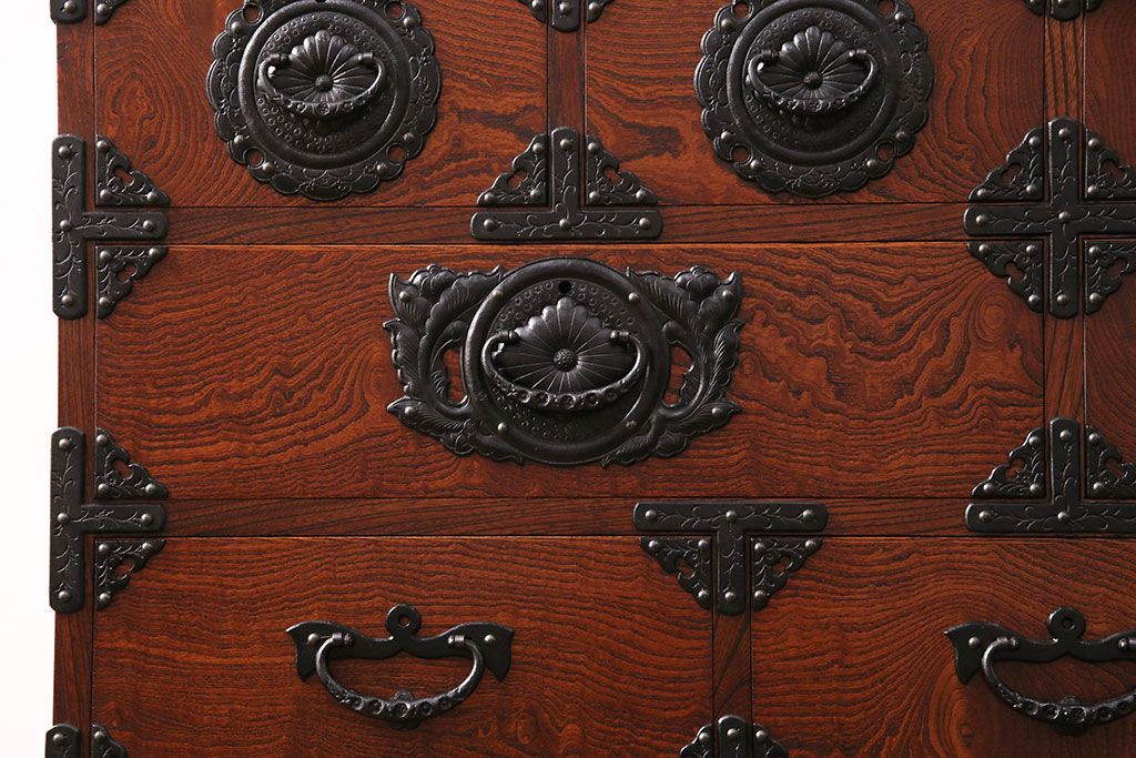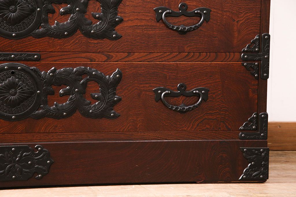 中古 美品 岩谷堂箪笥 黒々とした迫力のある金具が目を引く整理箪笥(収納タンス、衣装箪笥、引き出し)(R-050470)