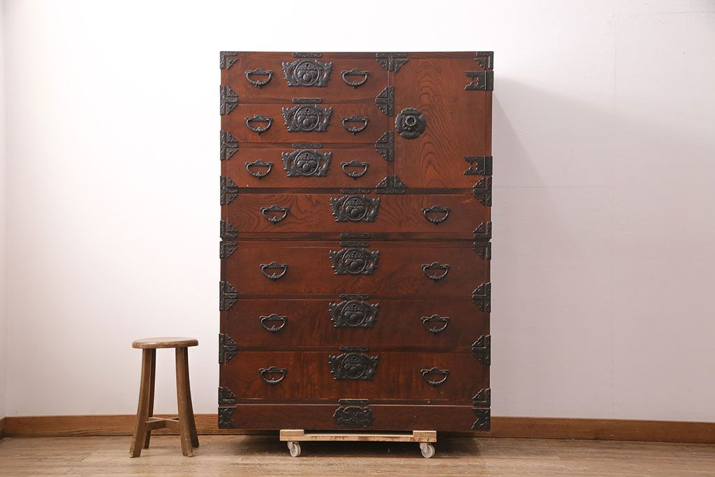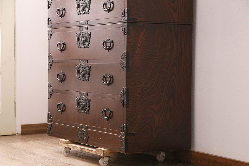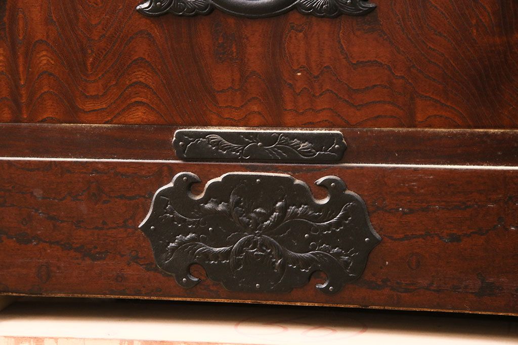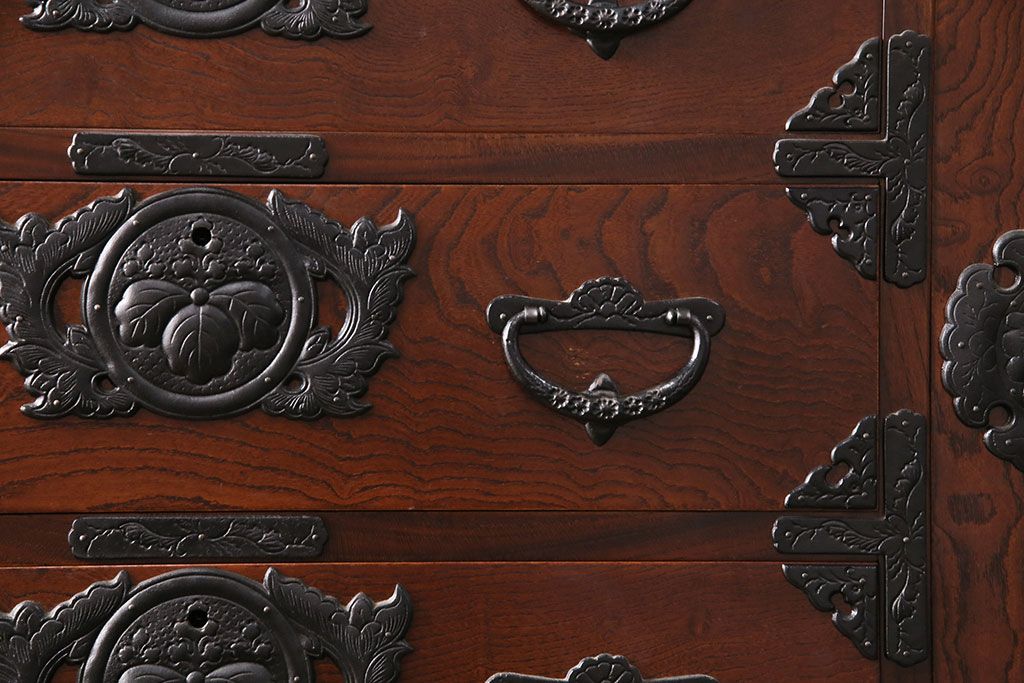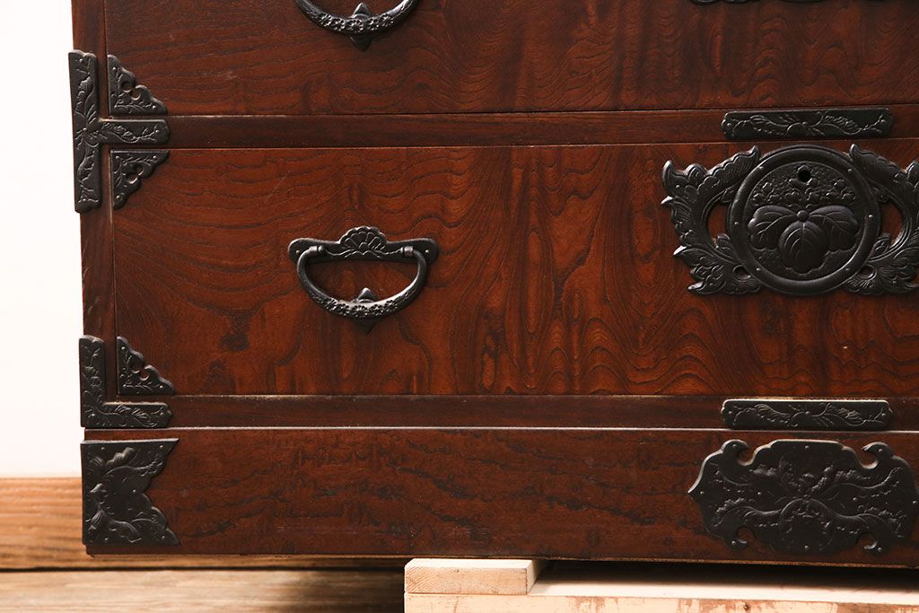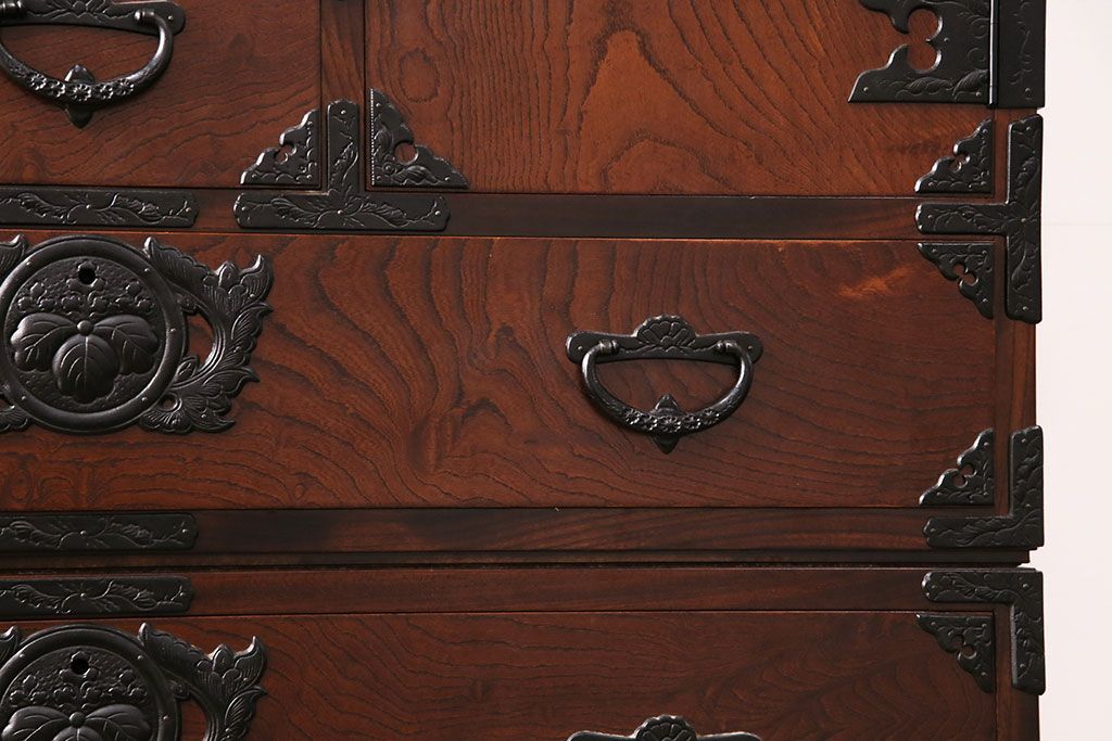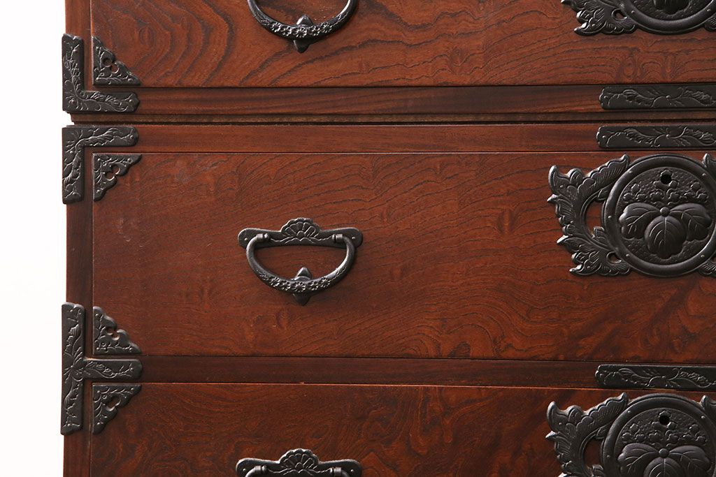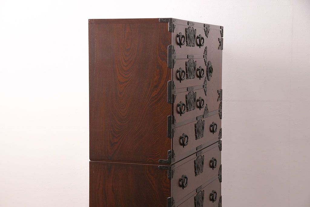 ラフジュ工房> 和箪笥> 衣装箪笥 > 中古 岩谷堂箪笥 黒々とした金具が堂々とした存在感を放つ重ね箪笥(引き出し、衣装箪笥、収納タンス、上下バラ売り可能)(R-050473)