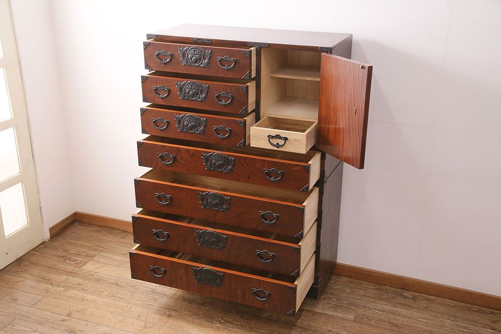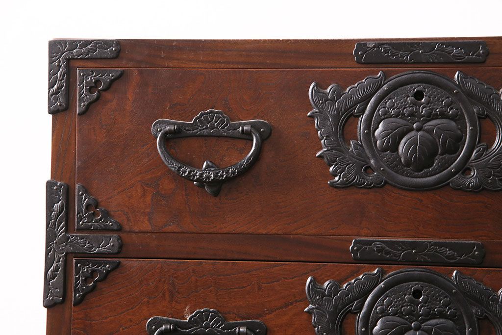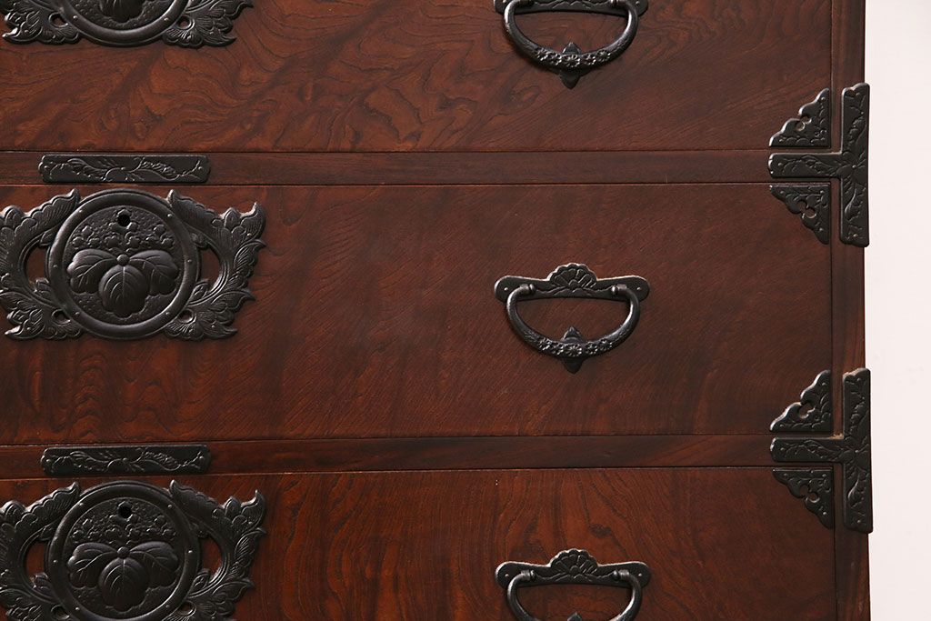 中古 岩谷堂箪笥 黒々とした金具が堂々とした存在感を放つ重ね箪笥(引き出し、衣装箪笥、収納タンス、上下バラ売り可能)(R-050473)