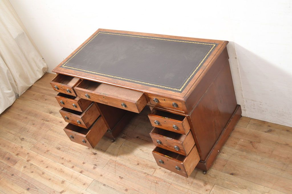 イギリスアンティーク ペイント仕上げ マホガニー材 キャスター付き 天板のレザーが格好いい!組み立て式の両袖机(プレジデントデスク、ワークデスク、在宅ワーク、在宅用)(R-050237)