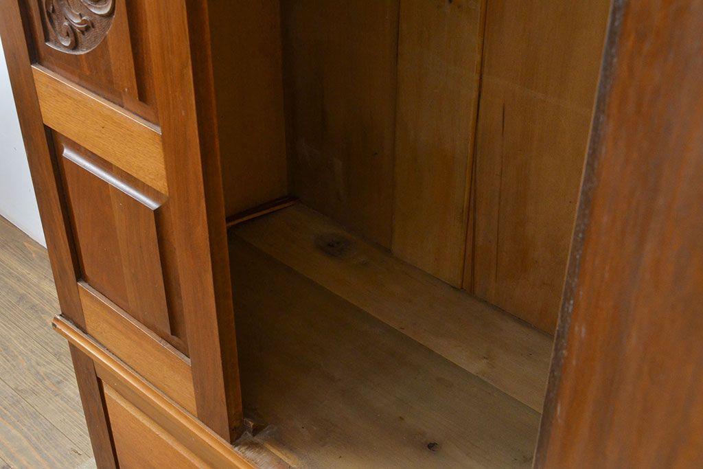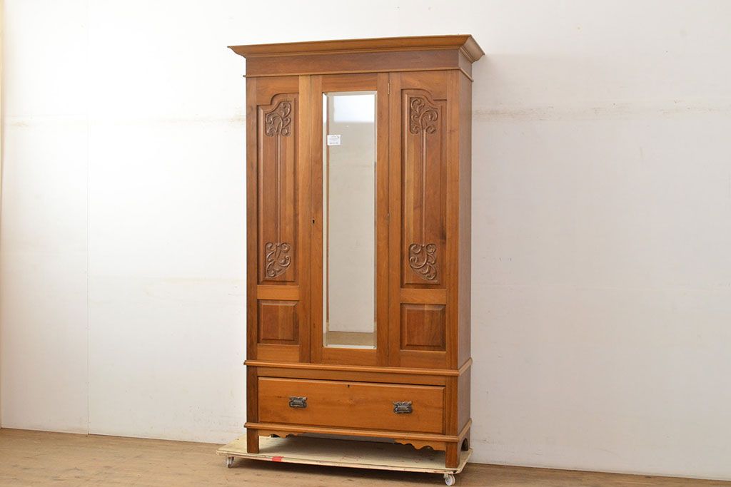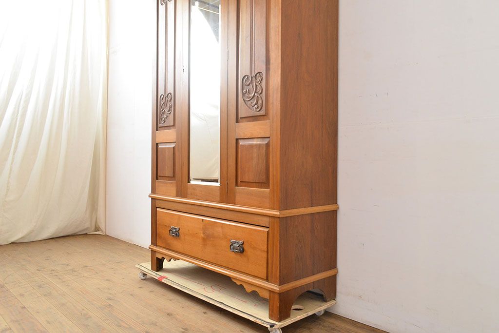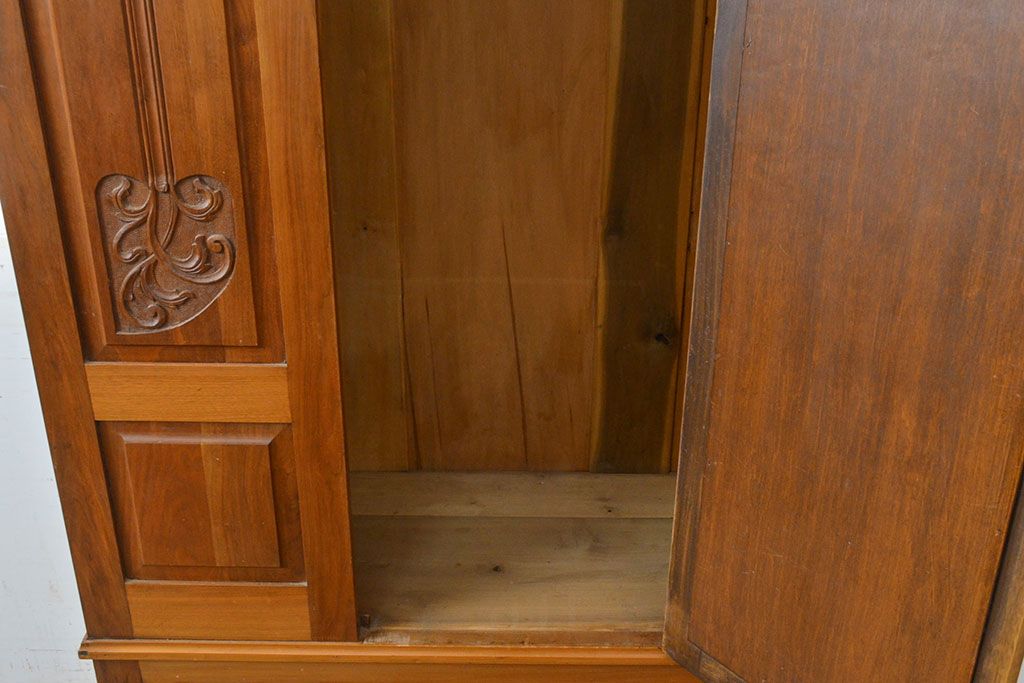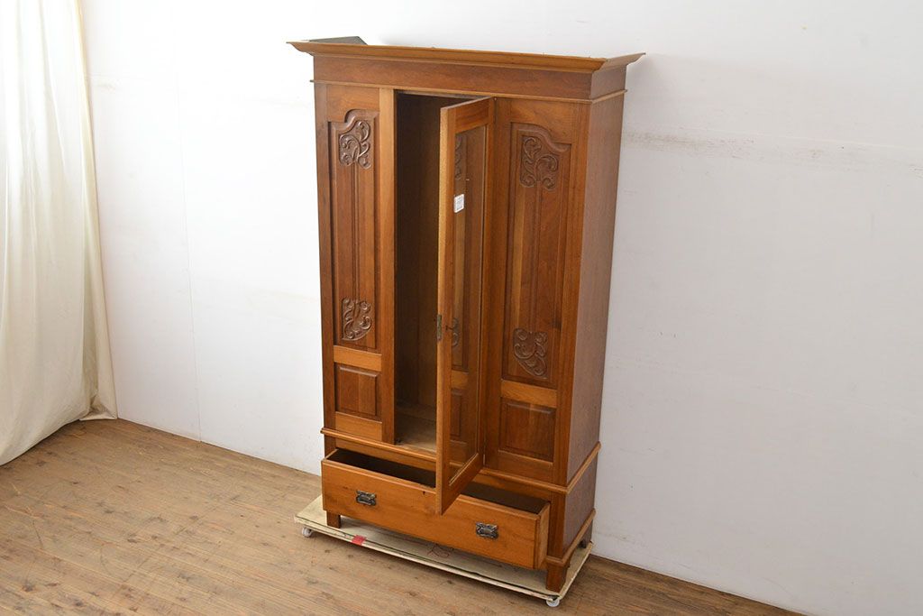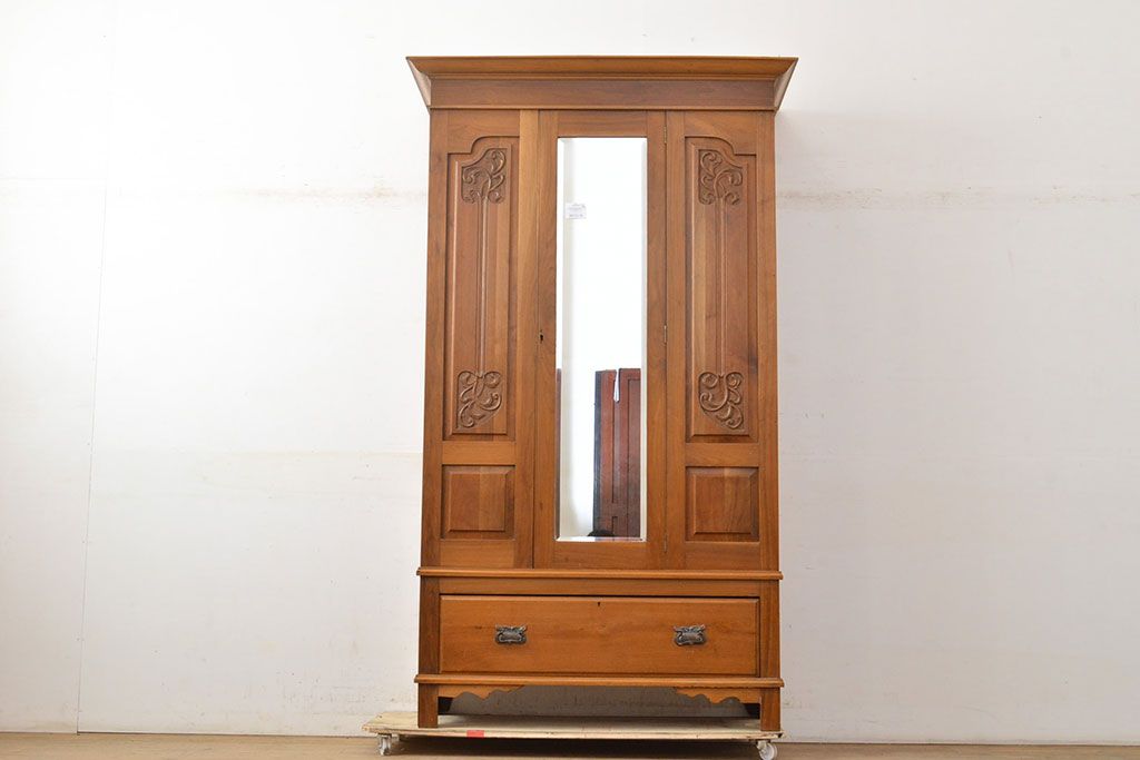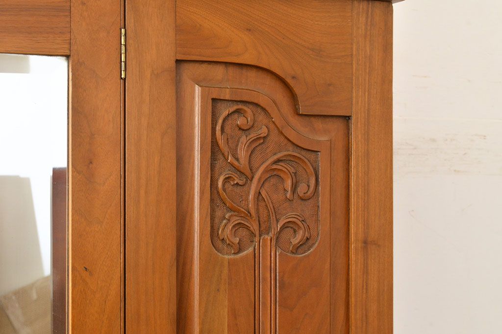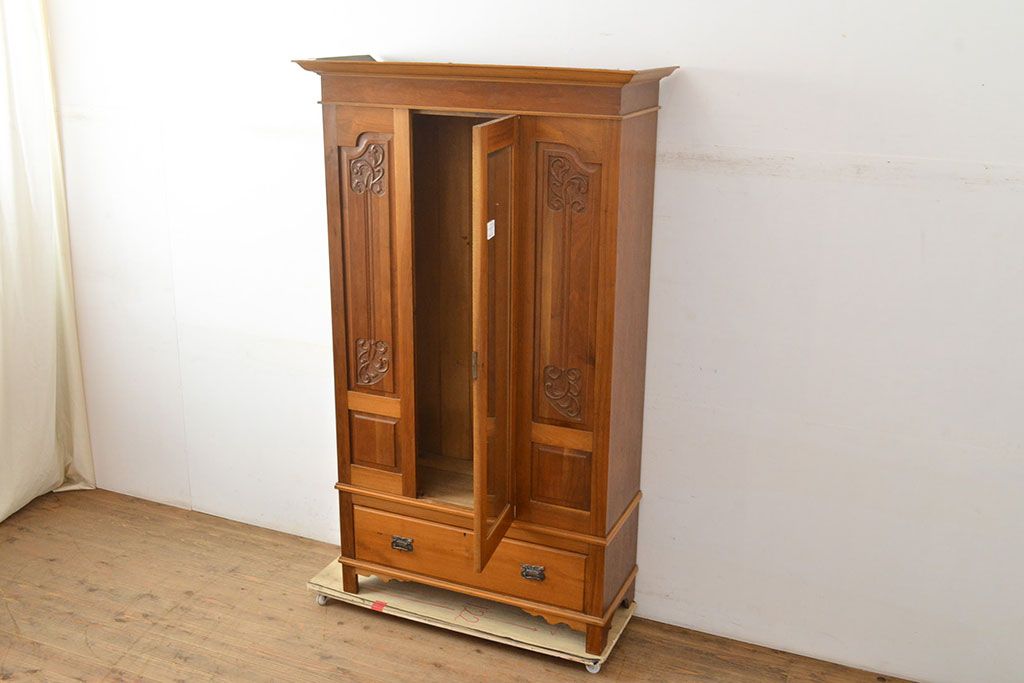 イギリスアンティーク 優雅なレリーフが品の良さを高めるウォールナット材製ワードローブ(洋服タンス、引き出し、キャビネット)(R-050247)