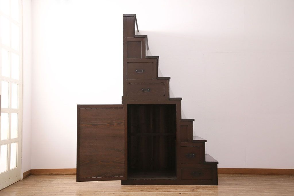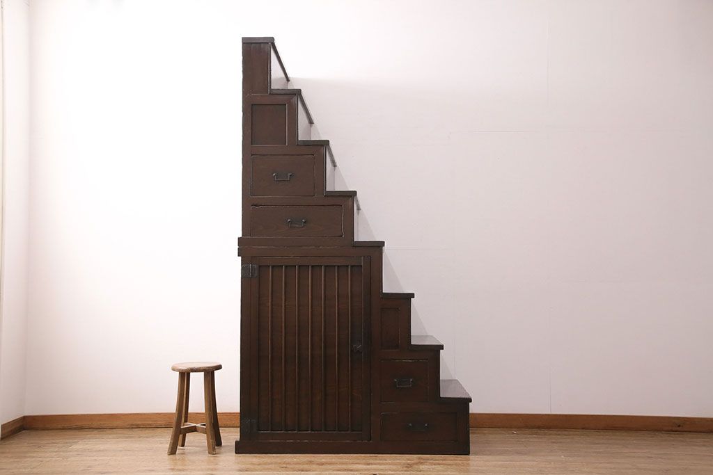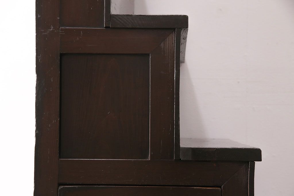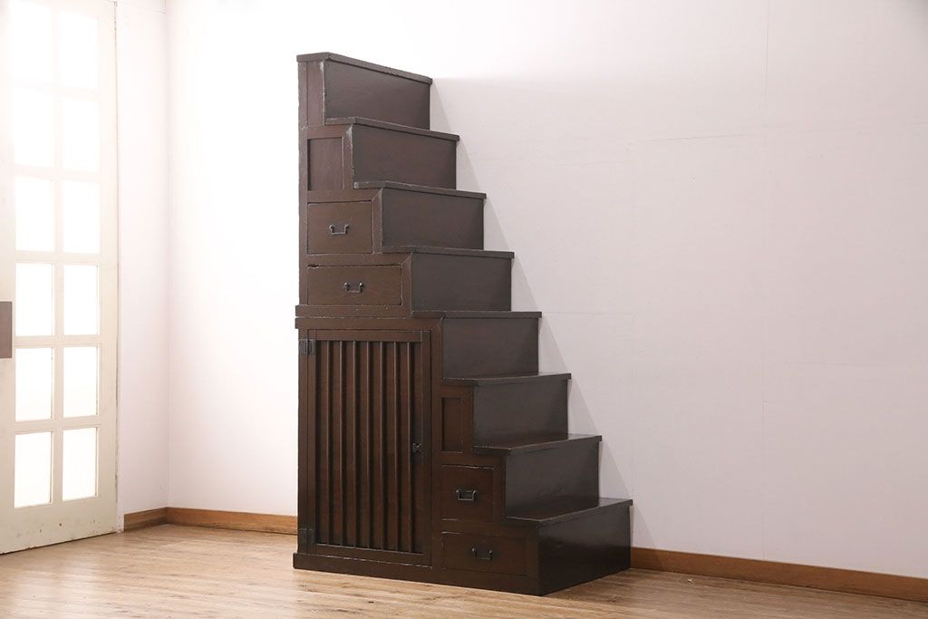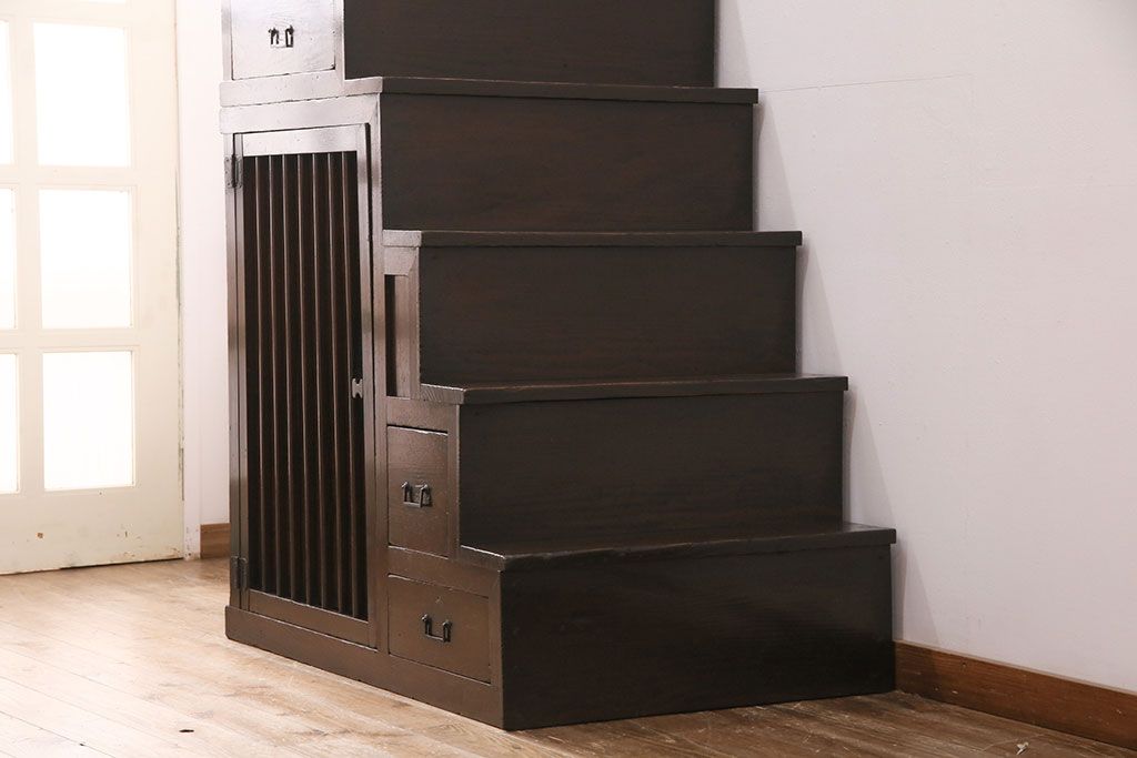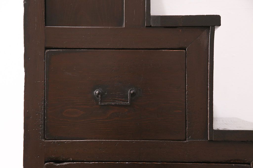 和箪笥> 階段箪笥 > 明治期の階段箪笥をリペア&カスタム!可動部の調整。背板など傷んだ箇所を張り替え。極めて黒に近い茶色に着色し仕上げ。(収納棚、時代箪笥、和タンス)