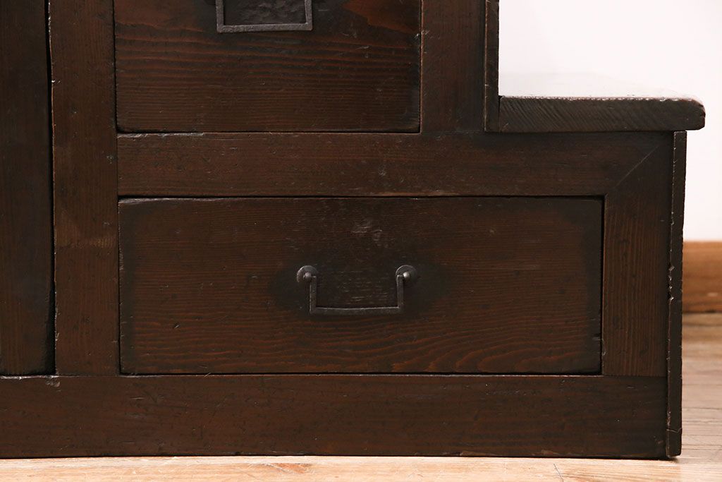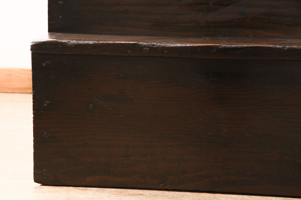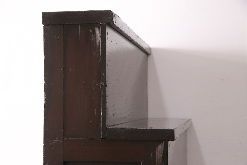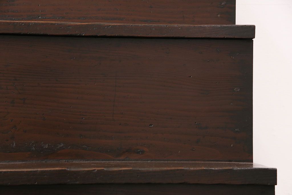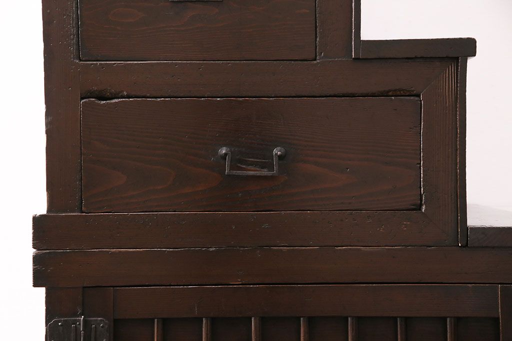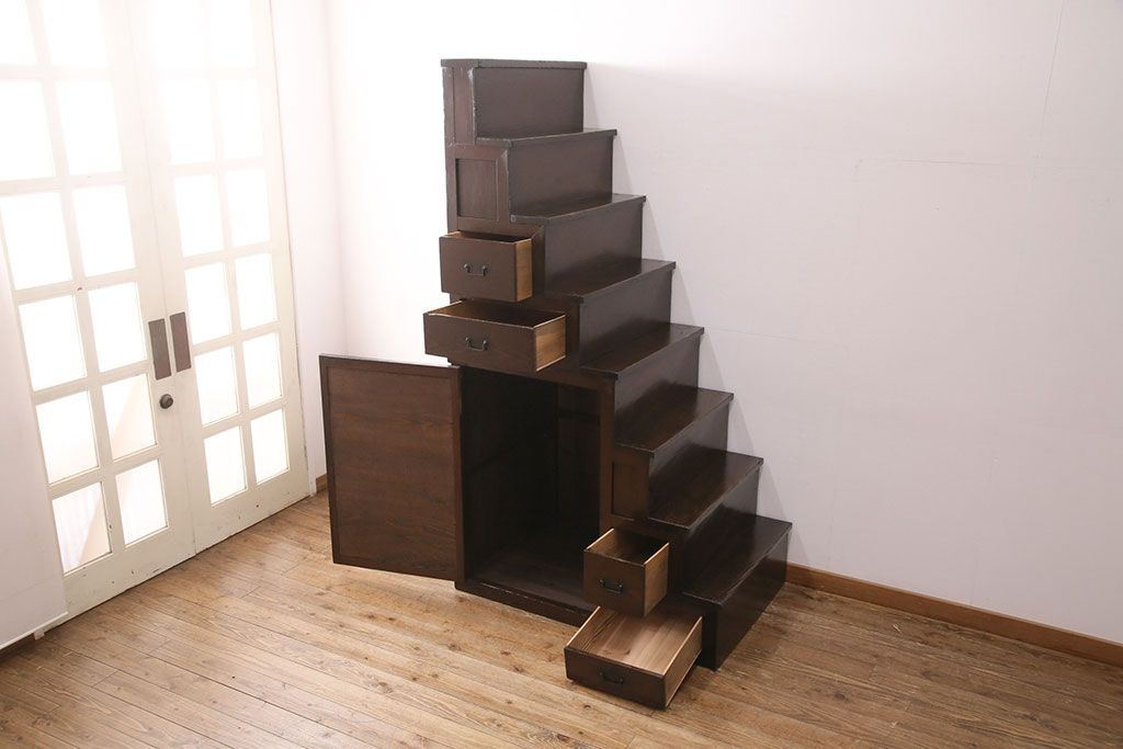 和箪笥> 階段箪笥 > 明治期の階段箪笥をリペア&カスタム!可動部の調整。背板など傷んだ箇所を張り替え。極めて黒に近い茶色に着色し仕上げ。(収納棚、時代箪笥、和タンス)