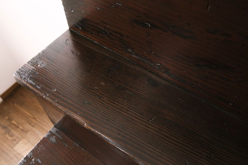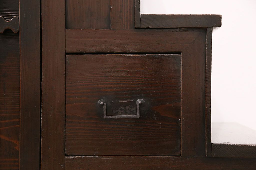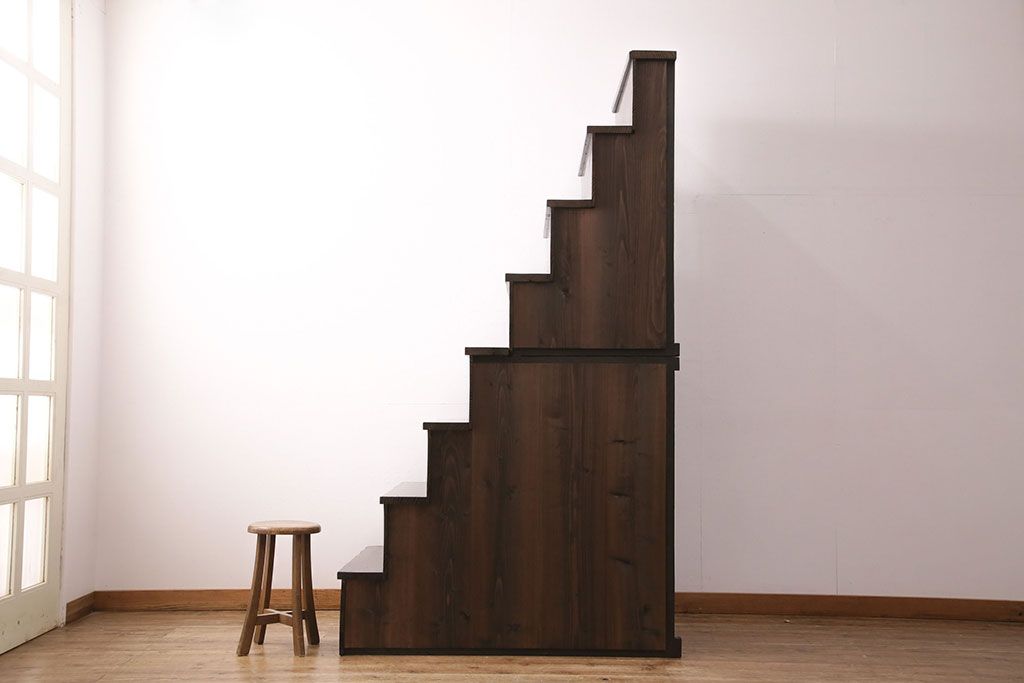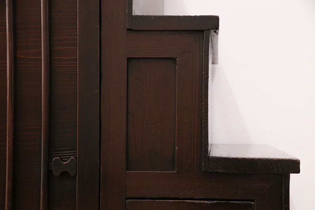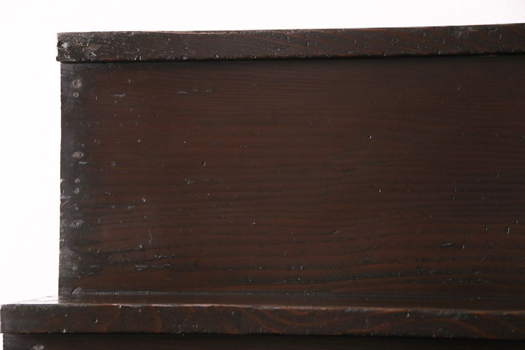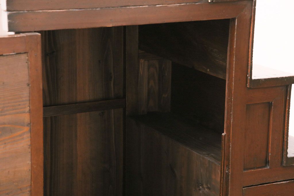 和箪笥> 階段箪笥 > 明治期の階段箪笥をリペア&カスタム!可動部の調整。背板など傷んだ箇所を張り替え。極めて黒に近い茶色に着色し仕上げ。(収納棚、時代箪笥、和タンス)