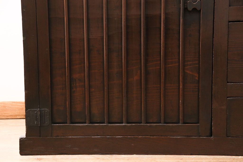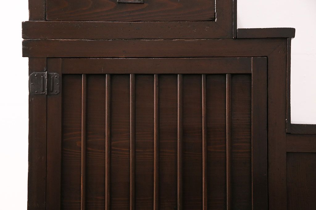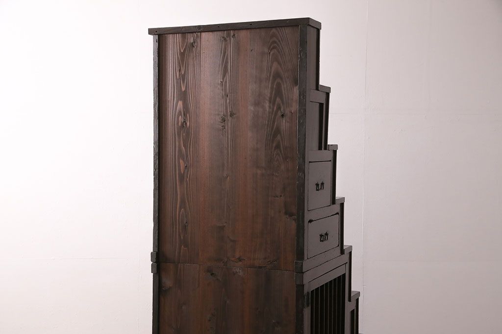 明治期の階段箪笥をリペア&カスタム!可動部の調整。背板など傷んだ箇所を張り替え。極めて黒に近い茶色に着色し仕上げ。(収納棚、時代箪笥、和タンス)