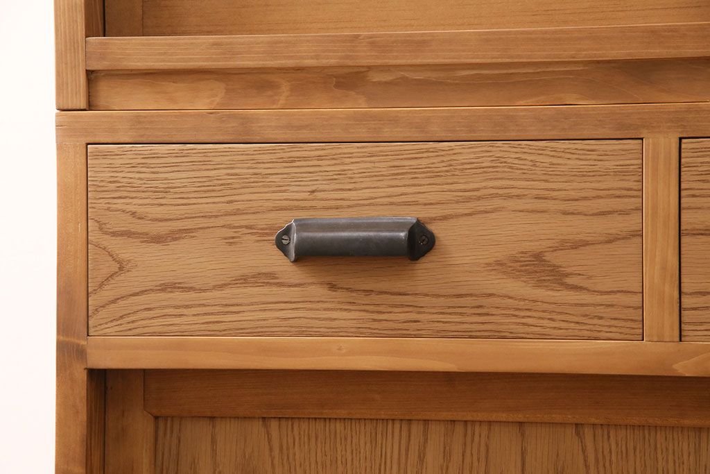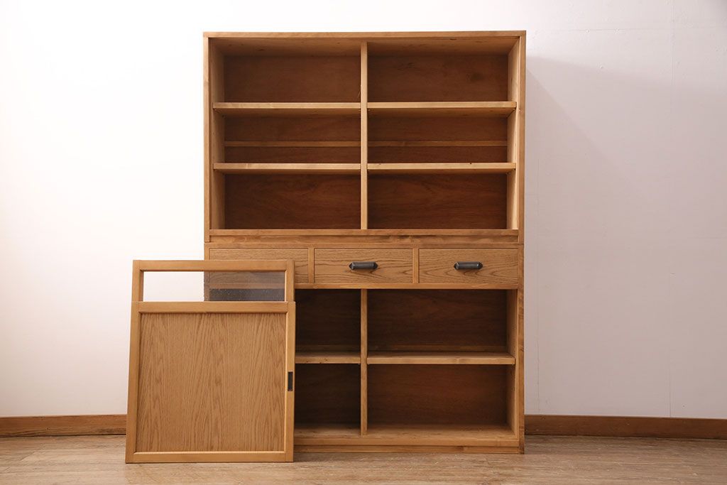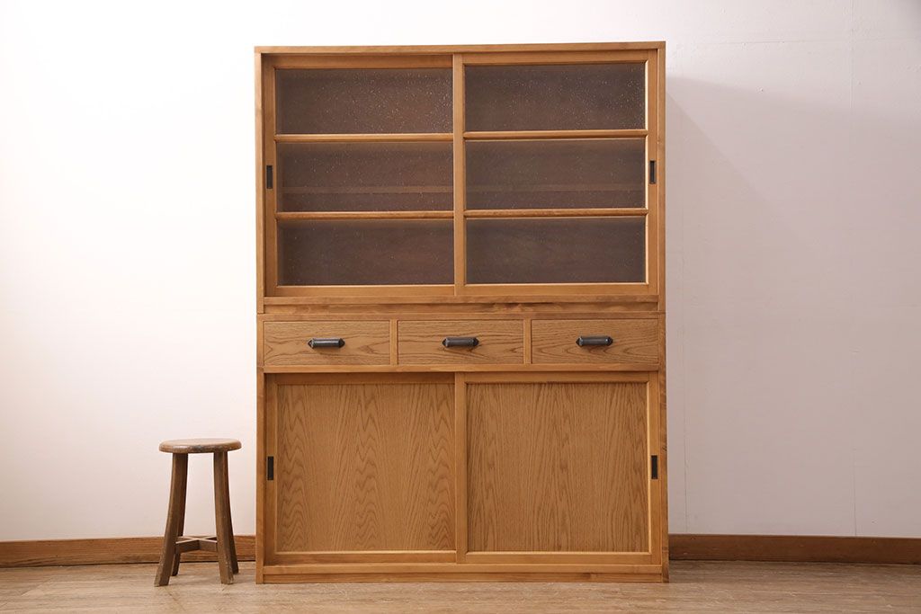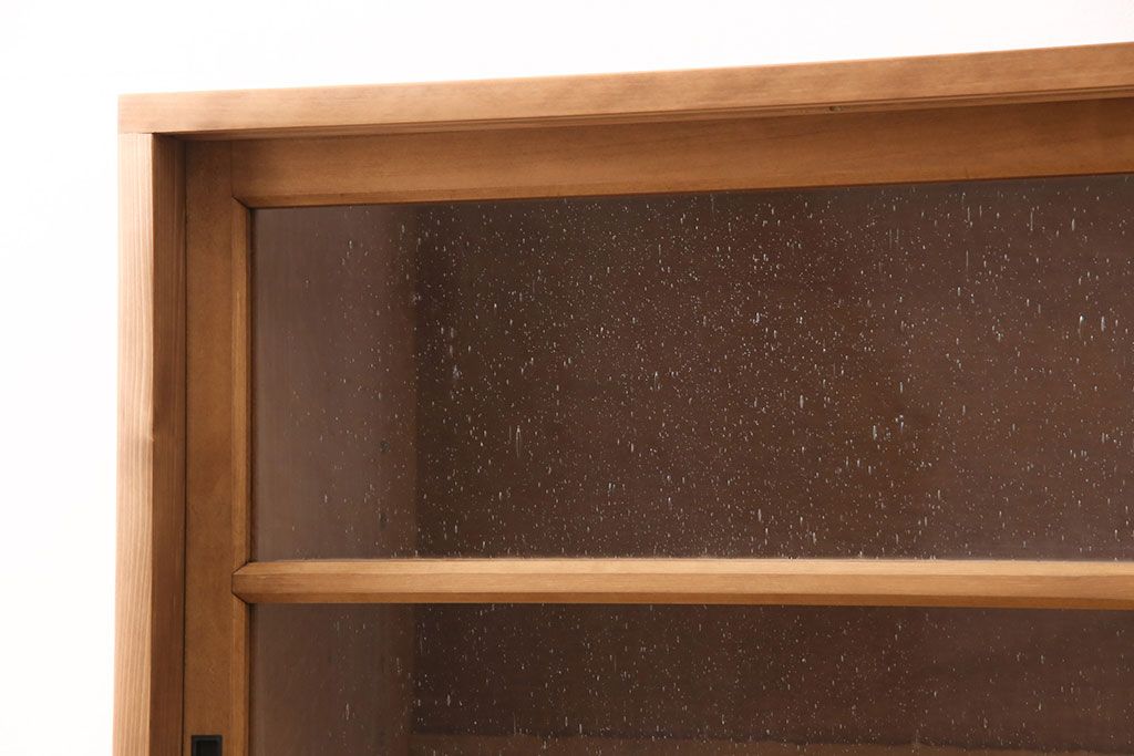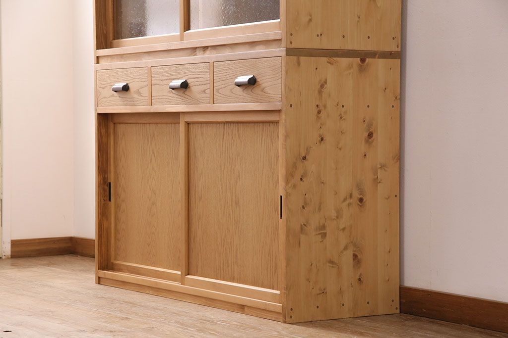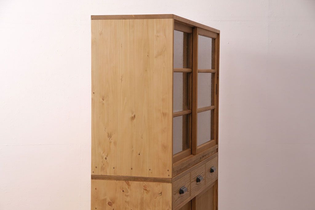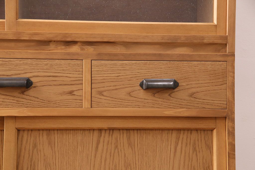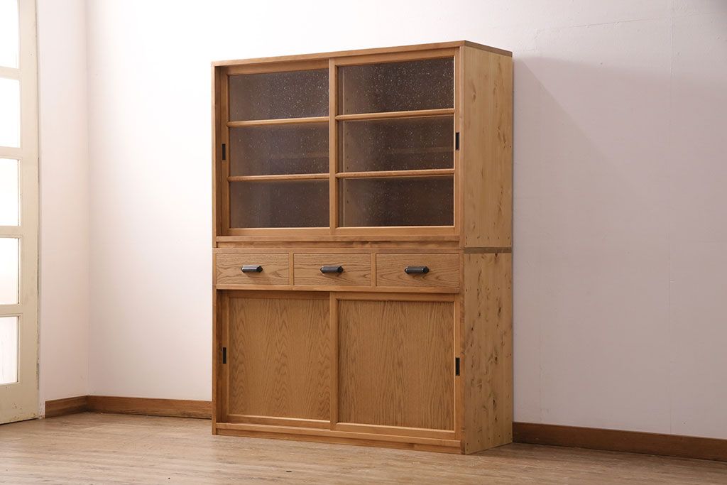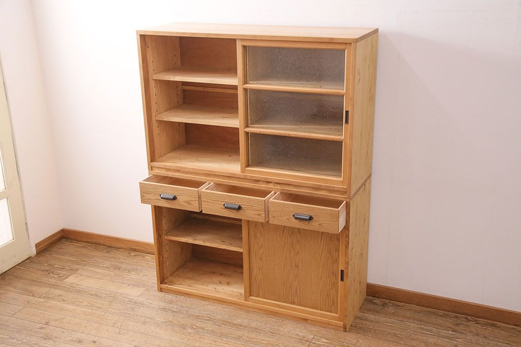 食器棚を新規製作!建具は上段に気泡ガラスを組み入れ、下段は板戸で製作。棚板は可動式、引き出し金具は黒染めのかぶせ金具を取り付け。ワックス仕上げ。(収納棚、戸棚、キャビネット)