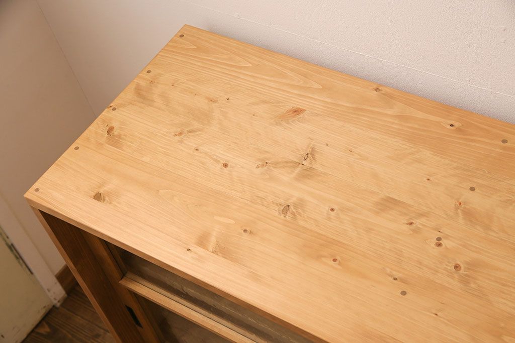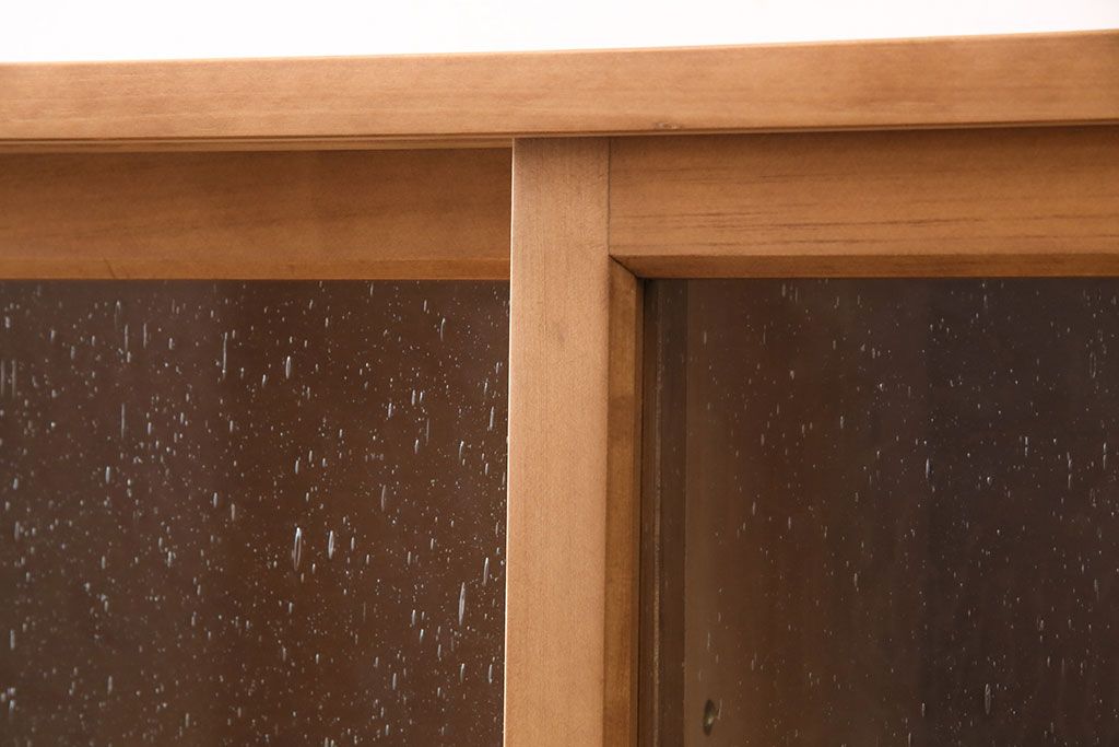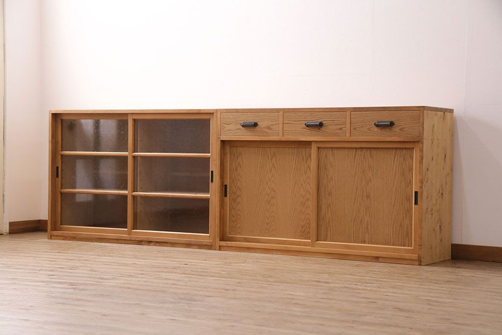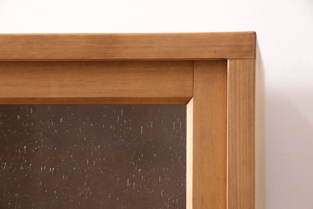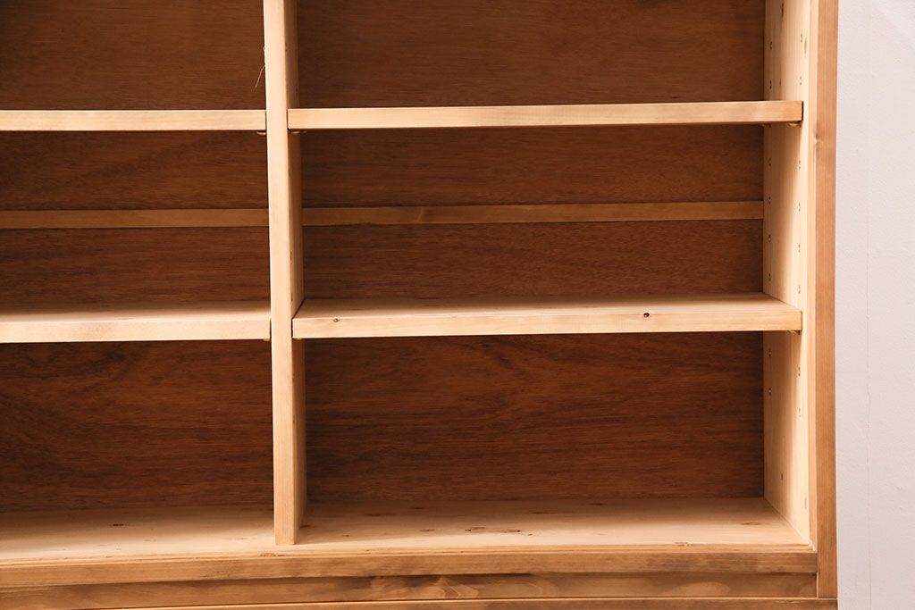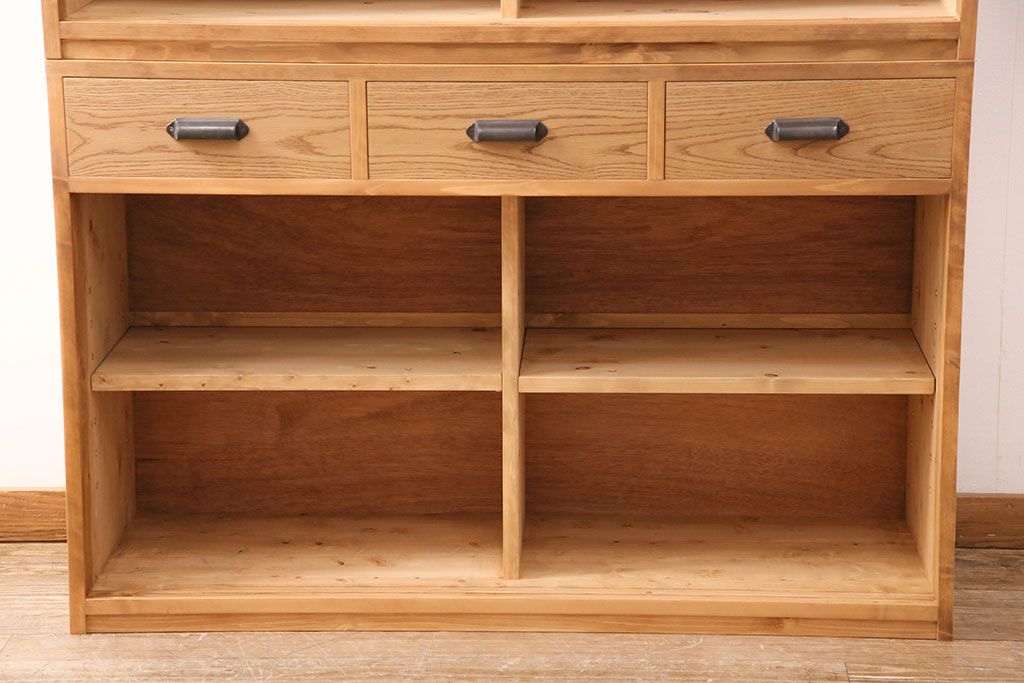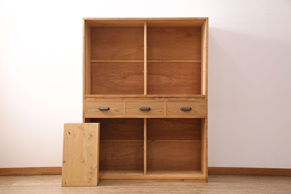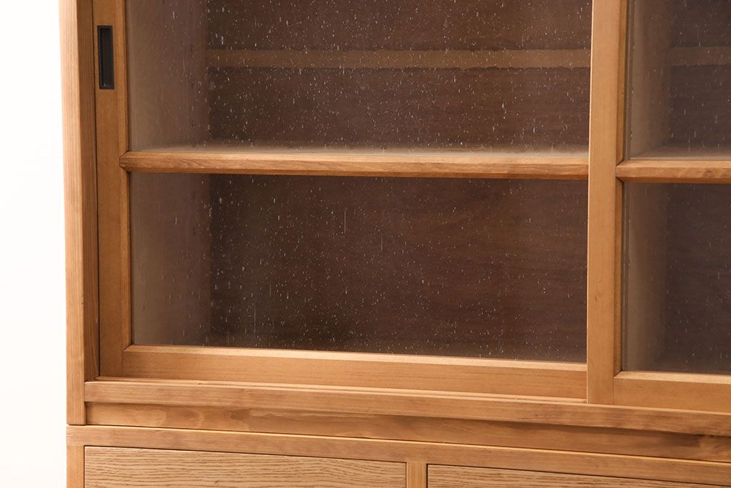 食器棚を新規製作!建具は上段に気泡ガラスを組み入れ、下段は板戸で製作。棚板は可動式、引き出し金具は黒染めのかぶせ金具を取り付け。ワックス仕上げ。(収納棚、戸棚、キャビネット)