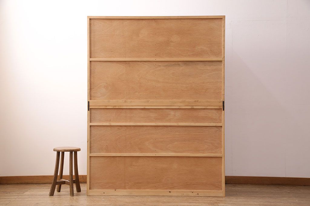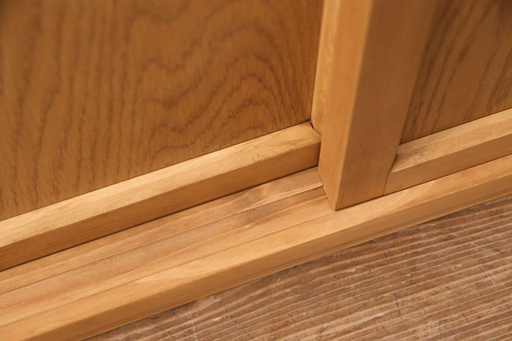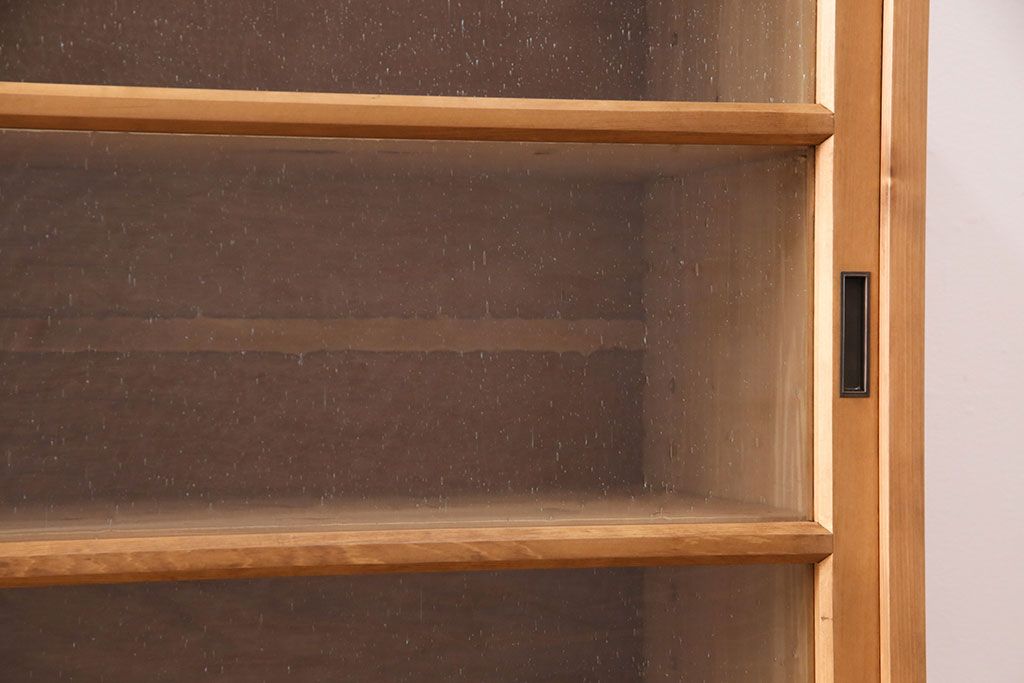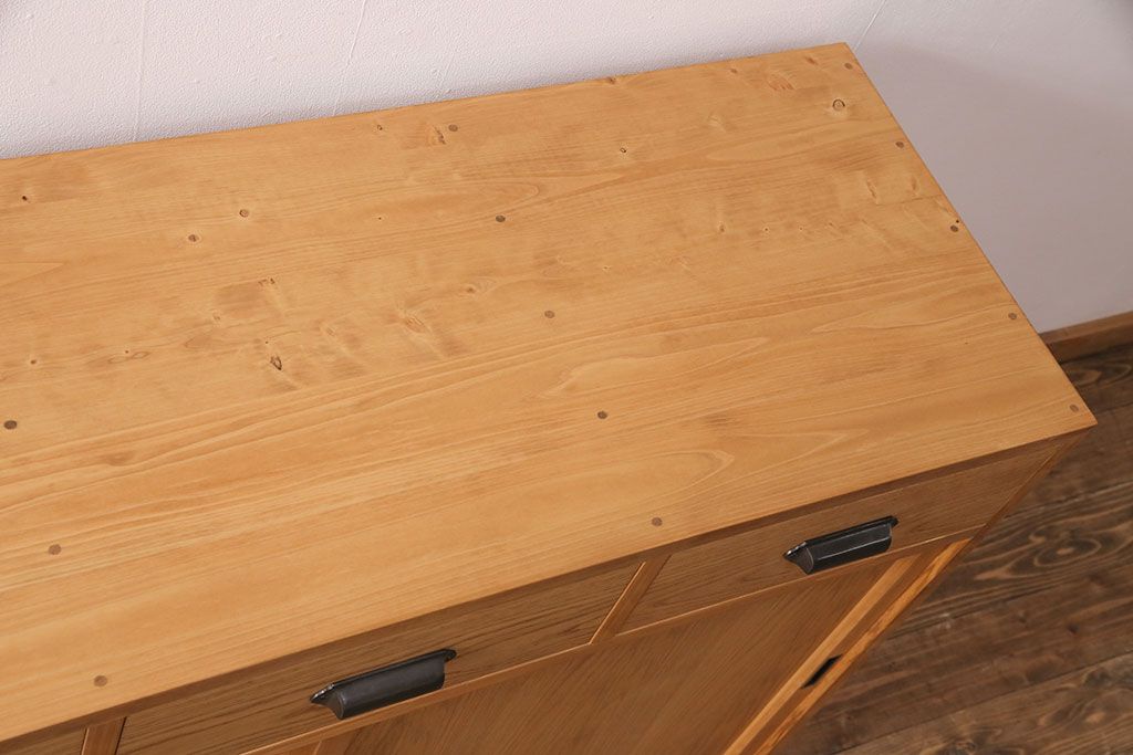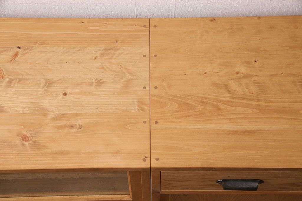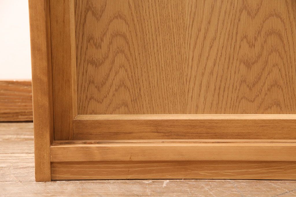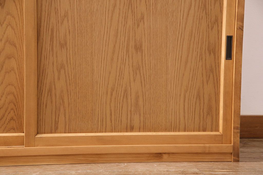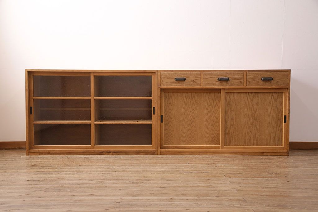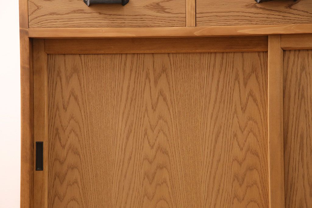 食器棚を新規製作!建具は上段に気泡ガラスを組み入れ、下段は板戸で製作。棚板は可動式、引き出し金具は黒染めのかぶせ金具を取り付け。ワックス仕上げ。(収納棚、戸棚、キャビネット)